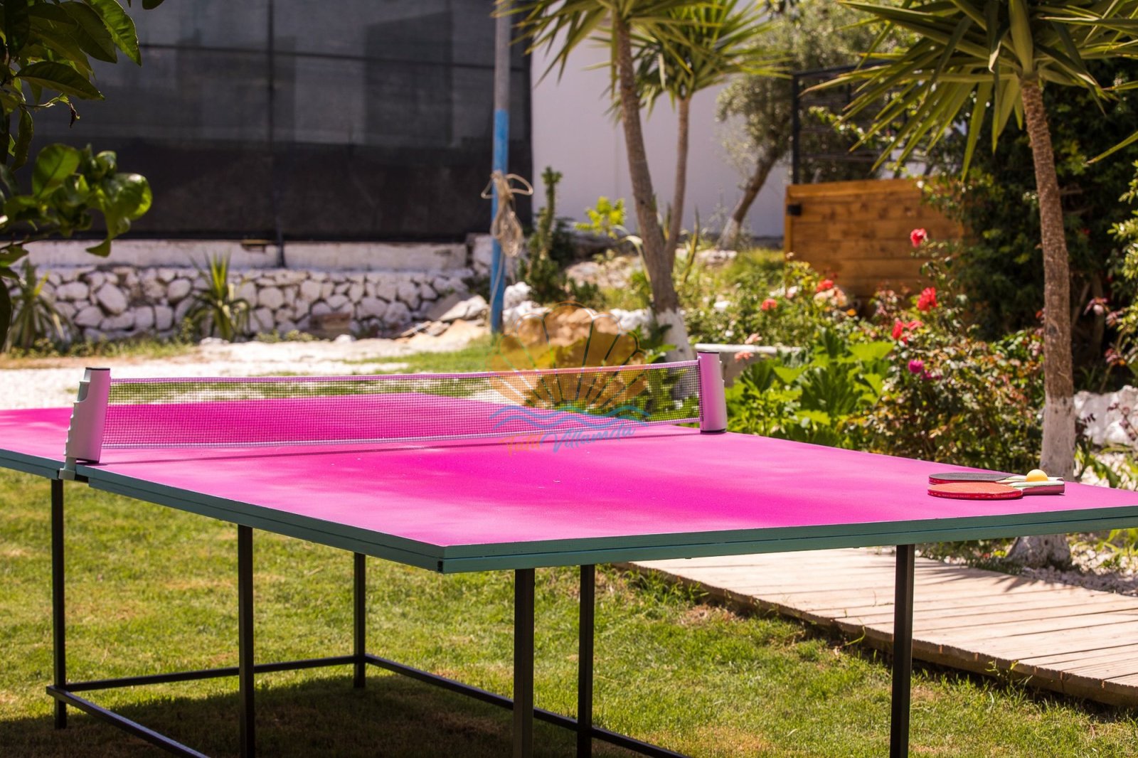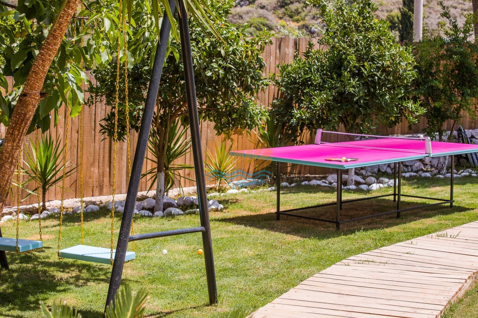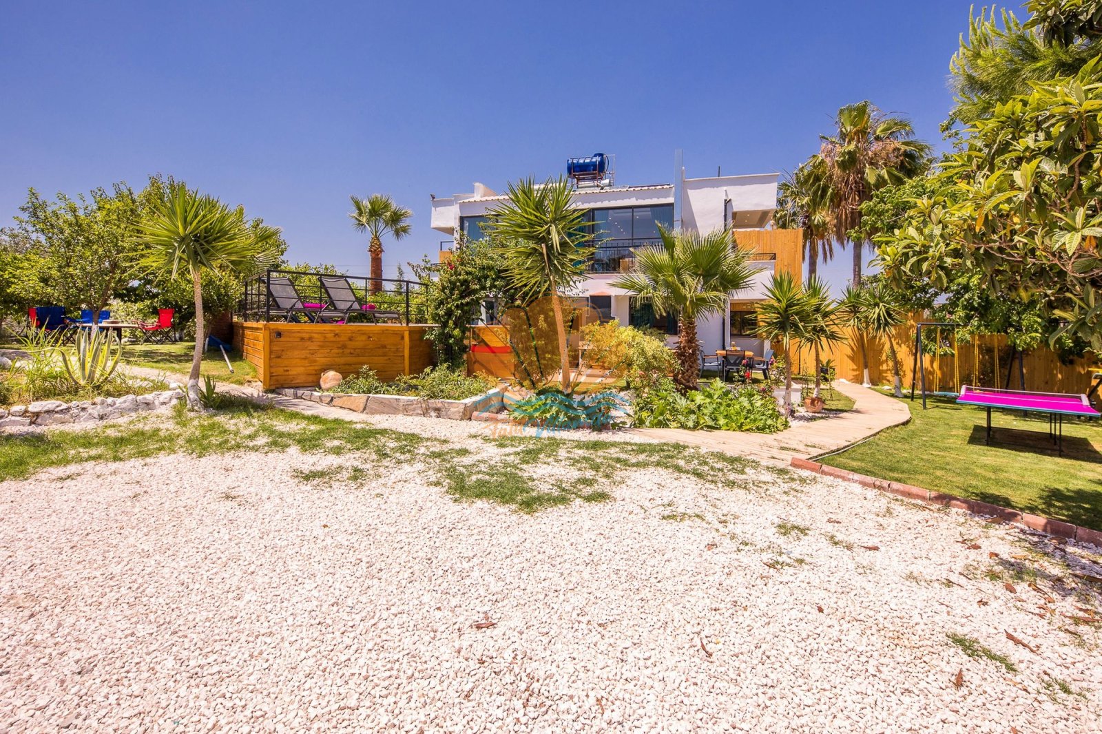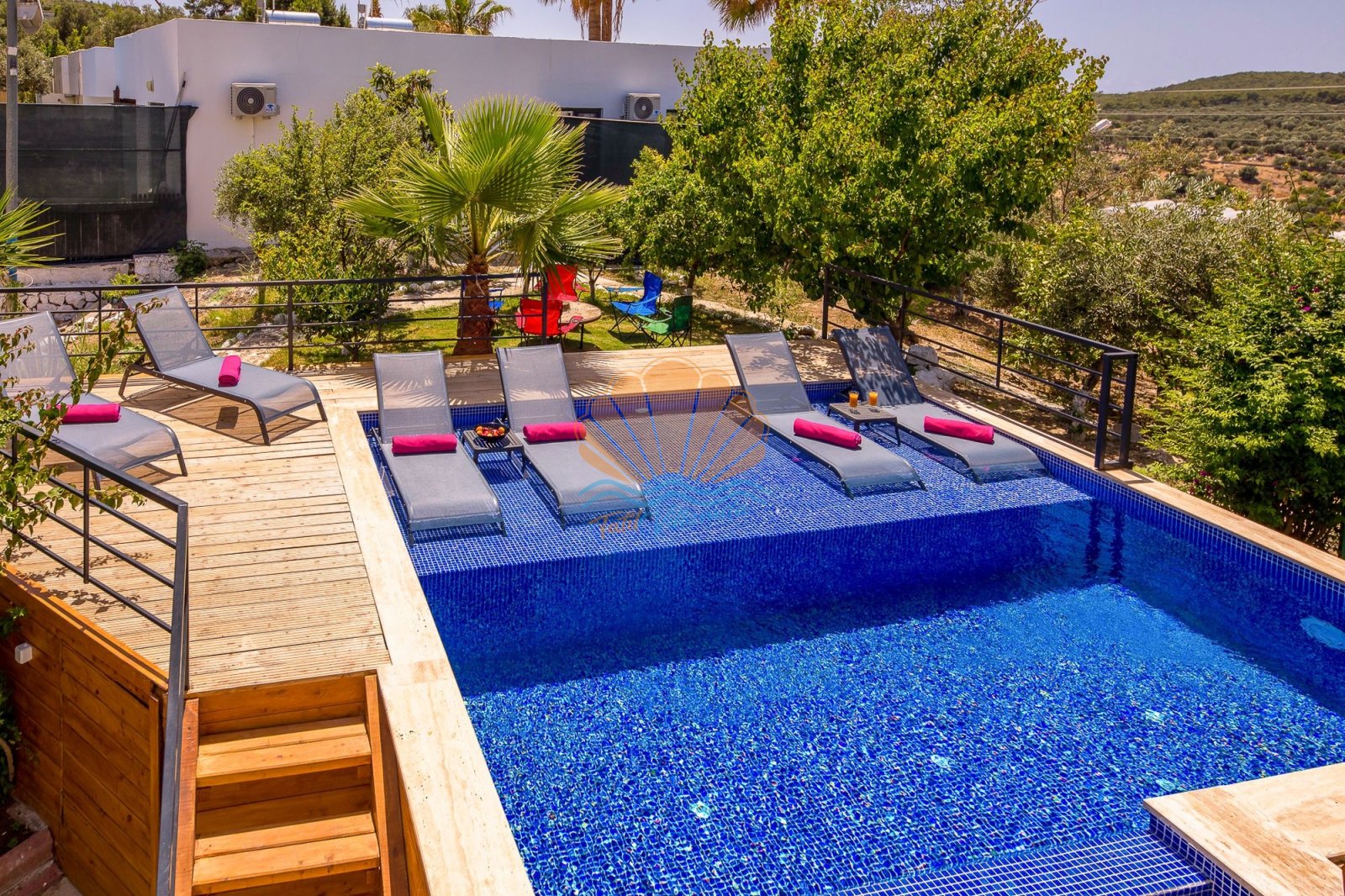 Dış alanda bulunan özel yüzme havuzu, şezlong ve şemsiye alanı gün boyu güneşin tadını çıkarma imkânı sunarken; bahçe kısmında yer alan barbekü, masa takımı ve salıncak alanı keyifli akşam yemekleri ve dinlenme anları için idealdir. Ayrıca masa tenisi ve dart gibi aktiviteler, tatilinize eğlenceli anlar katmaktadır.