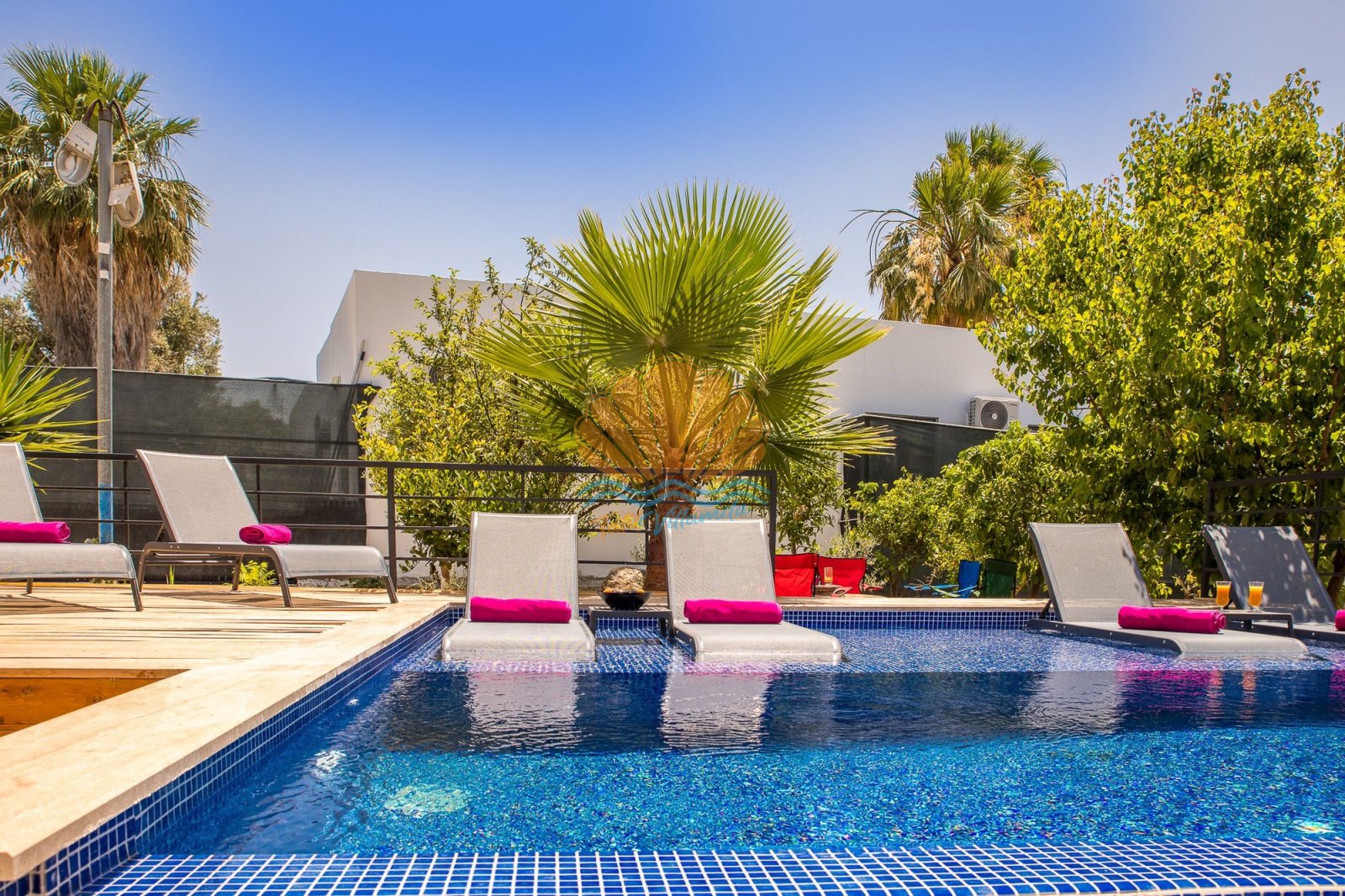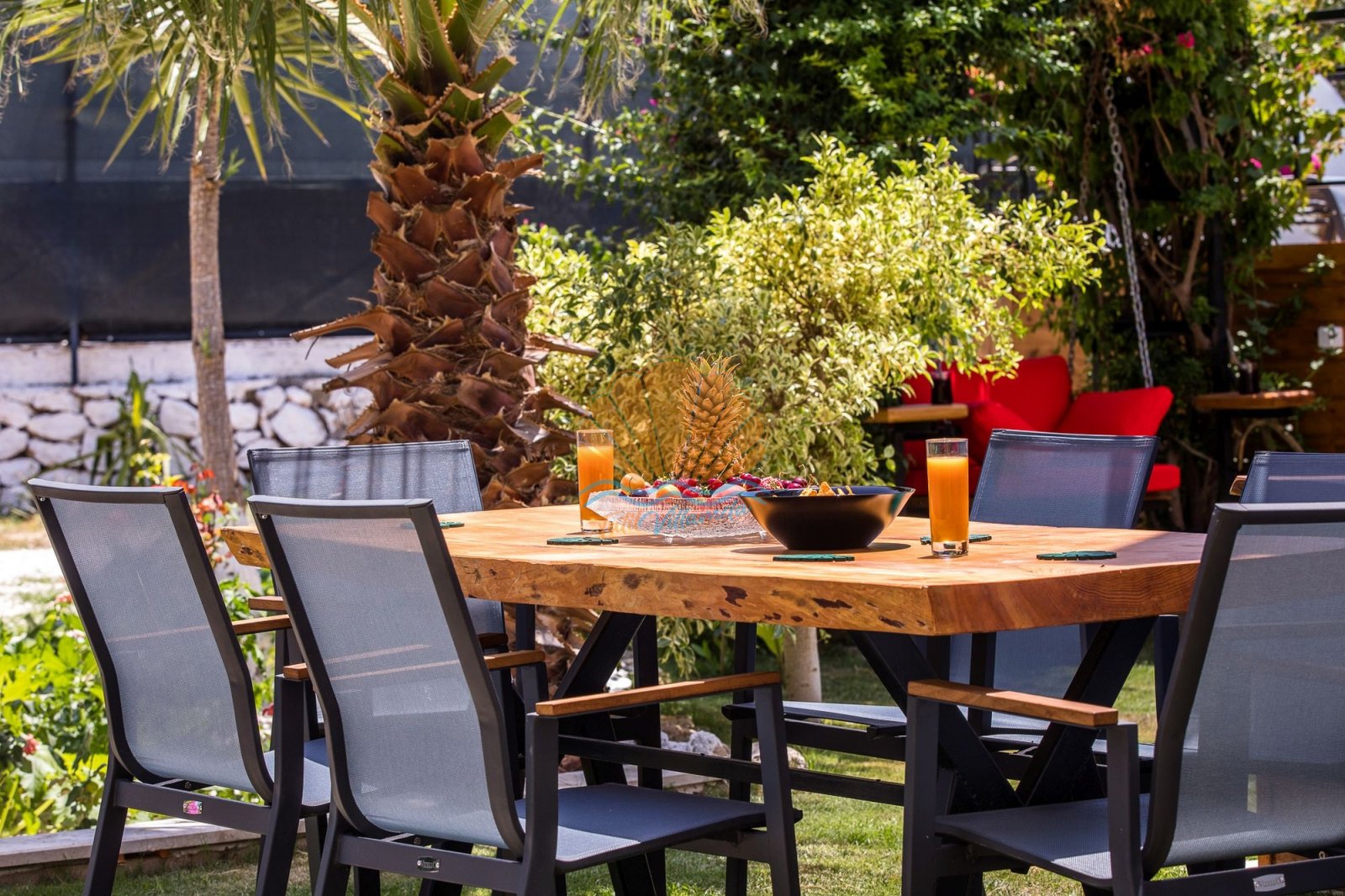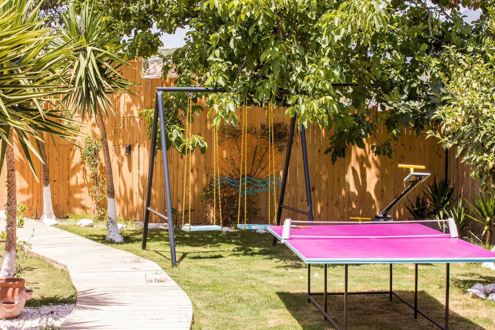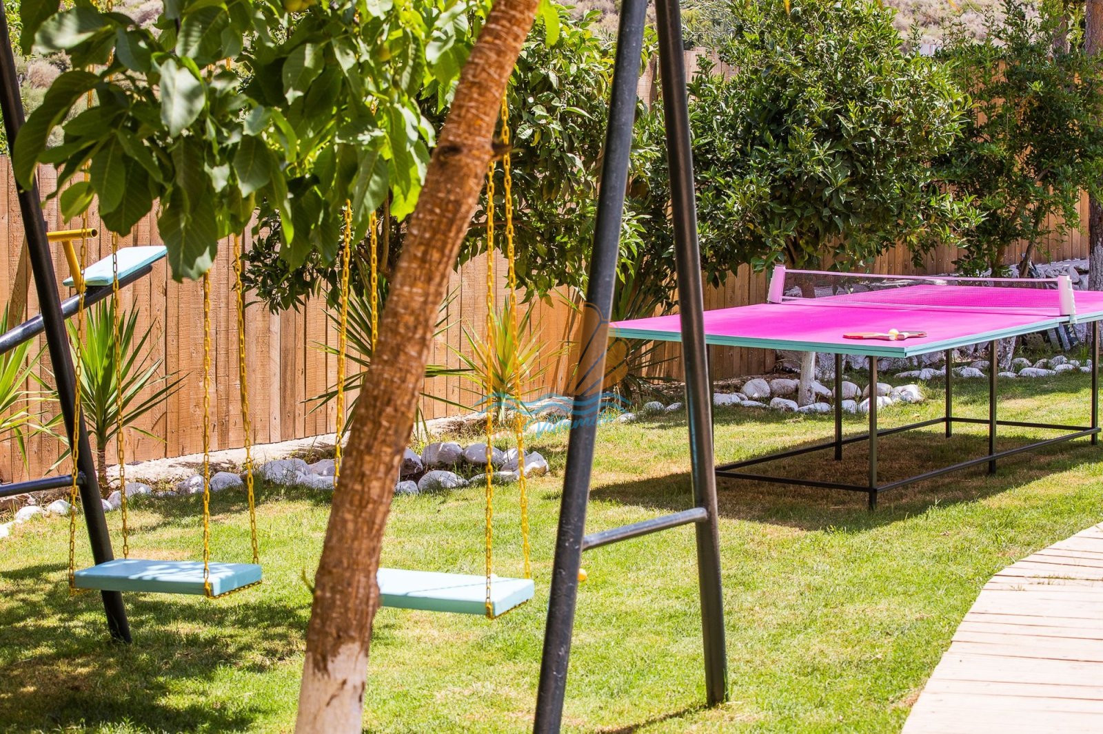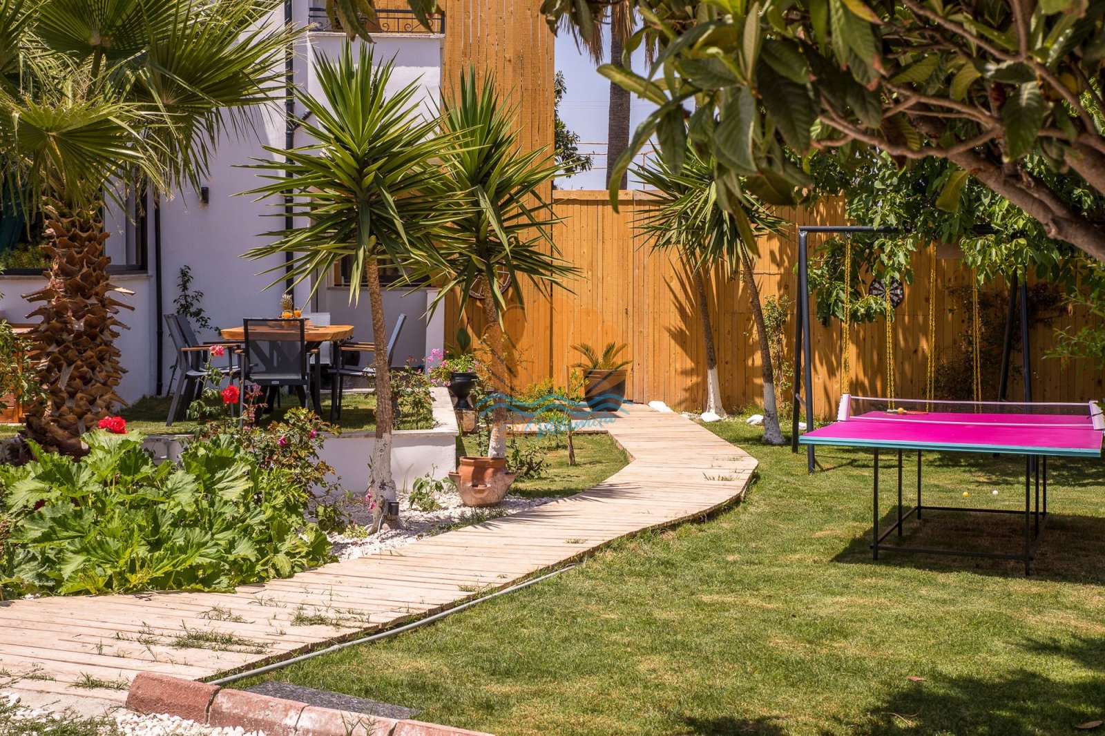 Dış alanda bulunan özel yüzme havuzu, şezlong ve şemsiye alanı gün boyu güneşin tadını çıkarma imkânı sunarken; bahçe kısmında yer alan barbekü, masa takımı ve salıncak alanı keyifli akşam yemekleri ve dinlenme anları için idealdir. Ayrıca masa tenisi ve dart gibi aktiviteler, tatilinize eğlenceli anlar katmaktadır.