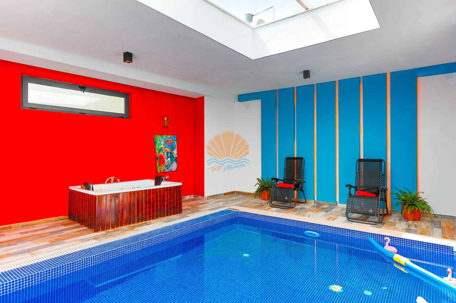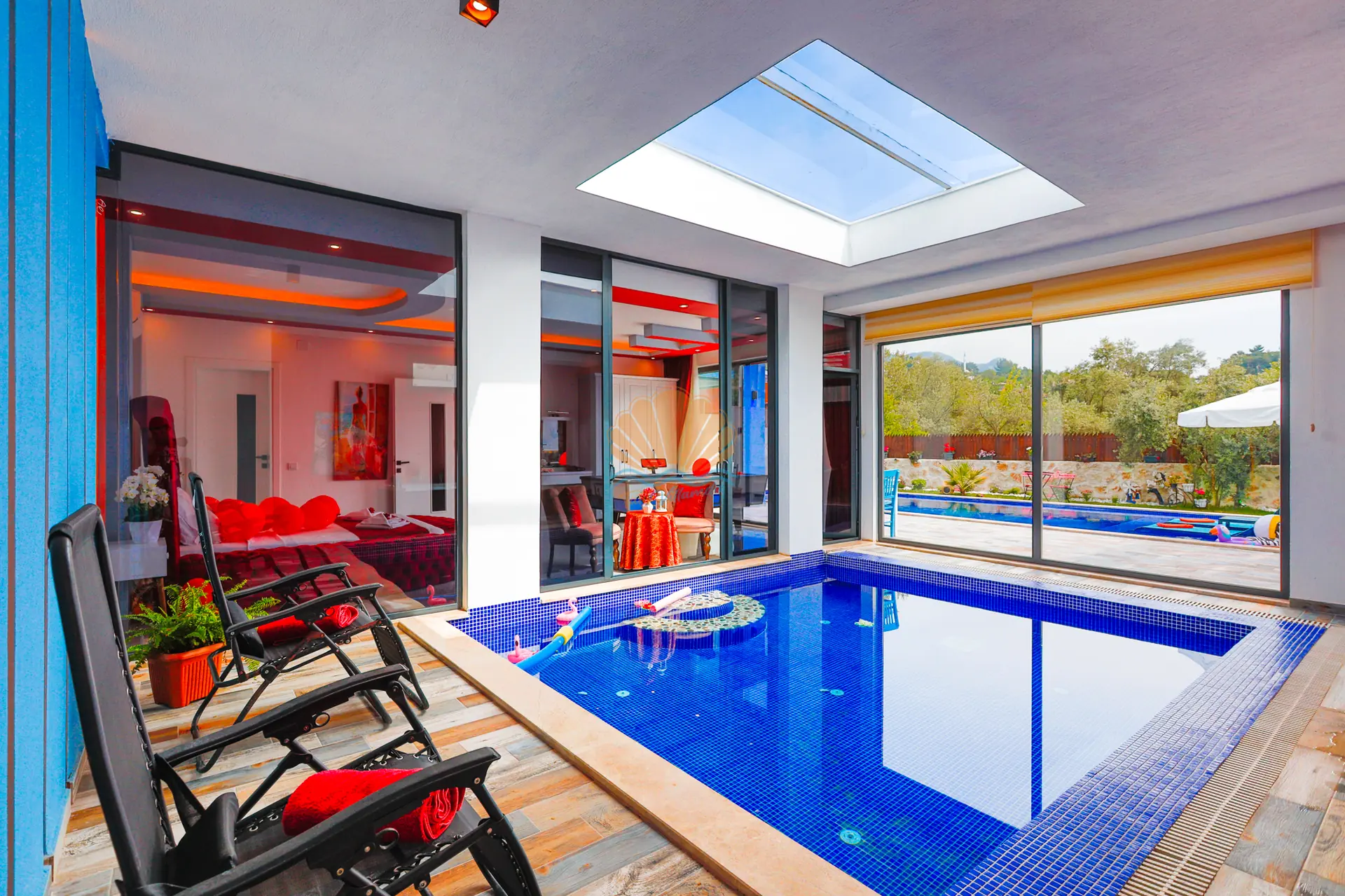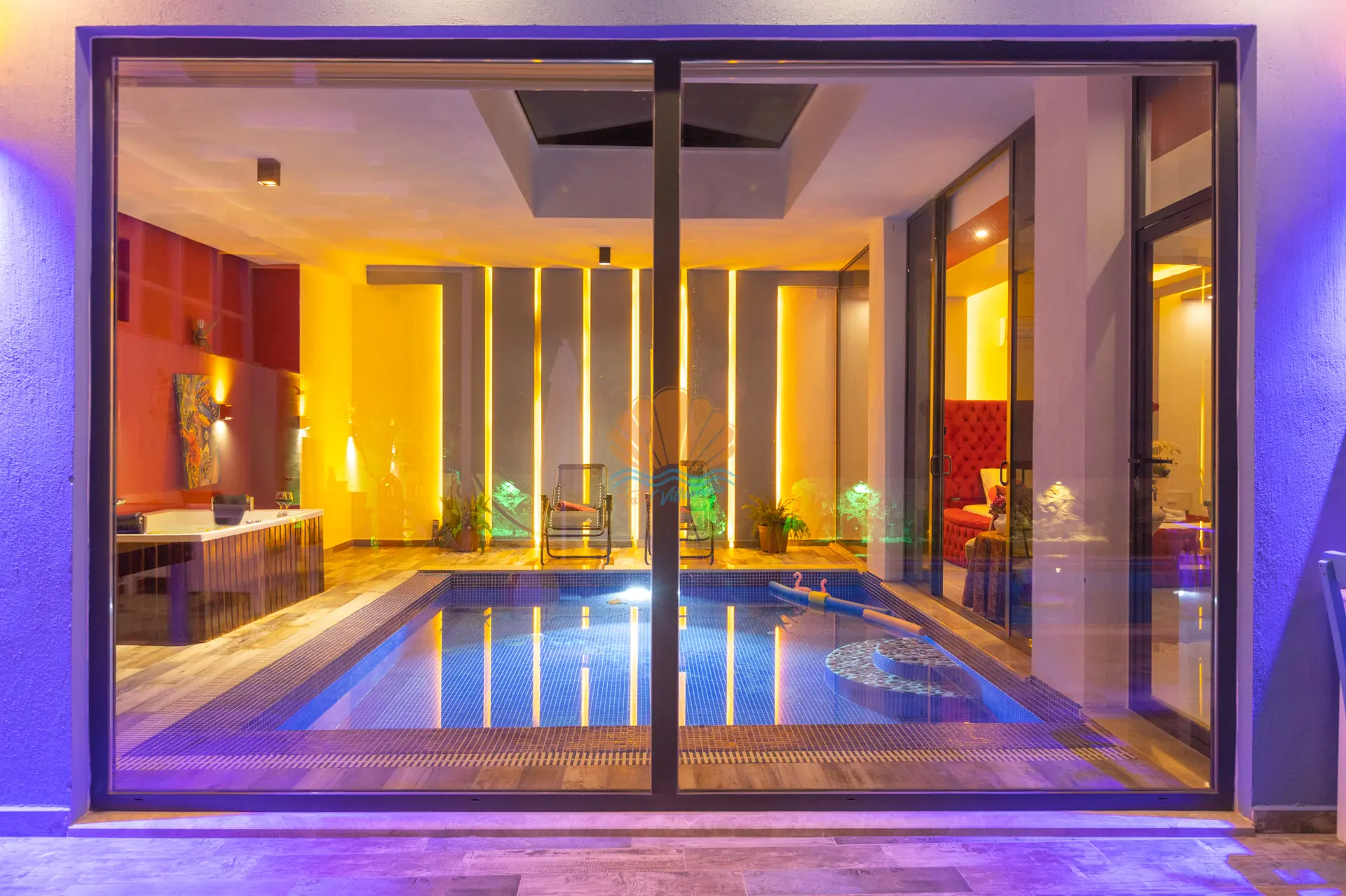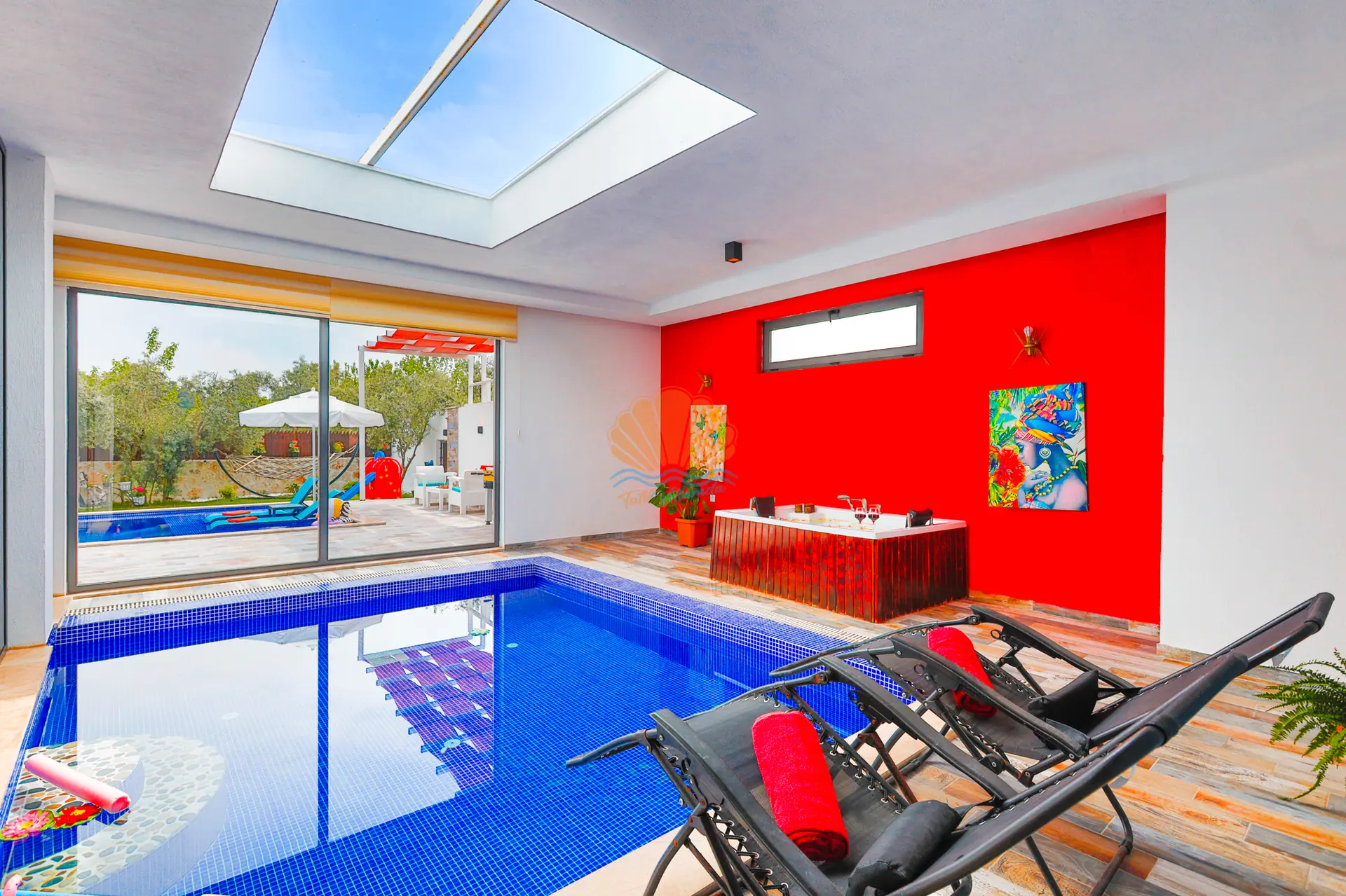 Villanın en dikkat çekici özelliklerinden biri geniş ve tamamen korunaklı özel yüzme havuzudur. Dış havuzun yanı sıra dört mevsim kullanıma uygun kapalı ve ısıtmalı iç havuz da bulunmaktadır. Bu sayede yaz-kış konforlu bir tatil deneyimi yaşanabilir. Ayrıca jakuzisi ile günün yorgunluğunu keyifle atabilir, romantik anlarınızı daha da özel hale getirebilirsiniz.