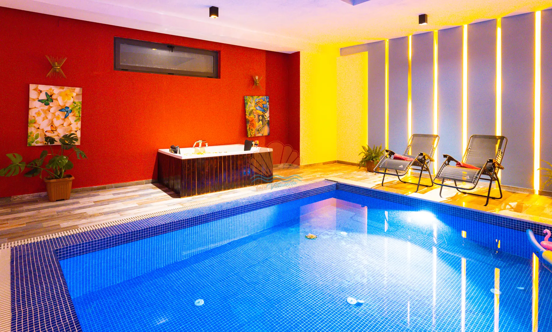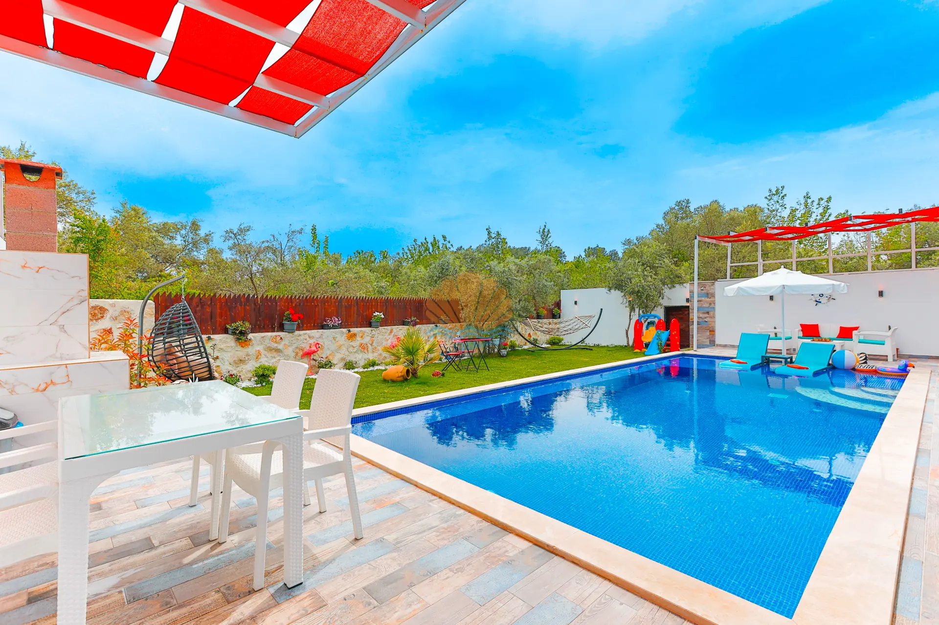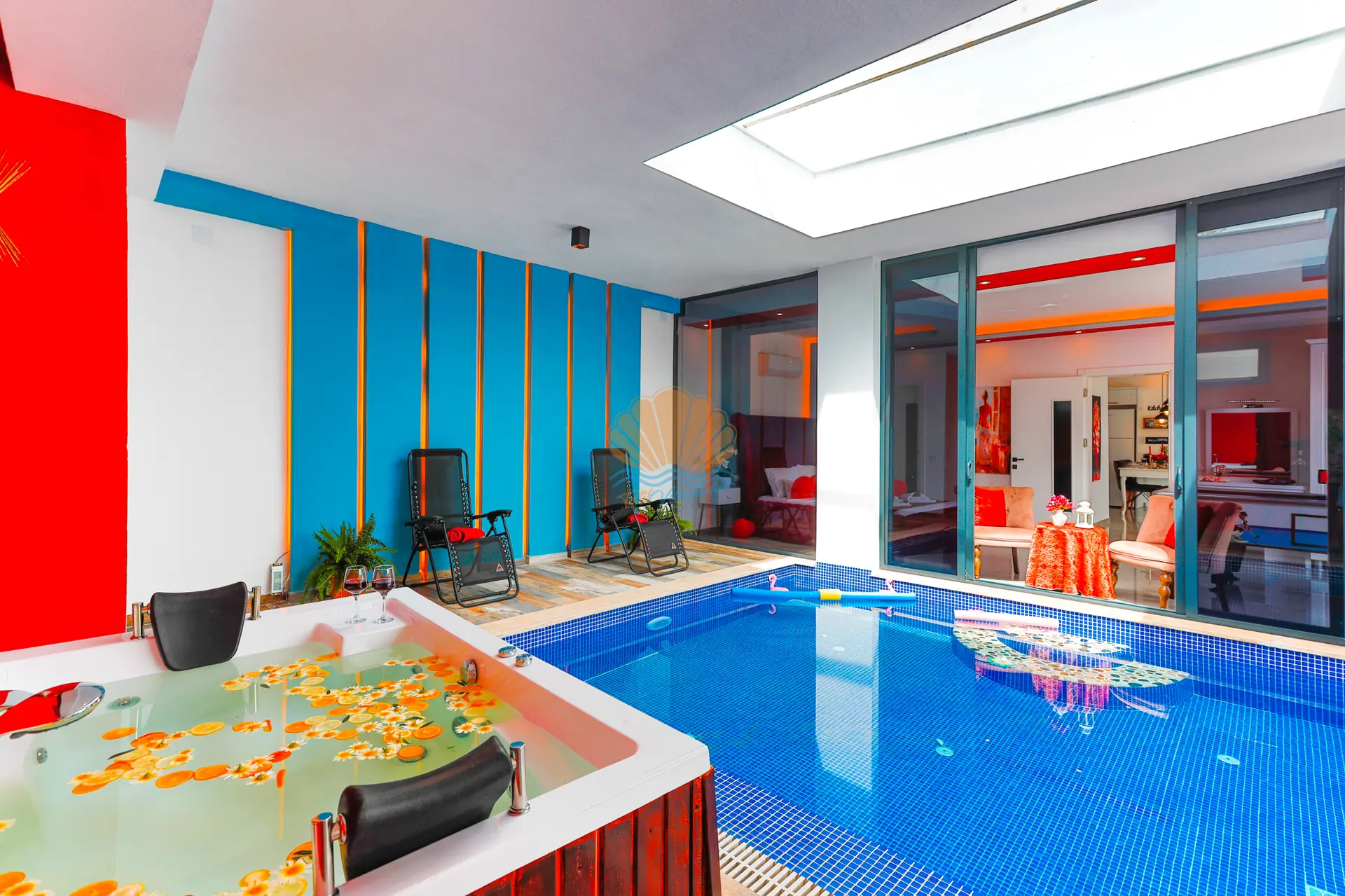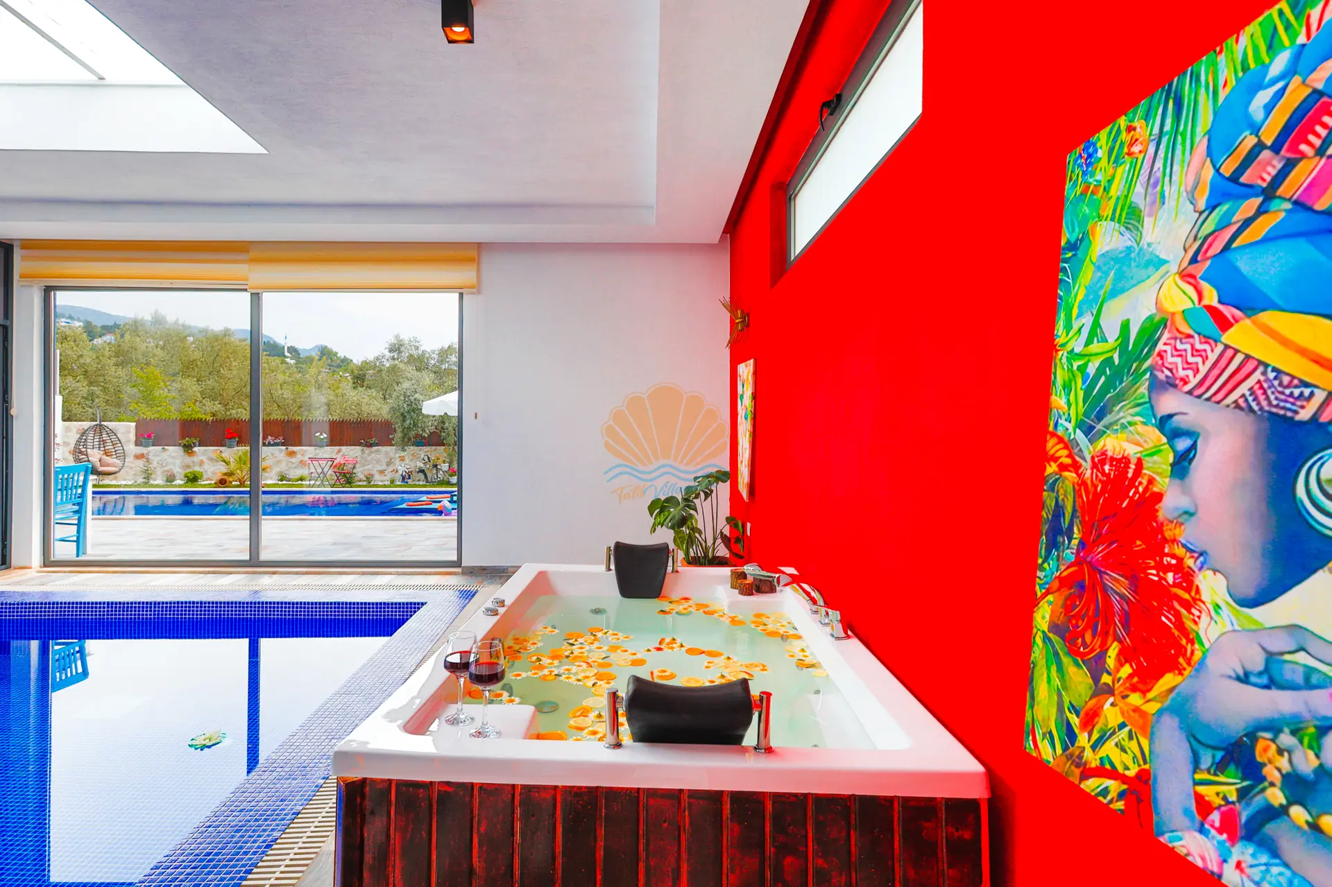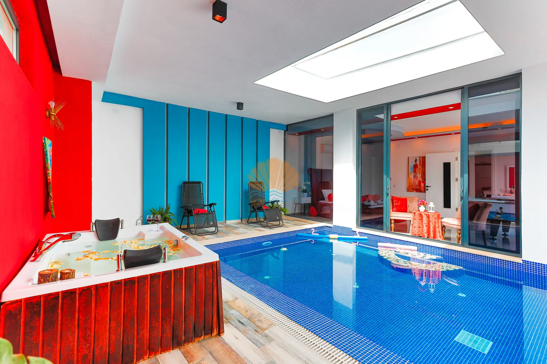 Villanın en dikkat çekici özelliklerinden biri geniş ve tamamen korunaklı özel yüzme havuzudur. Dış havuzun yanı sıra dört mevsim kullanıma uygun kapalı ve ısıtmalı iç havuz da bulunmaktadır. Bu sayede yaz-kış konforlu bir tatil deneyimi yaşanabilir. Ayrıca jakuzisi ile günün yorgunluğunu keyifle atabilir, romantik anlarınızı daha da özel hale getirebilirsiniz.