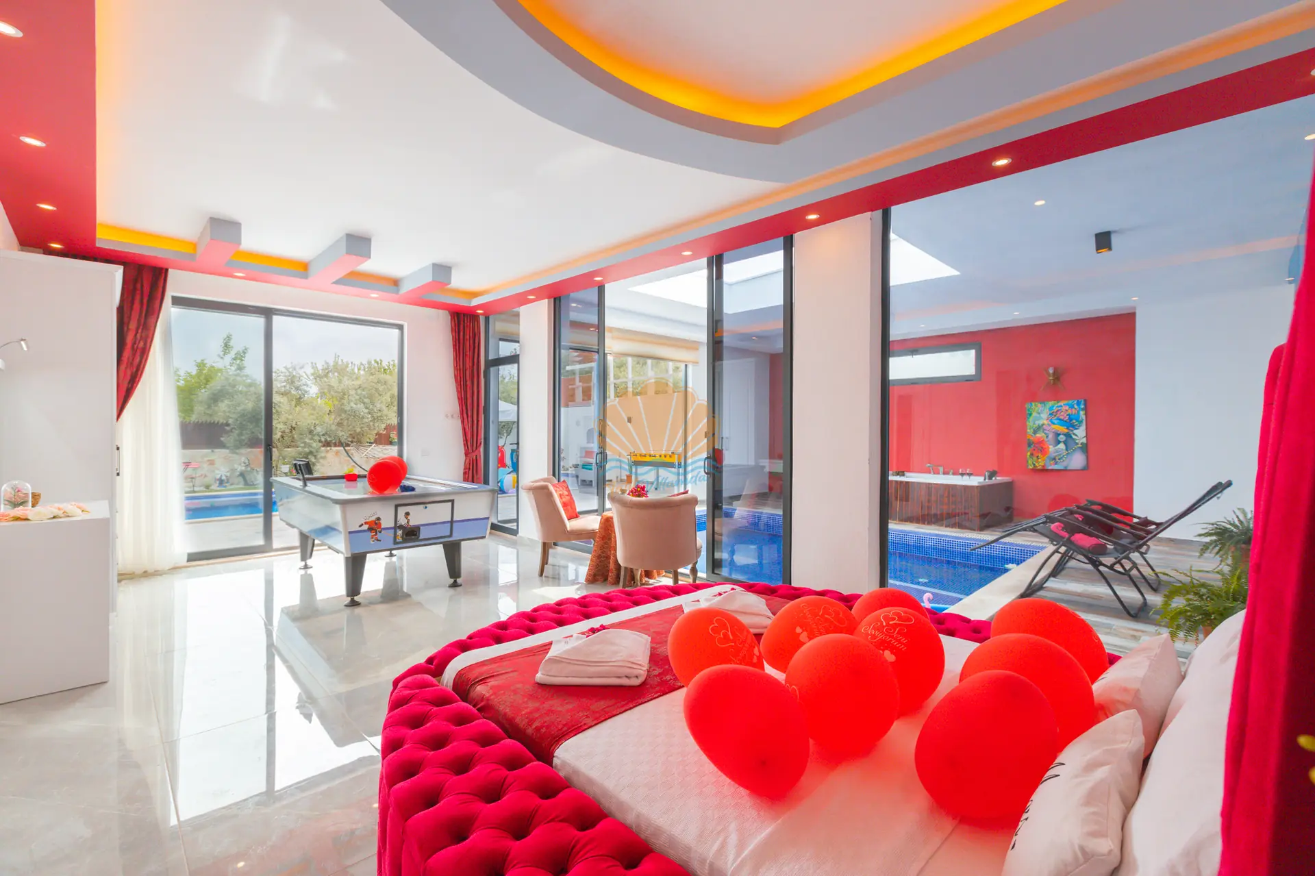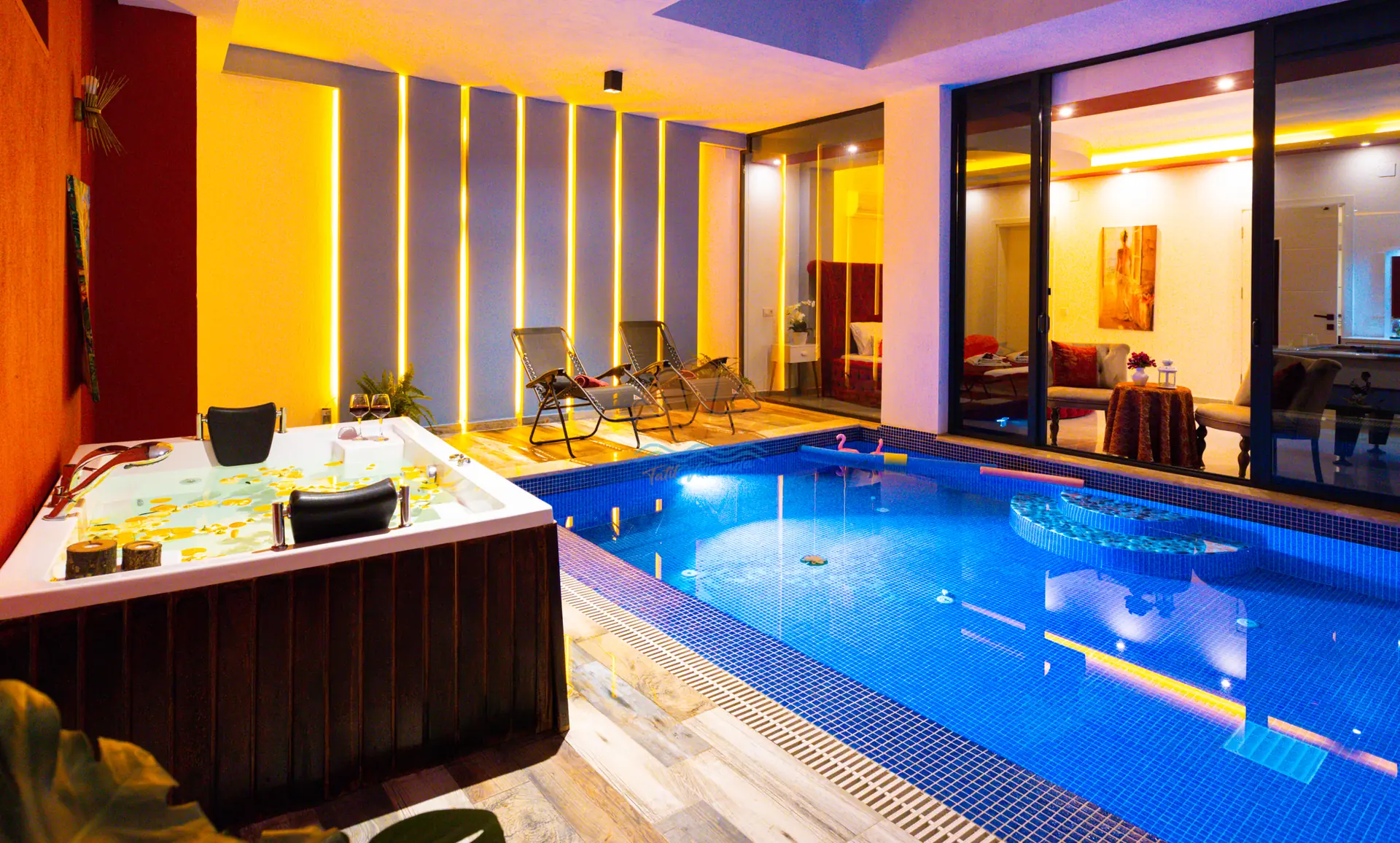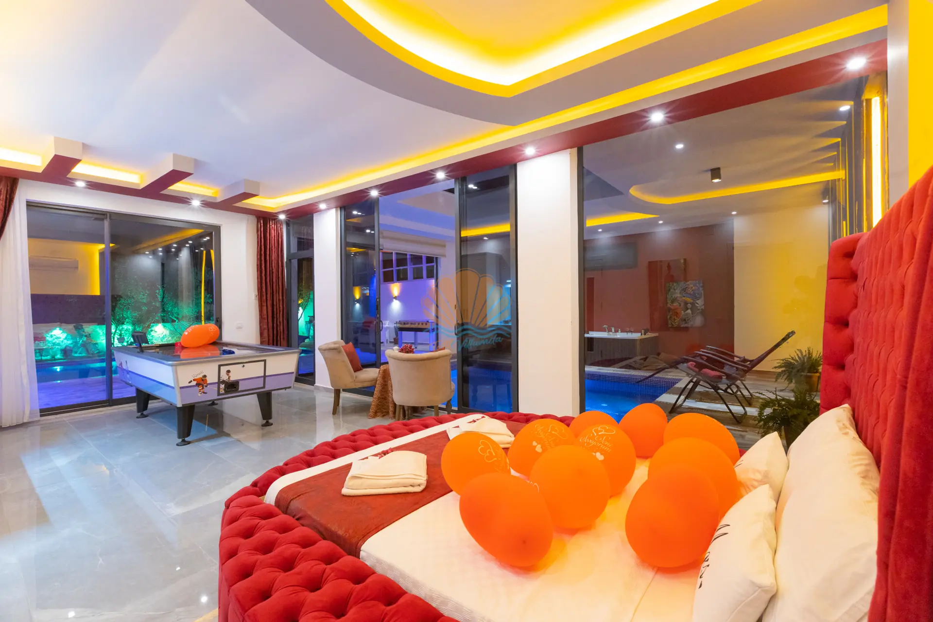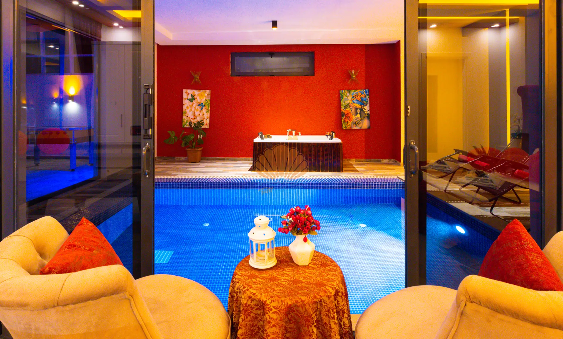 Villanın en dikkat çekici özelliklerinden biri geniş ve tamamen korunaklı özel yüzme havuzudur. Dış havuzun yanı sıra dört mevsim kullanıma uygun kapalı ve ısıtmalı iç havuz da bulunmaktadır. Bu sayede yaz-kış konforlu bir tatil deneyimi yaşanabilir. Ayrıca jakuzisi ile günün yorgunluğunu keyifle atabilir, romantik anlarınızı daha da özel hale getirebilirsiniz.