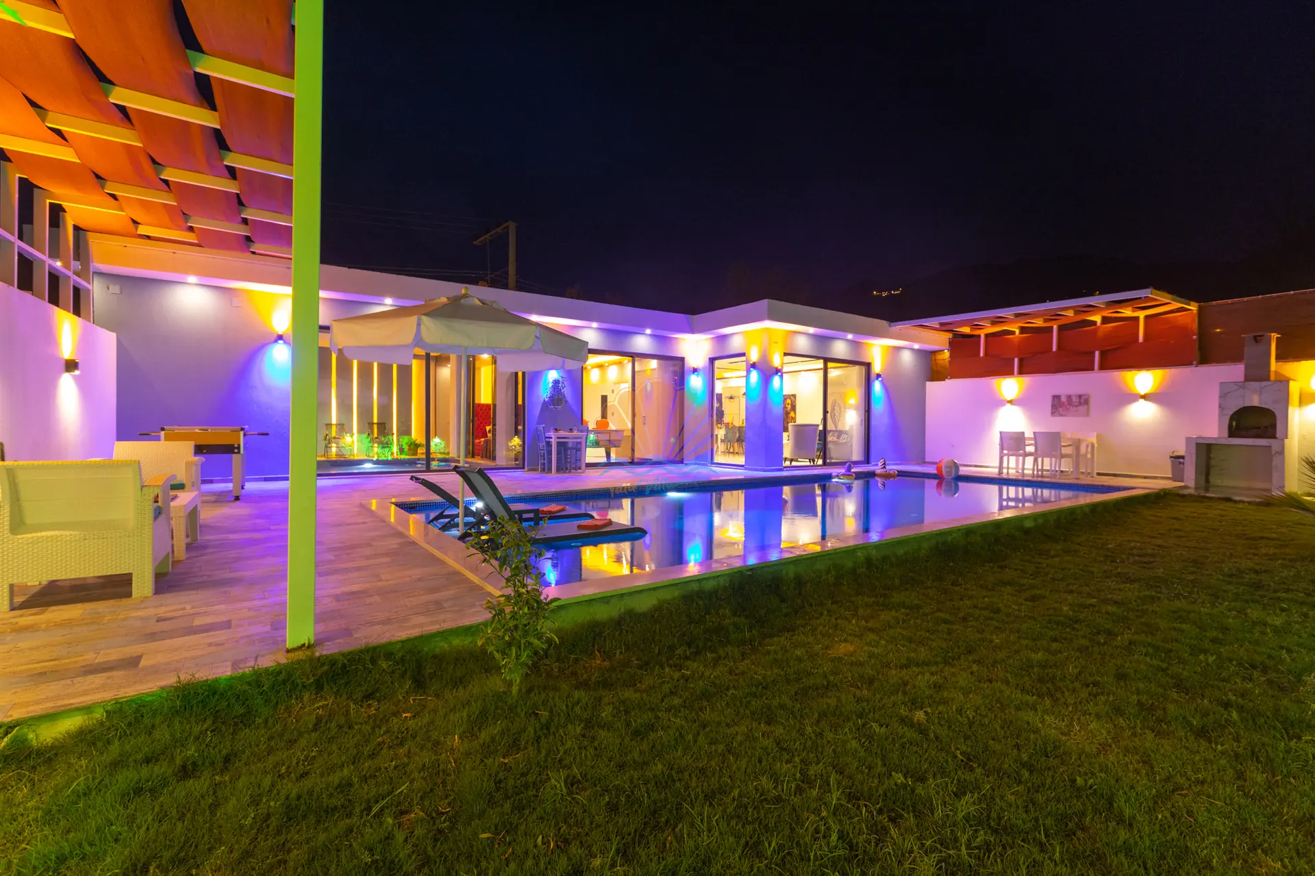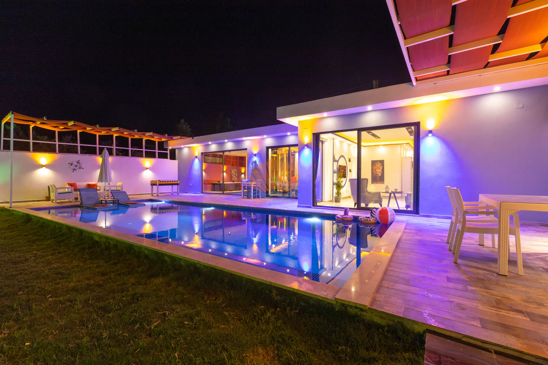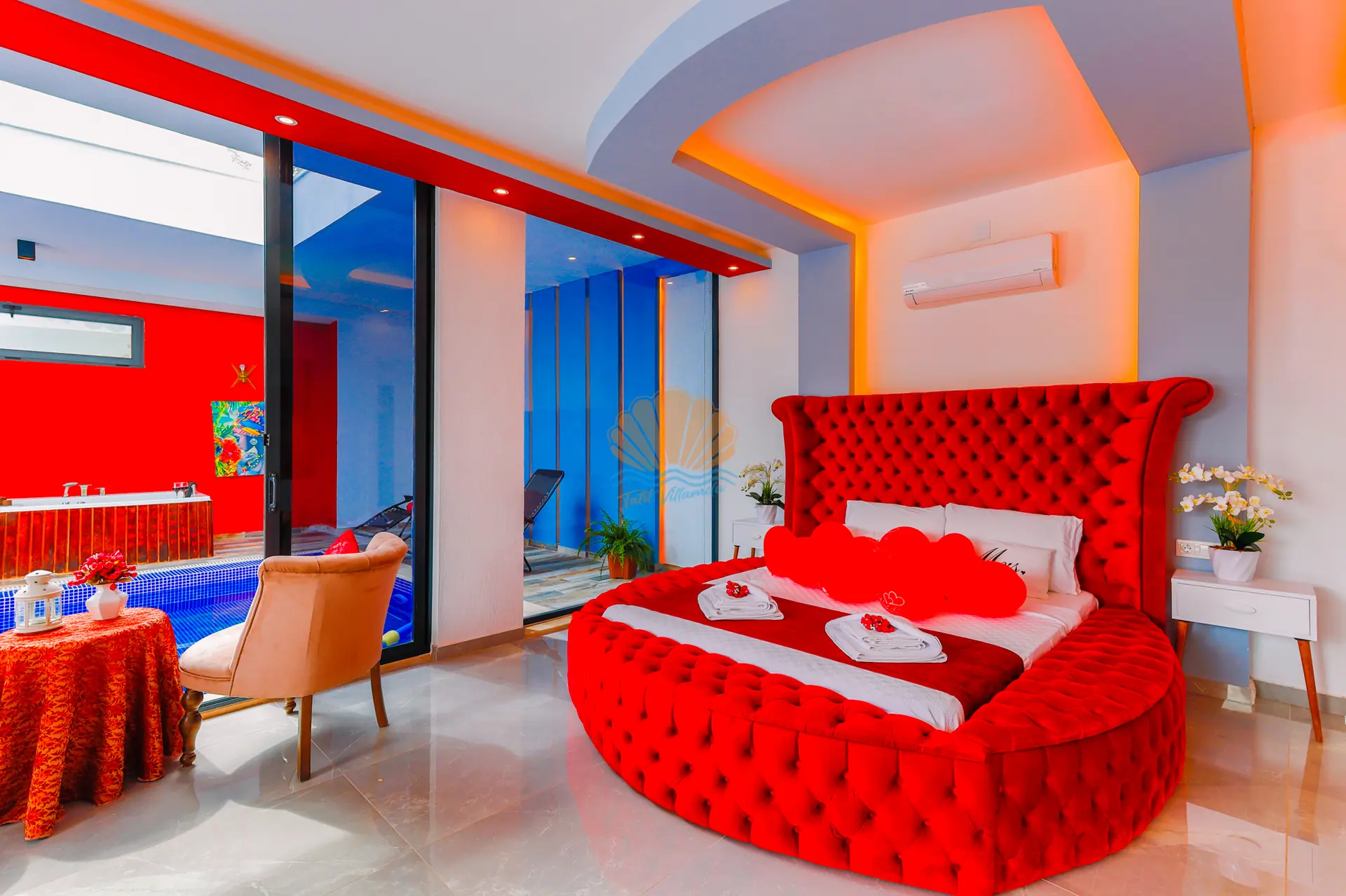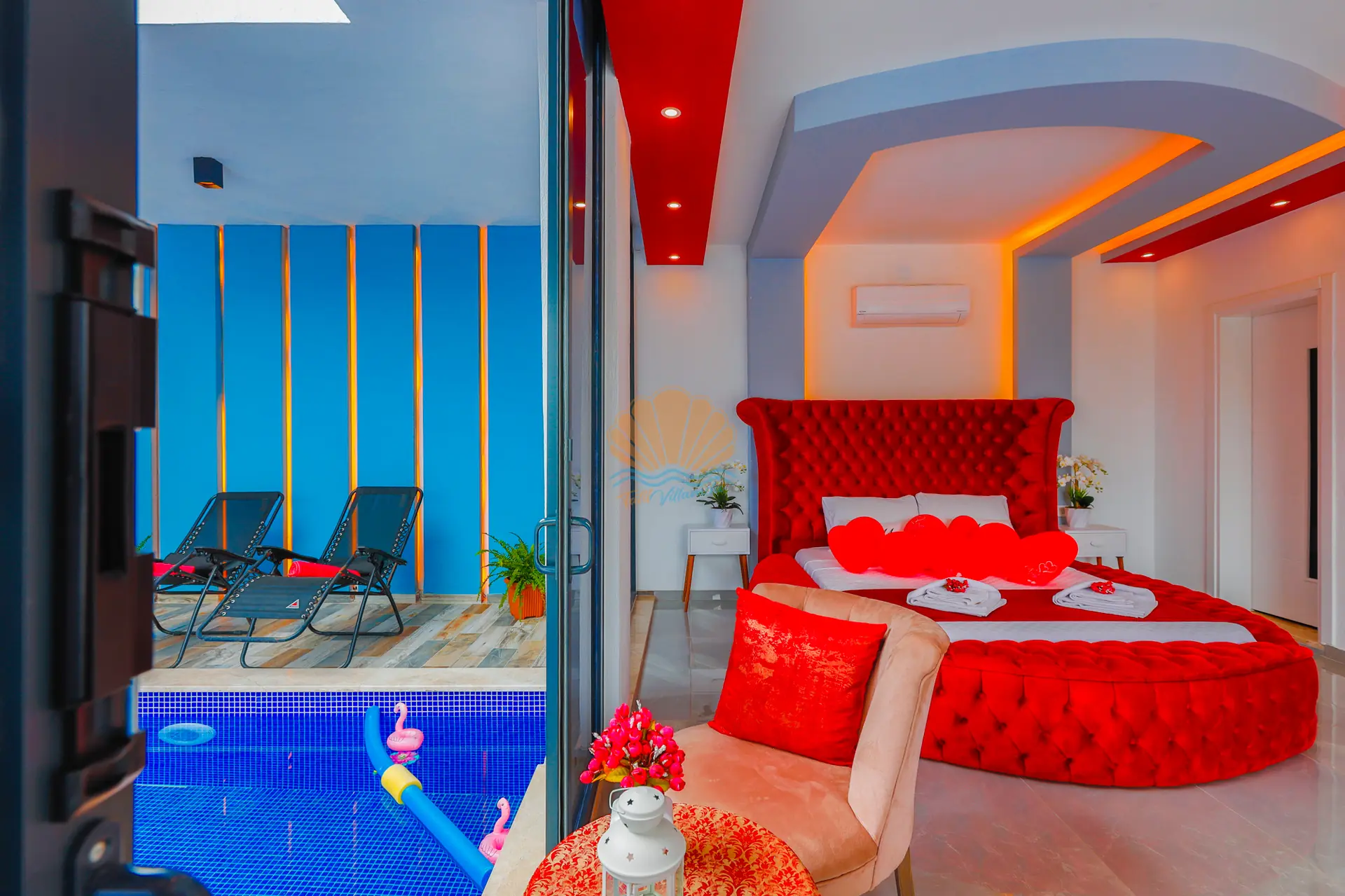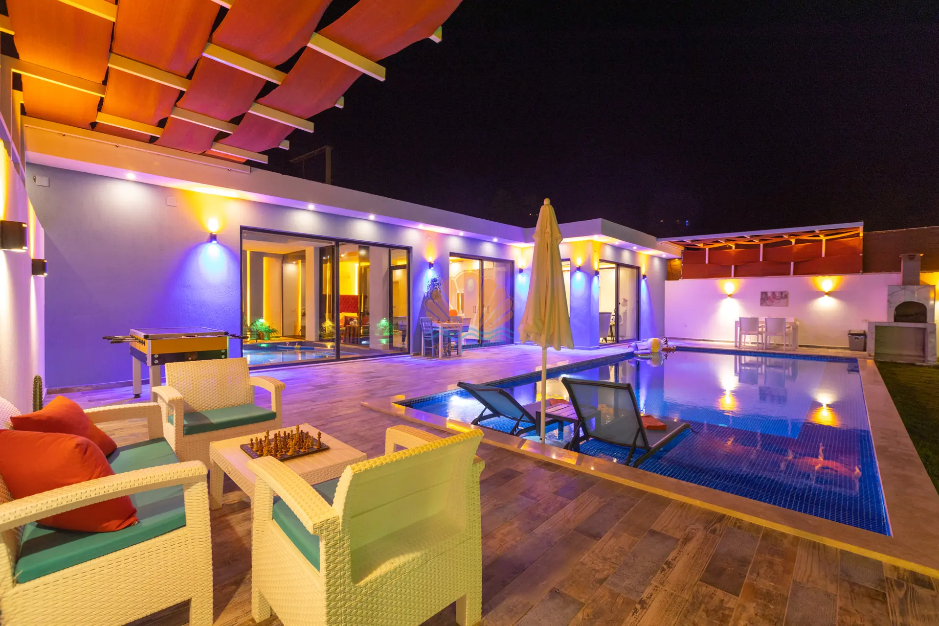 Villanın en dikkat çekici özelliklerinden biri geniş ve tamamen korunaklı özel yüzme havuzudur. Dış havuzun yanı sıra dört mevsim kullanıma uygun kapalı ve ısıtmalı iç havuz da bulunmaktadır. Bu sayede yaz-kış konforlu bir tatil deneyimi yaşanabilir. Ayrıca jakuzisi ile günün yorgunluğunu keyifle atabilir, romantik anlarınızı daha da özel hale getirebilirsiniz.