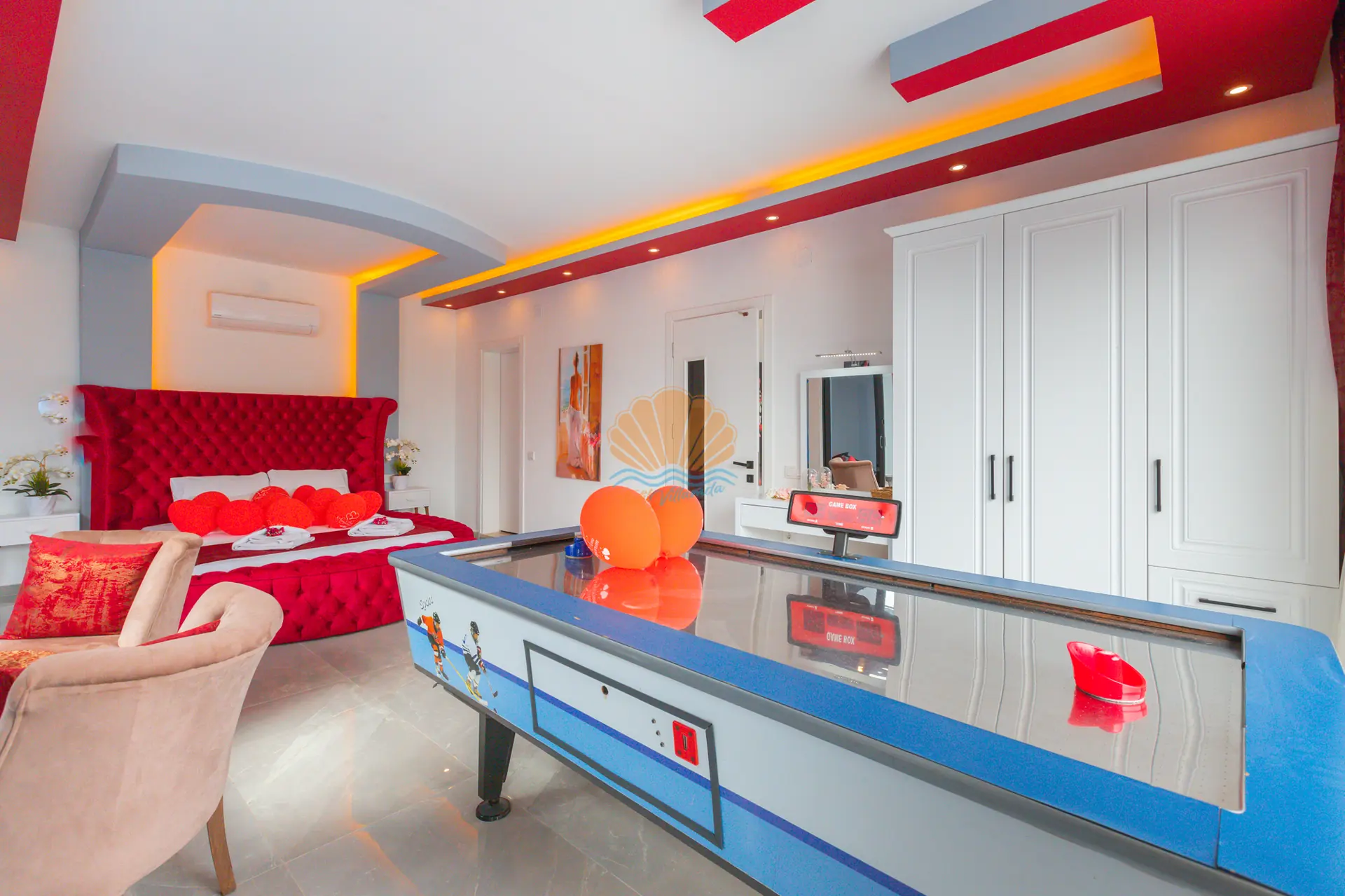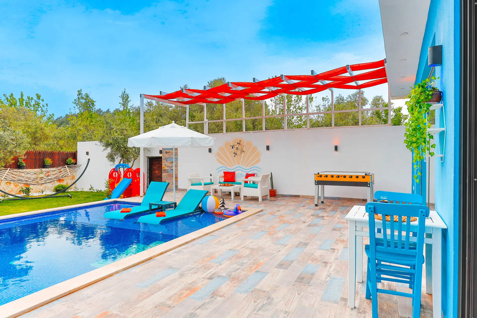 Havuz terası oldukça geniş ve kullanışlıdır. Şezlonglar, şemsiye, salıncak, hamak ve konforlu bahçe oturma grubu ile gün boyu güneşin ve doğanın tadını çıkarabilirsiniz. Barbekü alanı ve masa takımı sayesinde sevdiklerinizle keyifli akşam yemekleri hazırlayabilirsiniz. Eğlenceli vakit geçirmek isteyen misafirler için langırt ve buz hokeyi masası gibi aktiviteler de düşünülmüştür.