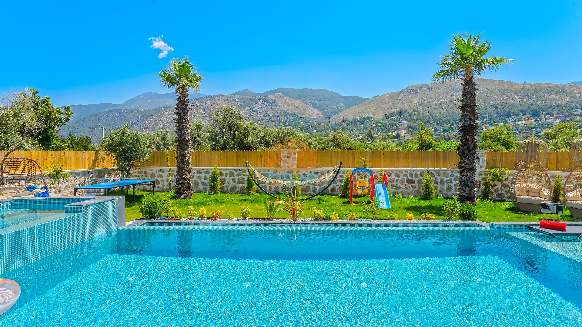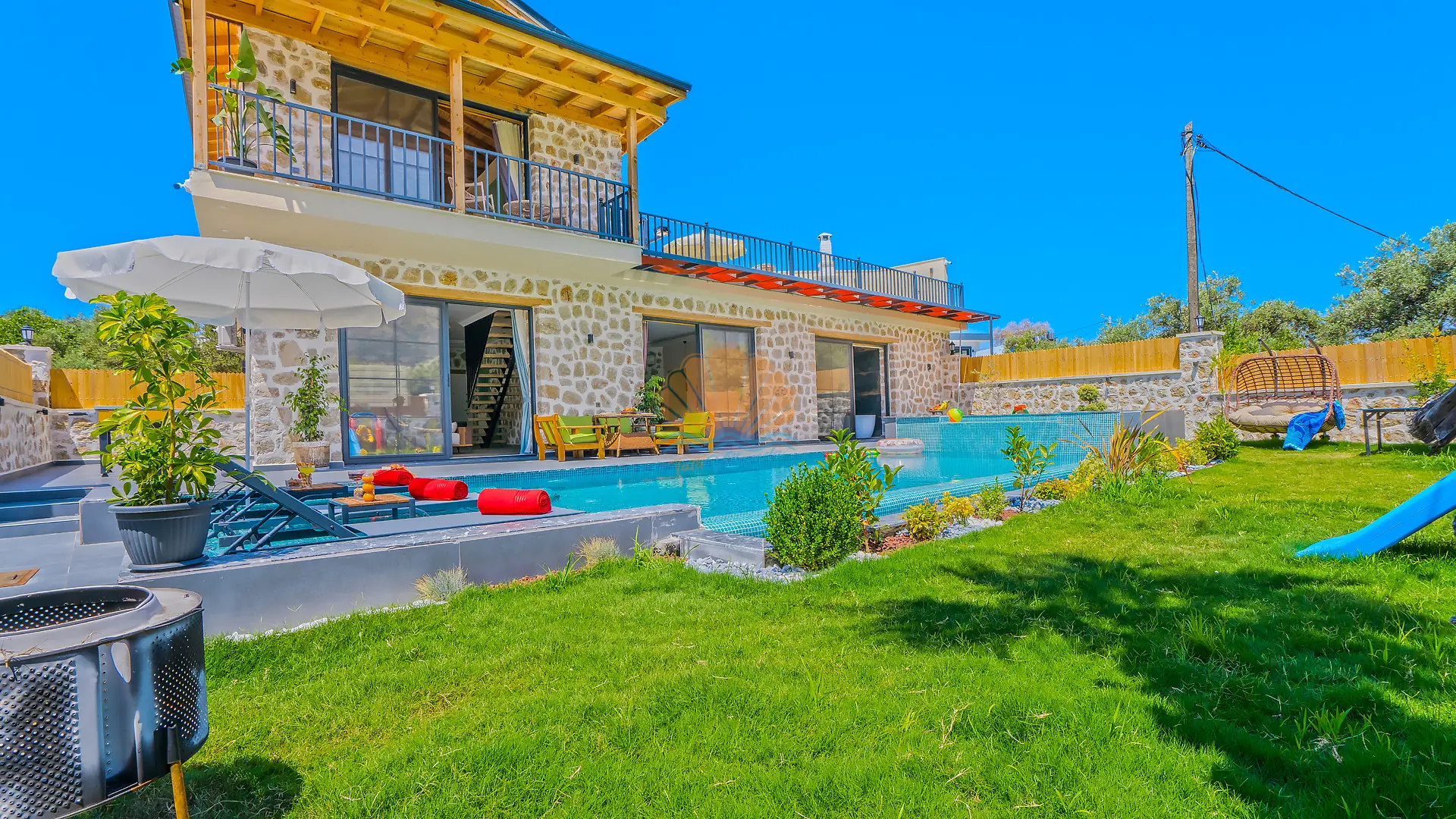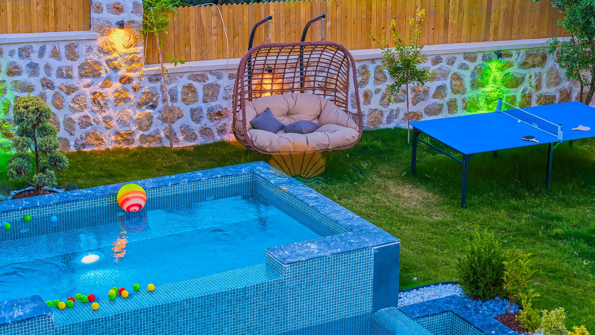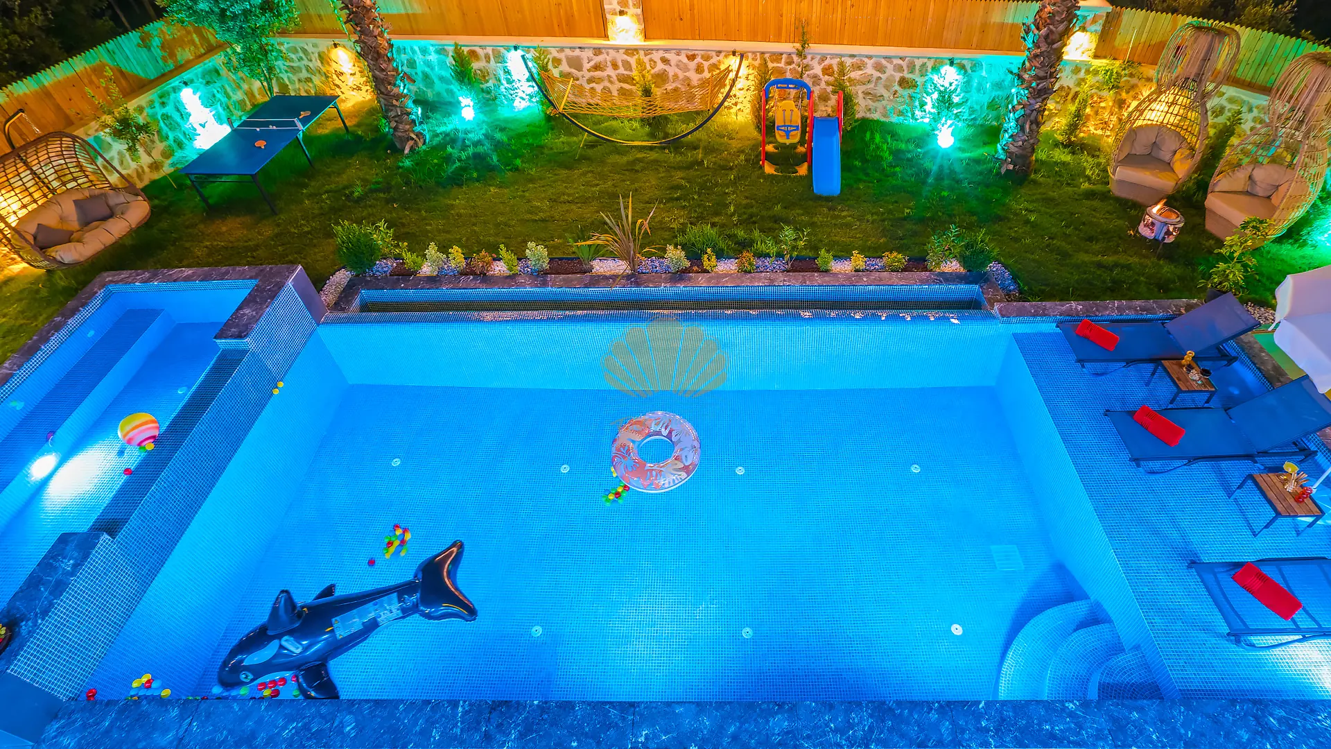 Geniş ve bakımlı bahçesinde yer alan korunaklı özel yüzme havuzu, gün boyu özgürce vakit geçirmenize olanak tanır. Ayrıca çocuklar için düşünülmüş ayrı bir çocuk havuzu da mevcuttur. Havuz başında konforlu şezlonglar, şemsiye, salıncak ve hamak ile dinlenirken, barbekü alanında keyifli akşam yemekleri hazırlayabilirsiniz. Bahçe içerisinde yer alan masa tenisi ve langırt gibi aktiviteler sayesinde eğlenceli vakit geçirebilir, mini çocuk oyun parkı ile çocuklarınızın güvenle eğlenmesini sağlayabilirsiniz.