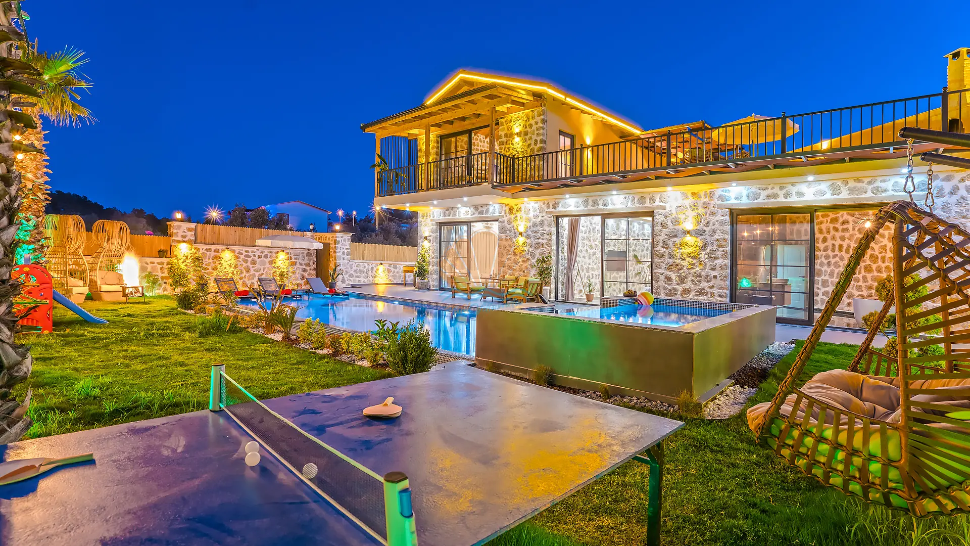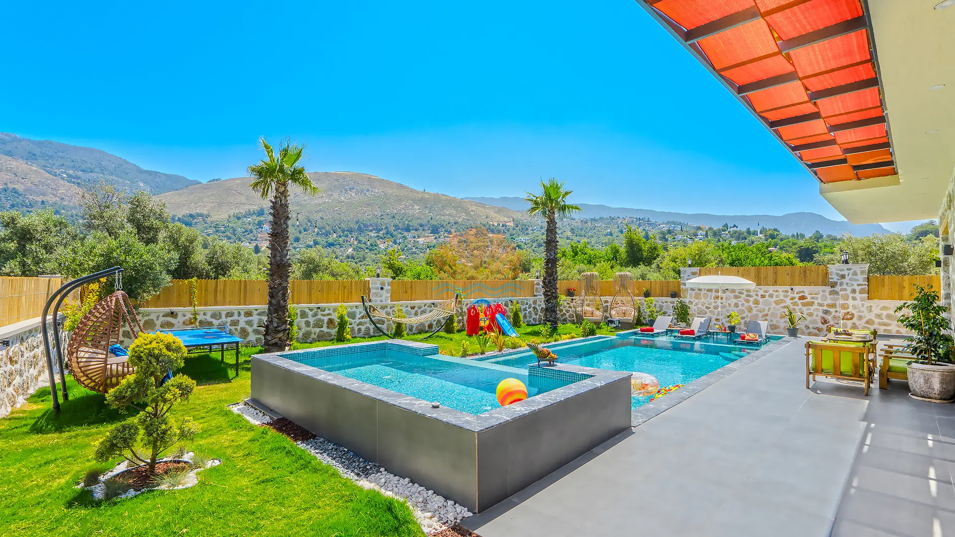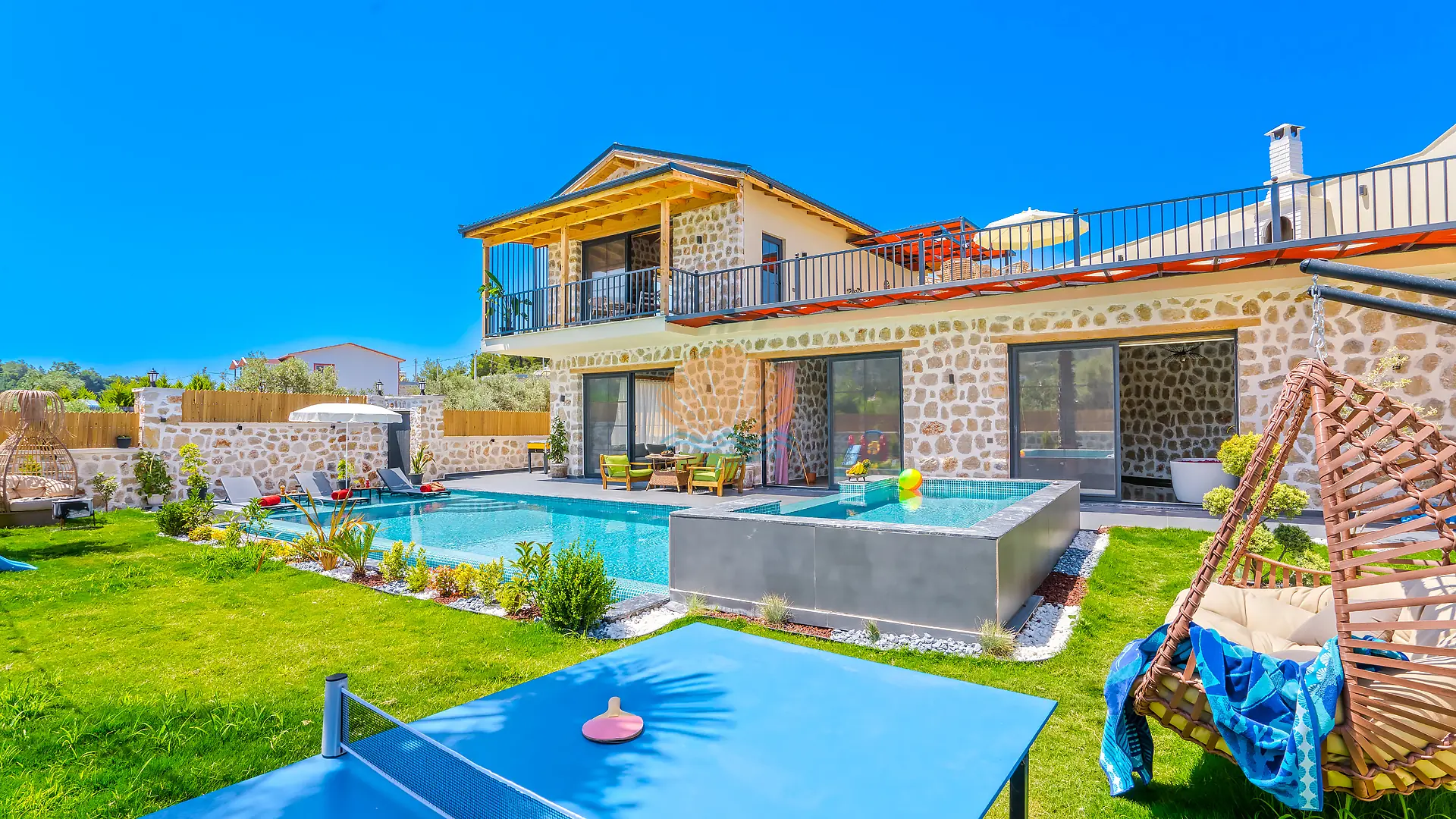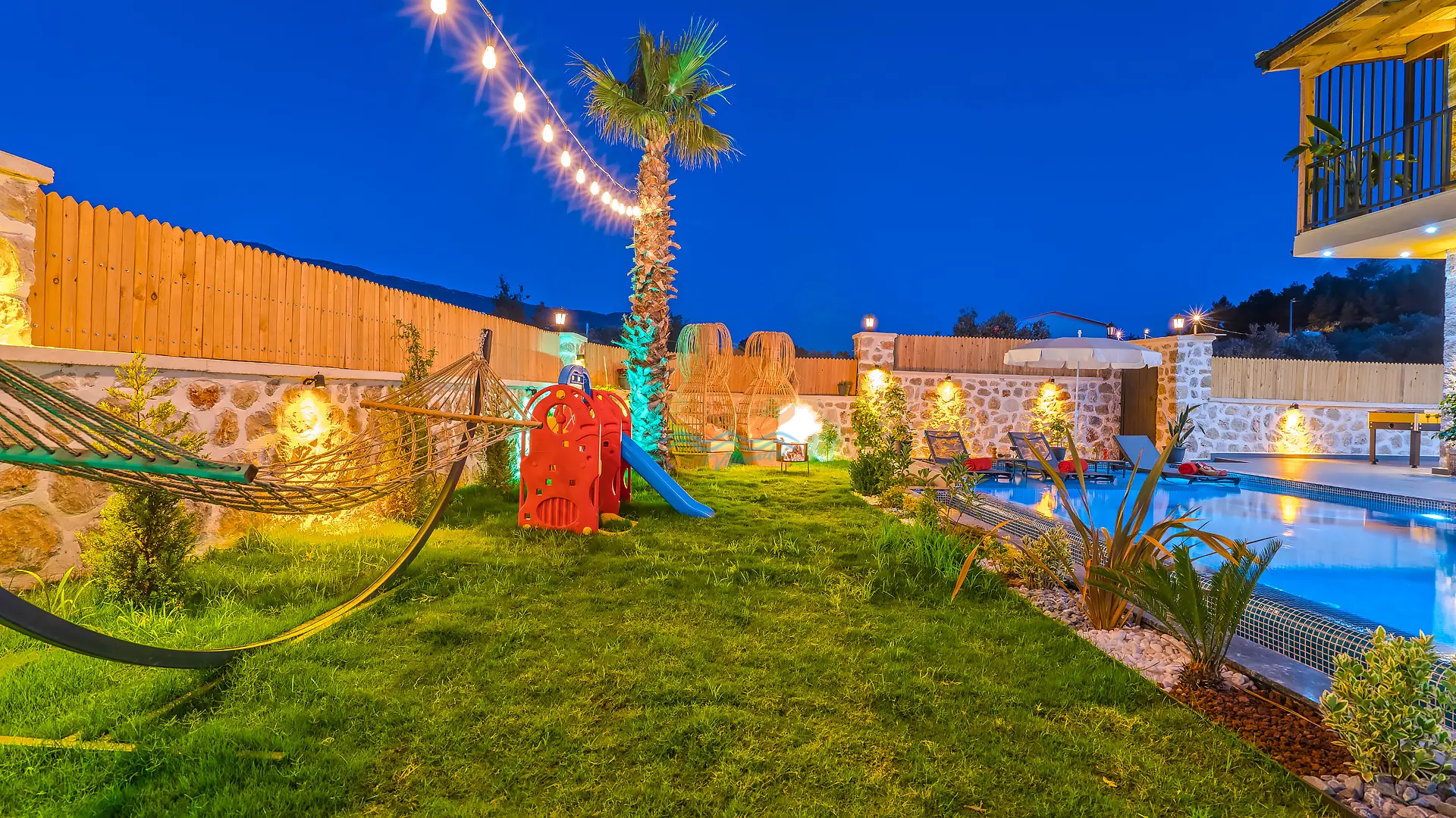 Geniş ve bakımlı bahçesinde yer alan korunaklı özel yüzme havuzu, gün boyu özgürce vakit geçirmenize olanak tanır. Ayrıca çocuklar için düşünülmüş ayrı bir çocuk havuzu da mevcuttur. Havuz başında konforlu şezlonglar, şemsiye, salıncak ve hamak ile dinlenirken, barbekü alanında keyifli akşam yemekleri hazırlayabilirsiniz. Bahçe içerisinde yer alan masa tenisi ve langırt gibi aktiviteler sayesinde eğlenceli vakit geçirebilir, mini çocuk oyun parkı ile çocuklarınızın güvenle eğlenmesini sağlayabilirsiniz.
