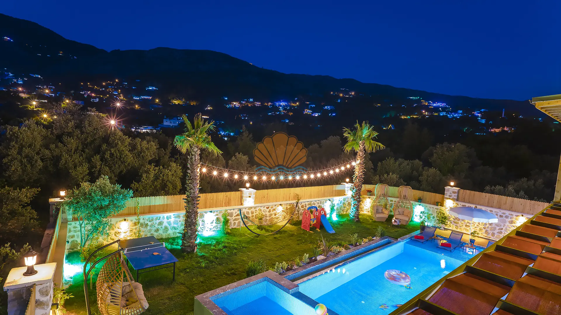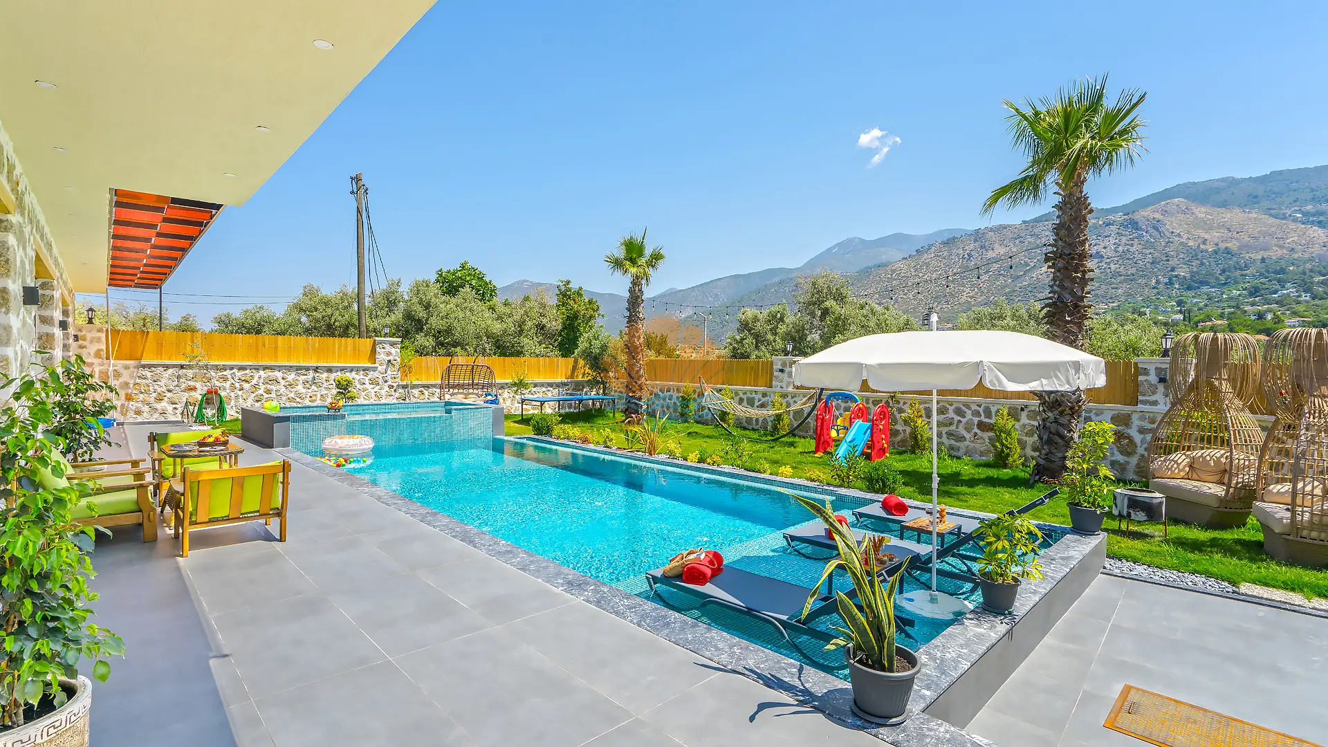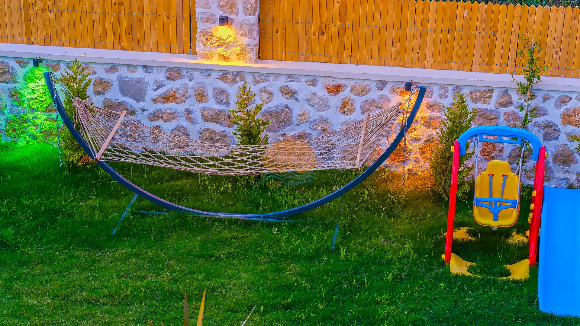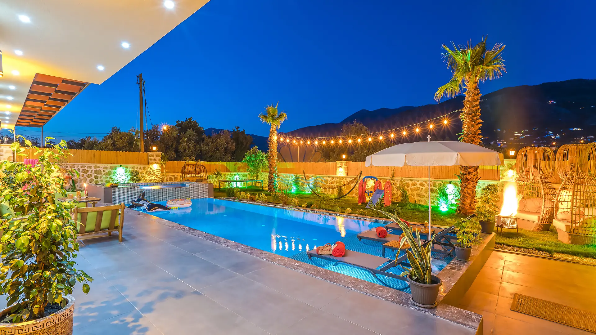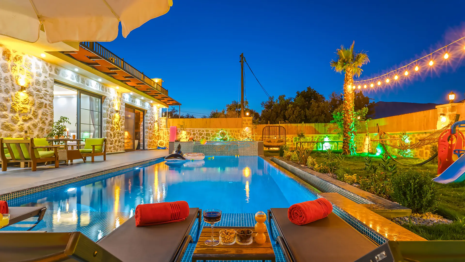Geniş ve bakımlı bahçesinde yer alan korunaklı özel yüzme havuzu, gün boyu özgürce vakit geçirmenize olanak tanır. Ayrıca çocuklar için düşünülmüş ayrı bir çocuk havuzu da mevcuttur. Havuz başında konforlu şezlonglar, şemsiye, salıncak ve hamak ile dinlenirken, barbekü alanında keyifli akşam yemekleri hazırlayabilirsiniz. Bahçe içerisinde yer alan masa tenisi ve langırt gibi aktiviteler sayesinde eğlenceli vakit geçirebilir, mini çocuk oyun parkı ile çocuklarınızın güvenle eğlenmesini sağlayabilirsiniz.