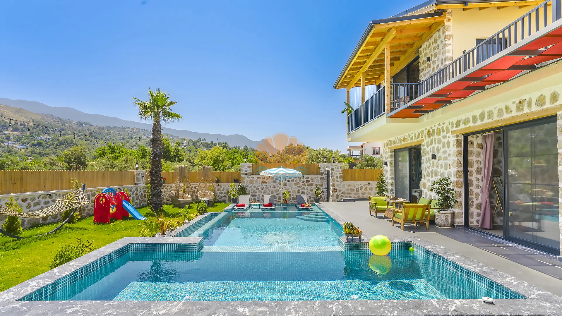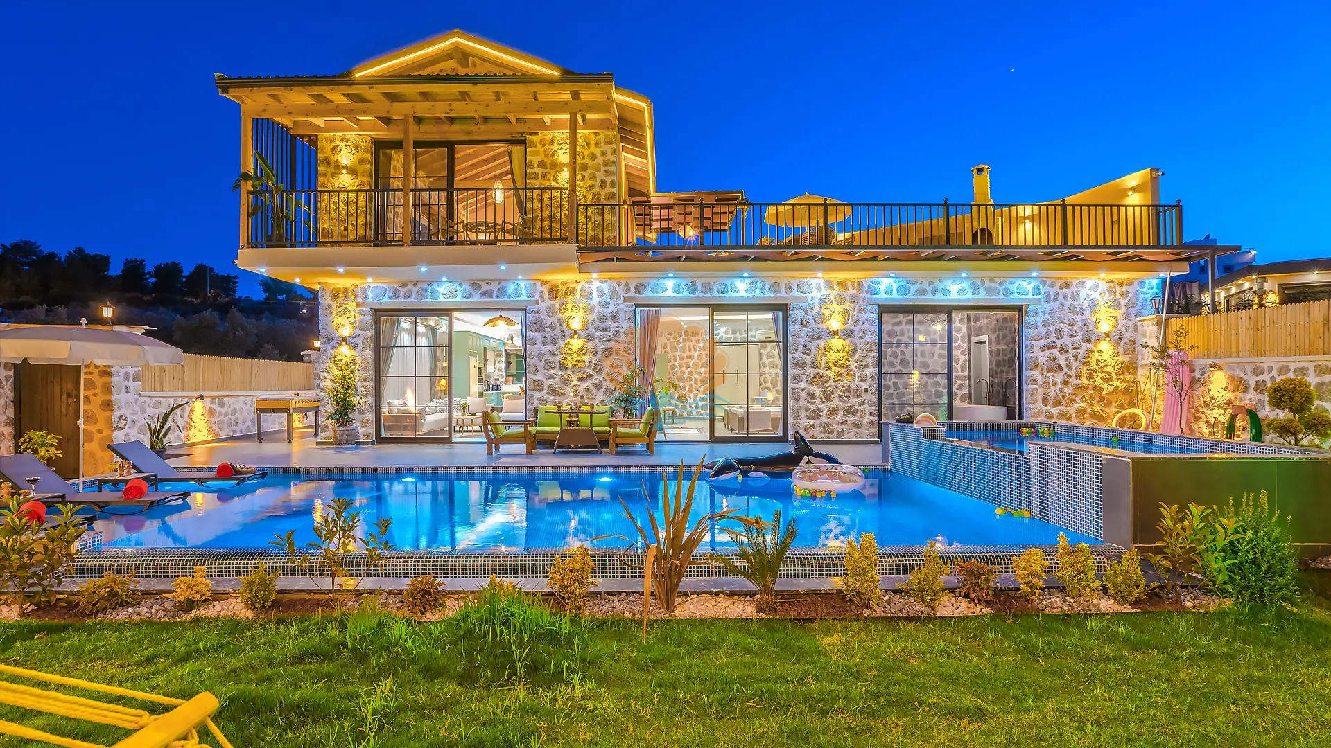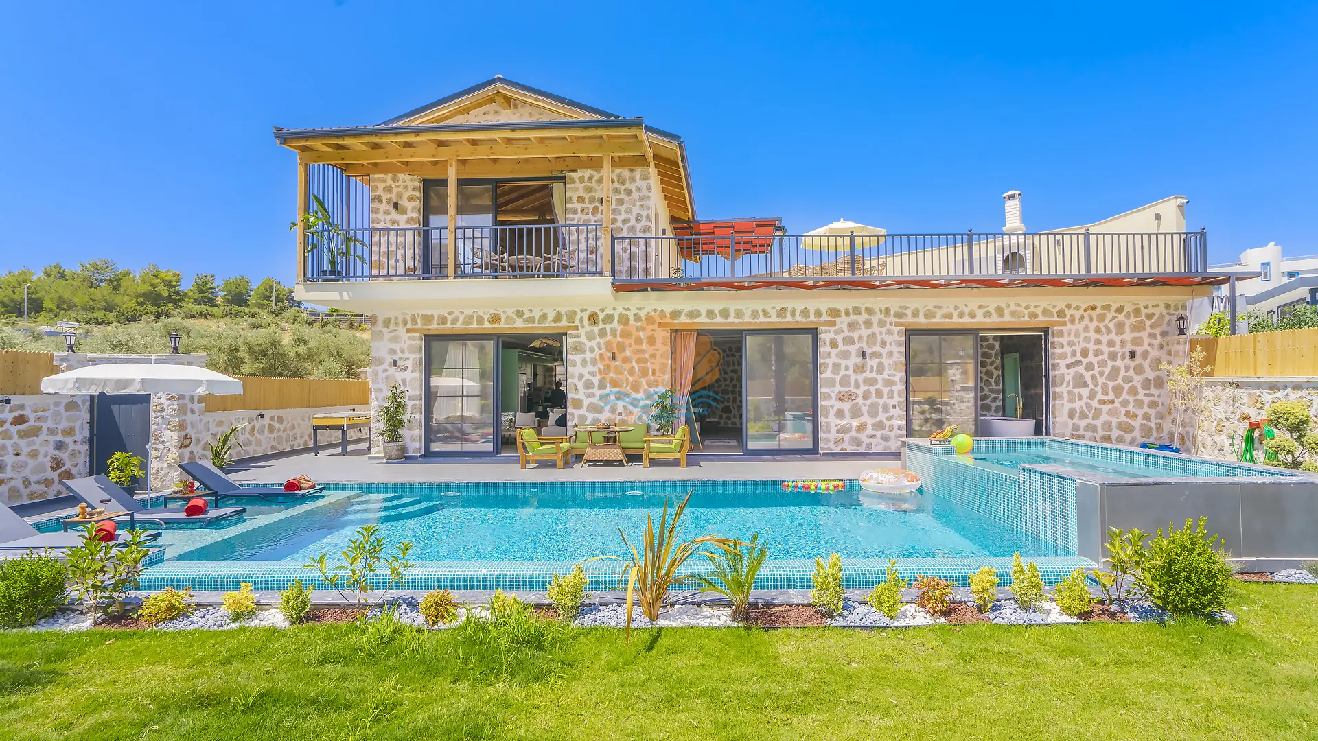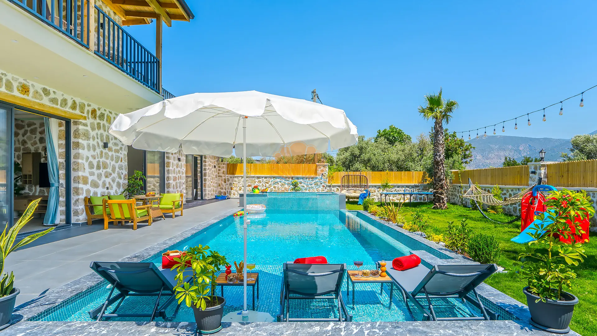 Geniş ve bakımlı bahçesinde yer alan korunaklı özel yüzme havuzu, gün boyu özgürce vakit geçirmenize olanak tanır. Ayrıca çocuklar için düşünülmüş ayrı bir çocuk havuzu da mevcuttur. Havuz başında konforlu şezlonglar, şemsiye, salıncak ve hamak ile dinlenirken, barbekü alanında keyifli akşam yemekleri hazırlayabilirsiniz. Bahçe içerisinde yer alan masa tenisi ve langırt gibi aktiviteler sayesinde eğlenceli vakit geçirebilir, mini çocuk oyun parkı ile çocuklarınızın güvenle eğlenmesini sağlayabilirsiniz.