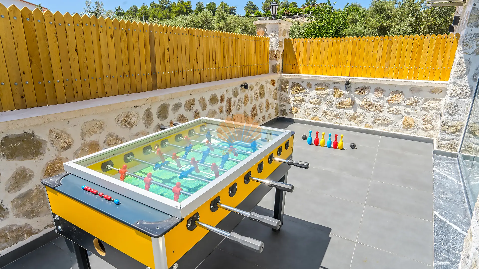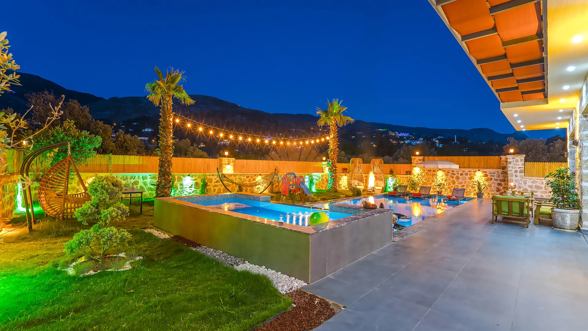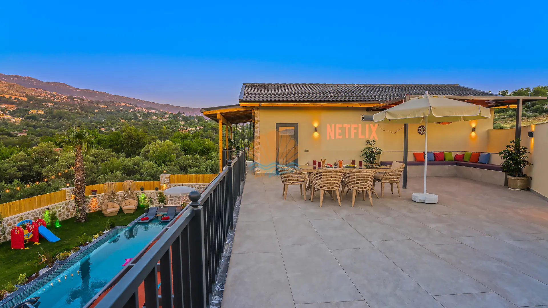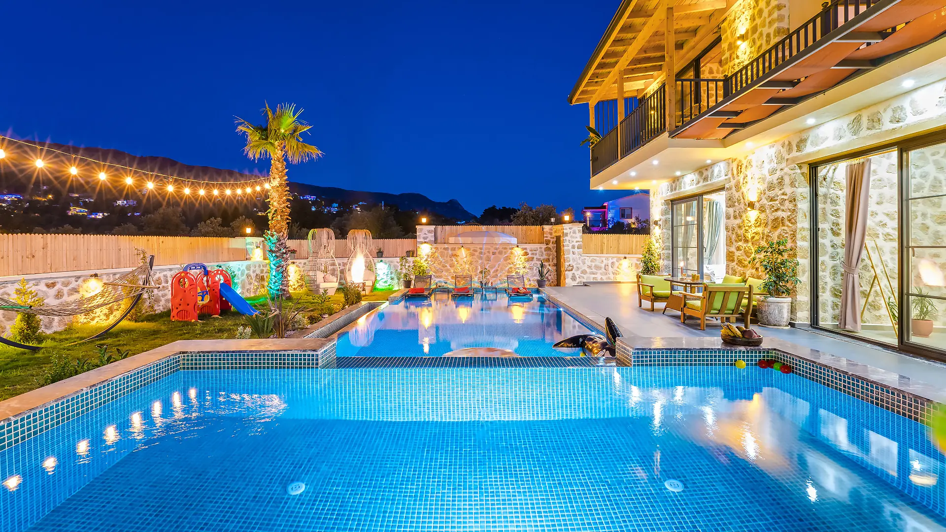 Geniş ve bakımlı bahçesinde yer alan korunaklı özel yüzme havuzu, gün boyu özgürce vakit geçirmenize olanak tanır. Ayrıca çocuklar için düşünülmüş ayrı bir çocuk havuzu da mevcuttur. Havuz başında konforlu şezlonglar, şemsiye, salıncak ve hamak ile dinlenirken, barbekü alanında keyifli akşam yemekleri hazırlayabilirsiniz. Bahçe içerisinde yer alan masa tenisi ve langırt gibi aktiviteler sayesinde eğlenceli vakit geçirebilir, mini çocuk oyun parkı ile çocuklarınızın güvenle eğlenmesini sağlayabilirsiniz.