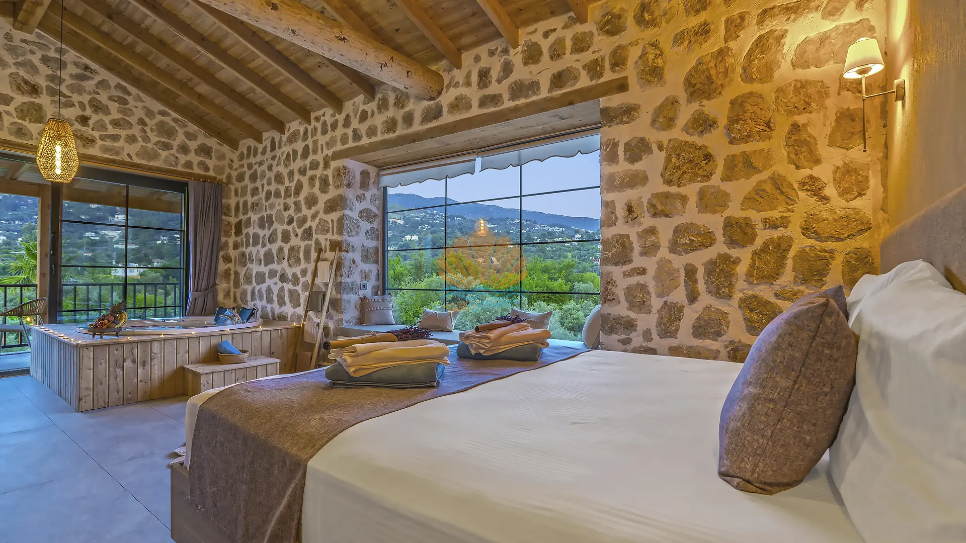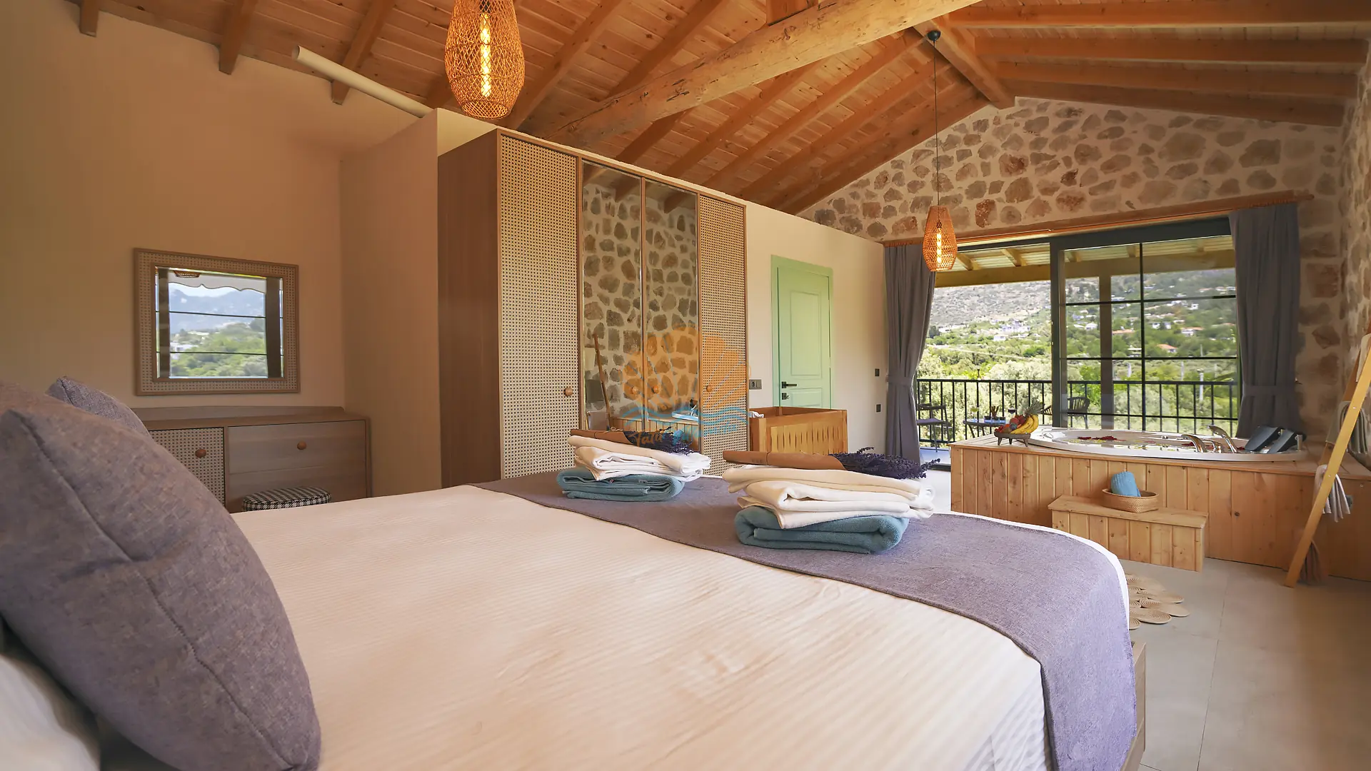 Toplam 2 yatak odasına sahip olan villa, 5 kişiye kadar konaklama kapasitesi sunmaktadır. Modern ve şık detaylarla dizayn edilen odaların her biri ebeveyn banyoludur. Ana yatak odasında keyifli anlar yaşayabileceğiniz jakuzi bulunurken, diğer odada ise konforlu bir küvet yer almaktadır. İç mekânda kullanılan kaliteli ve estetik mobilyalar, tatilinize ayrıcalıklı bir hava katmaktadır.