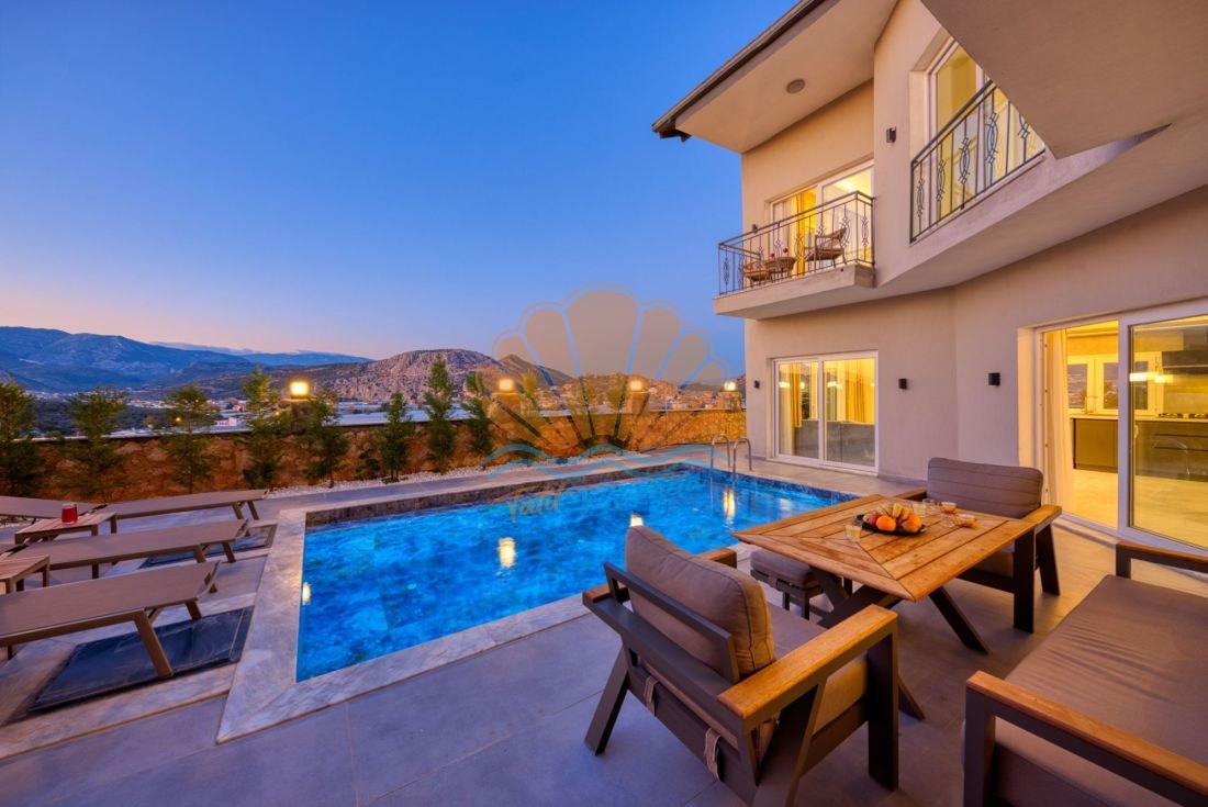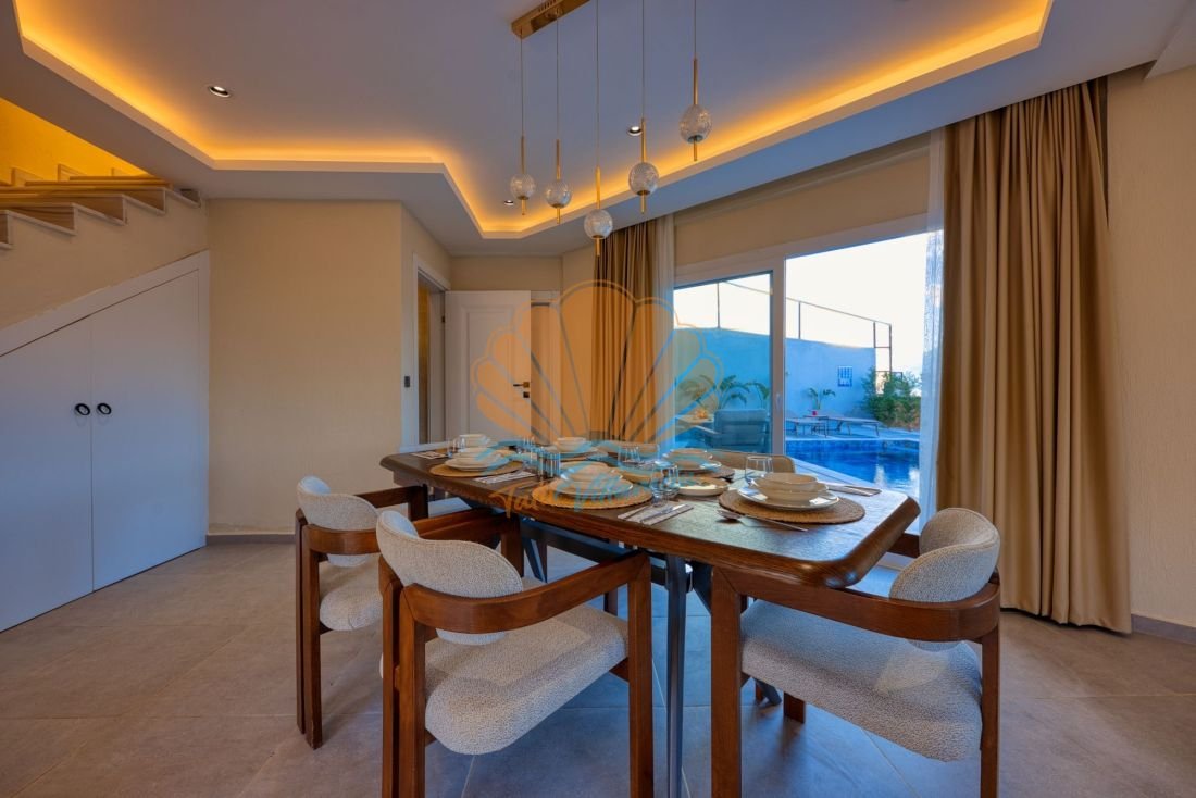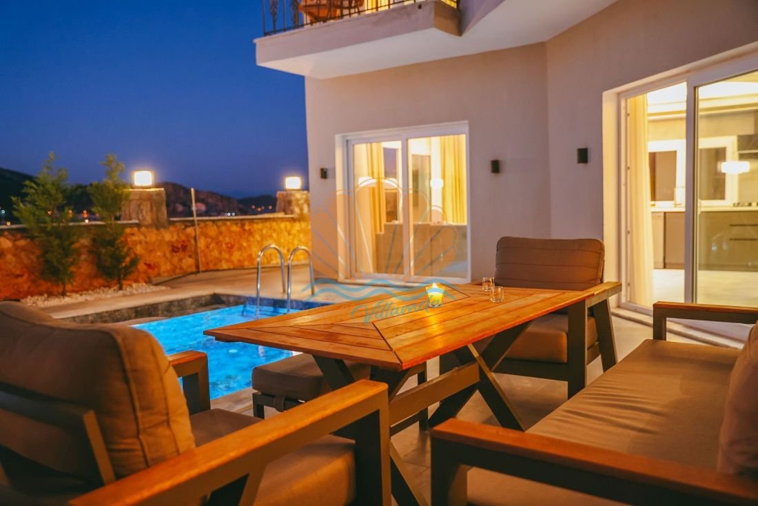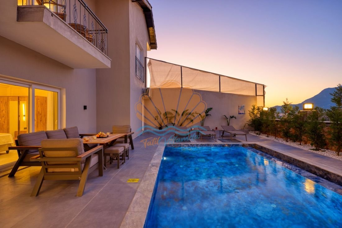 Villanın bahçe ve havuz terası bölümünde şezlonglar, oturma alanları ve keyifli zaman geçirebileceğiniz donatılar yer alır. Özel yüzme havuzu sayesinde gün boyu serinleyebilir, sevdiklerinizle birlikte size ait bir alanda tatilin tadını çıkarabilirsiniz. Doğa manzarası eşliğinde huzurlu sabah kahvaltıları ve akşam yemekleri için uygun bir atmosfer sunar.