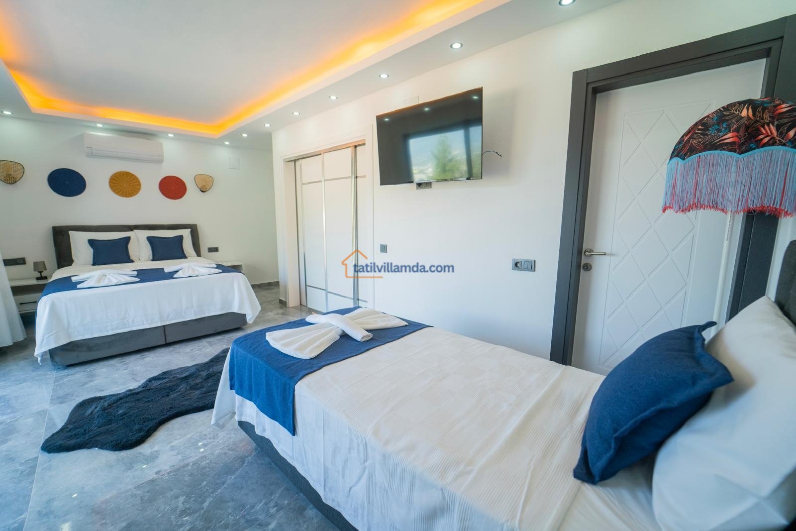 Kalkan Çavdır’da yer alan bu özel villamız, doğayla iç içe huzurlu bir tatil arayan misafirlerimiz için ideal bir seçenektir. 2 yatak odalı ve 5 kişilik konaklama kapasitesine sahip villamız, korunaklı özel yüzme havuzu sayesinde muhafazakâr aileler için de uygundur. Ebeveyn odasında yer alan jakuzi, tatilinize konfor ve keyif katarken, havuz başında bulunan langırt masası da eğlenceli vakitler geçirmenizi sağlar.