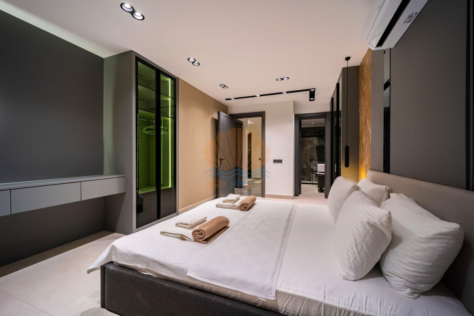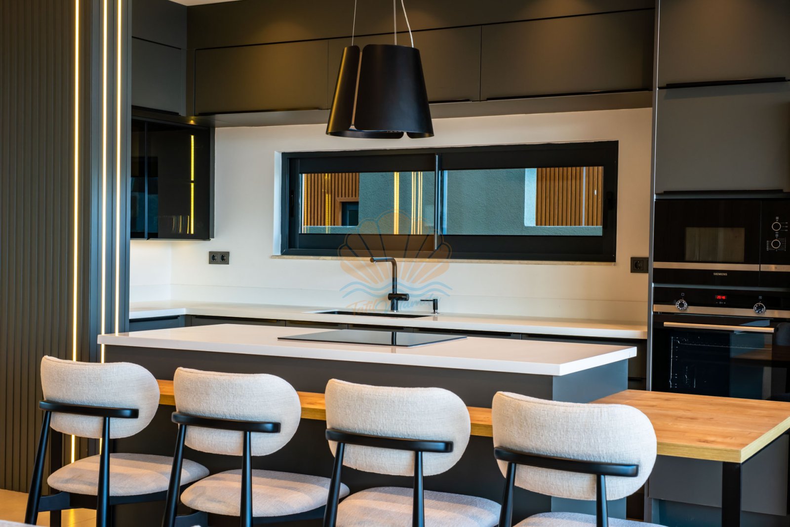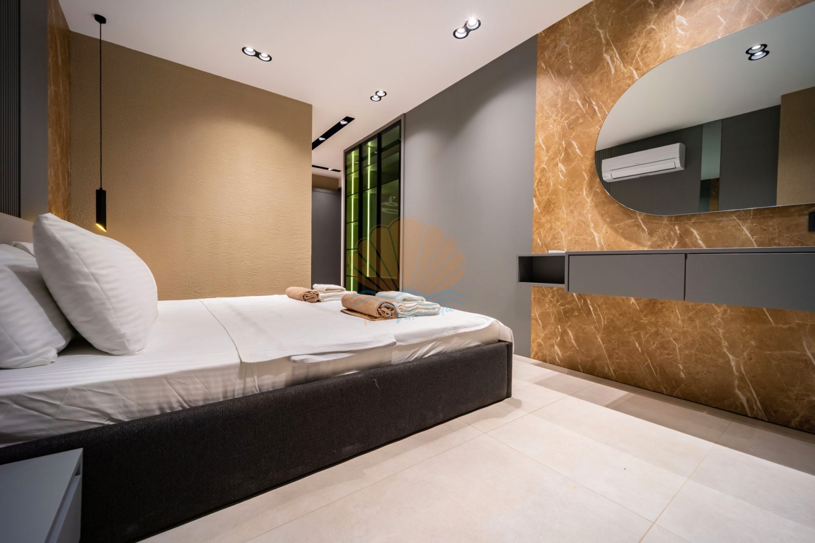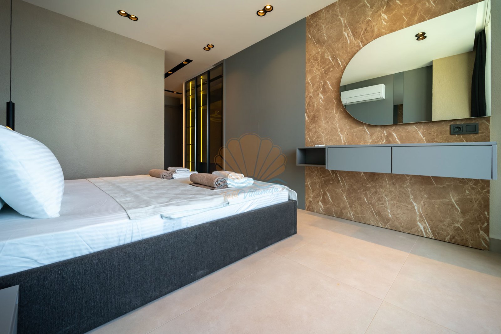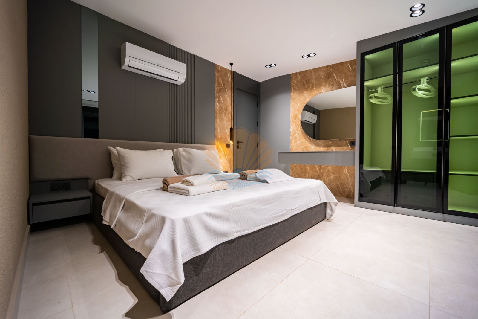 Villa Aura C, 3 yatak odası ile toplamda 6 kişilik konaklama kapasitesine sahiptir. Her yatak odası özenle dekore edilmiş olup, ebeveyn banyosu bulunmaktadır. Bu özellik, kalabalık aileler ve arkadaş grupları için hem konfor hem de mahremiyet sunar. Modern iç tasarımı, ferah yaşam alanları ve kaliteli donanımı sayesinde misafirlerine ev rahatlığında bir tatil deneyimi yaşatır.