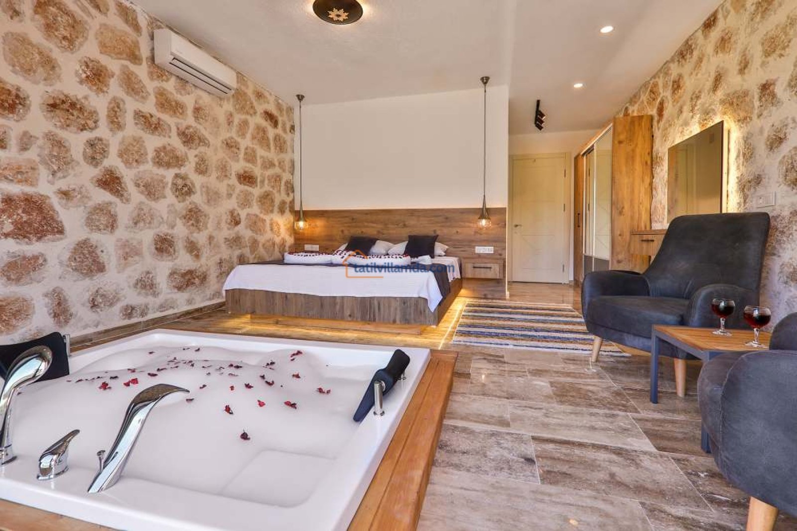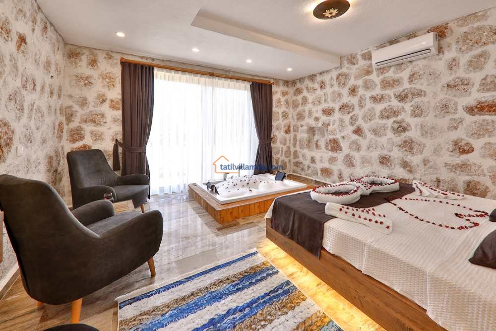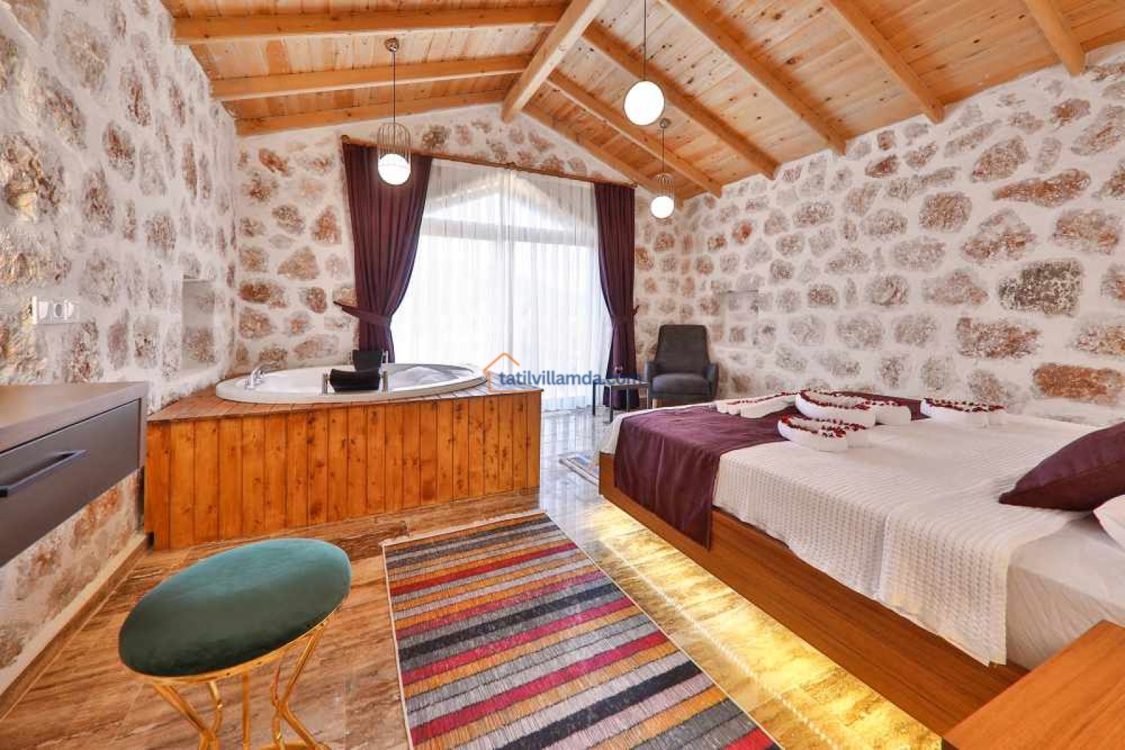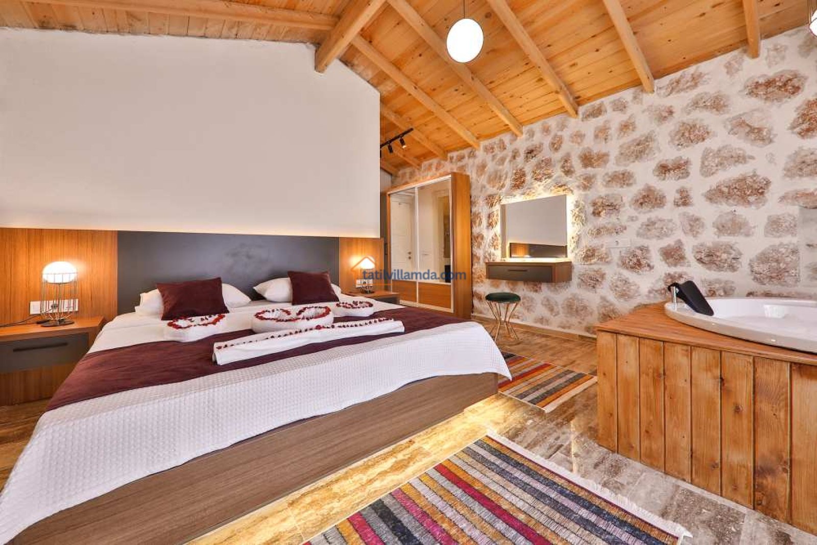 Villa Aydoğdu, modern ve şık bir tasarıma sahiptir. İki yatak odalı olan bu konforlu villa, toplamda dört kişilik konaklama kapasitesine sahiptir. Her iki yatak odasında da çift kişilik yatak ve özel jakuzi bulunur. Bu sayede misafirler hem rahat hem de lüks bir tatilin tadını çıkarabilirler.