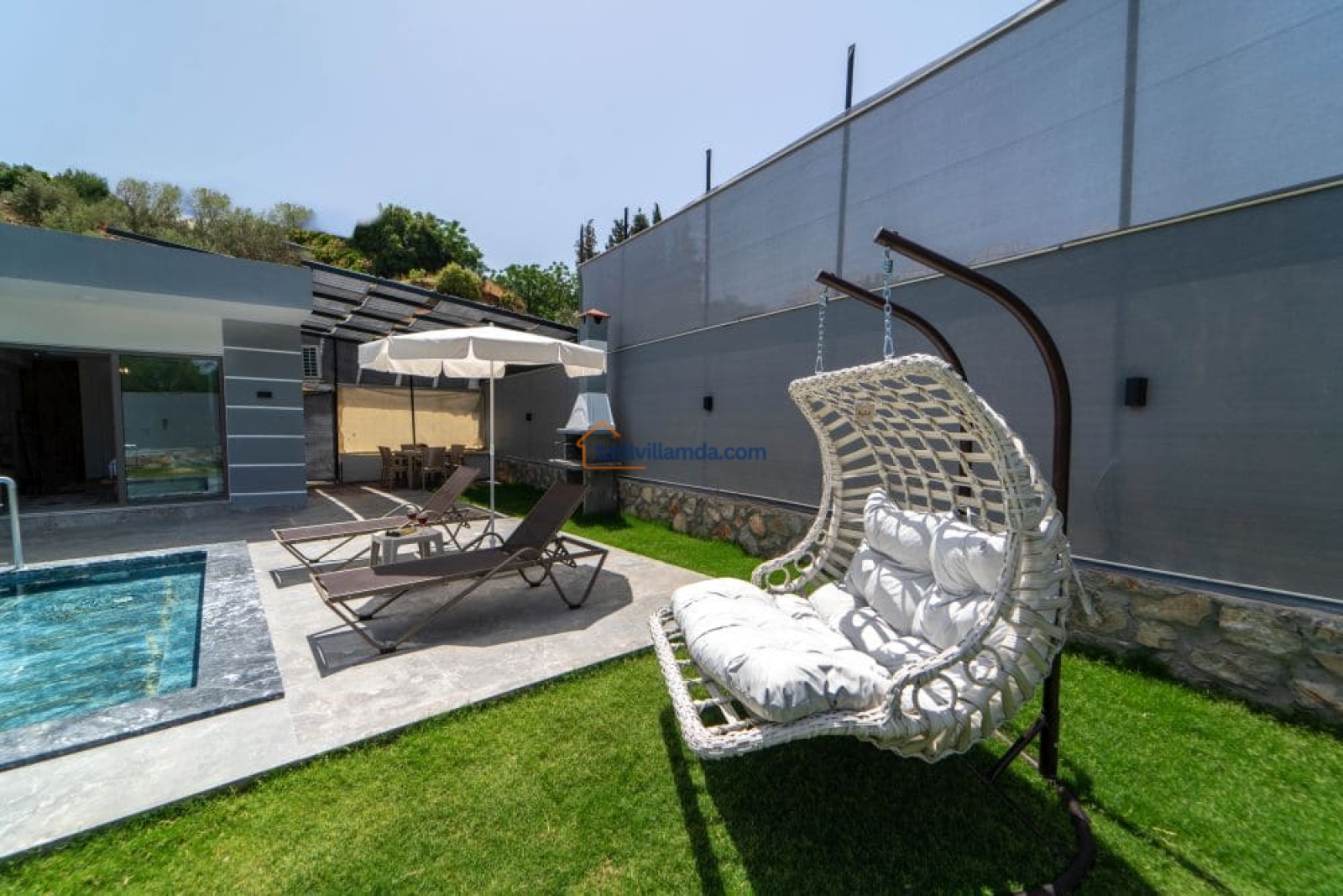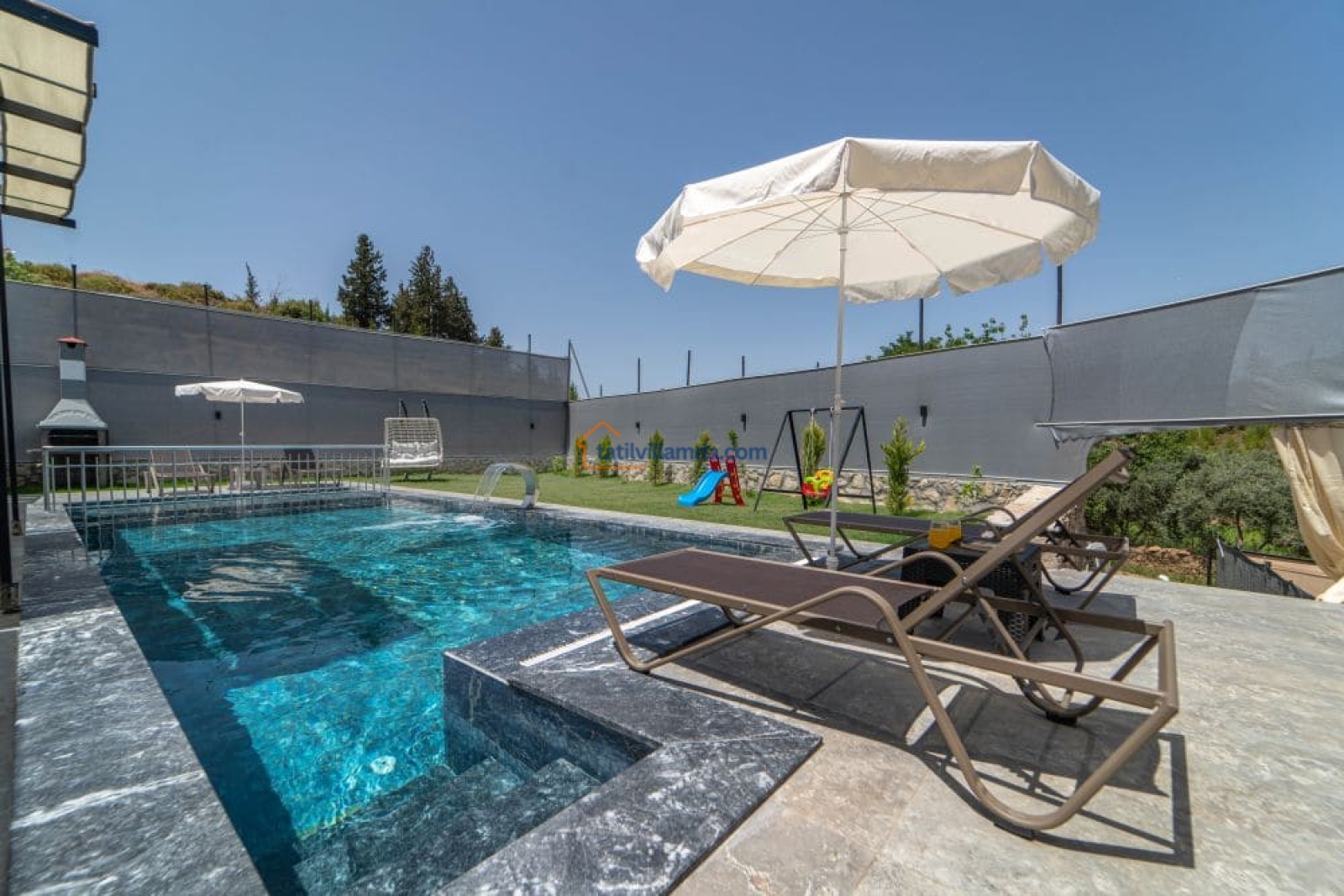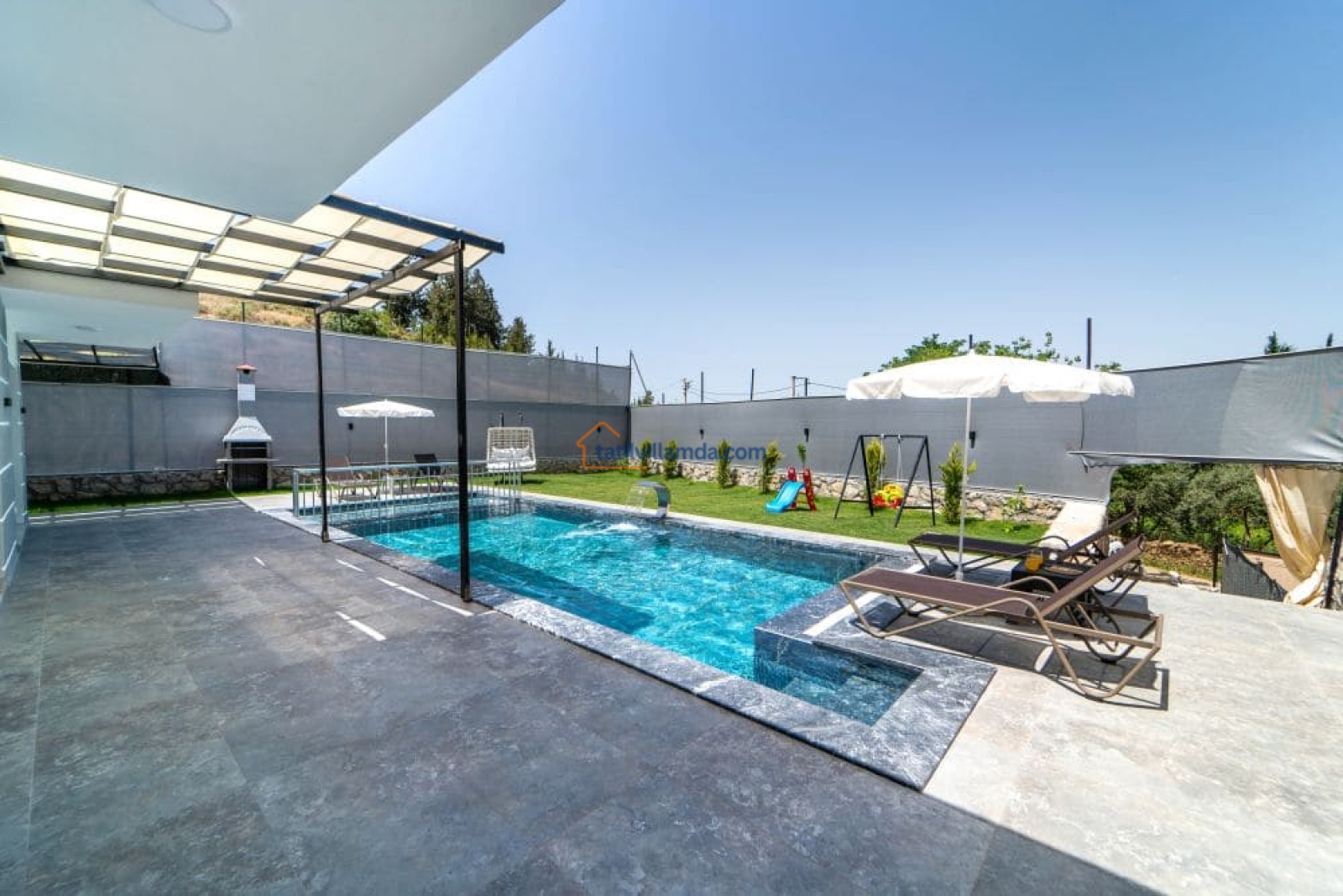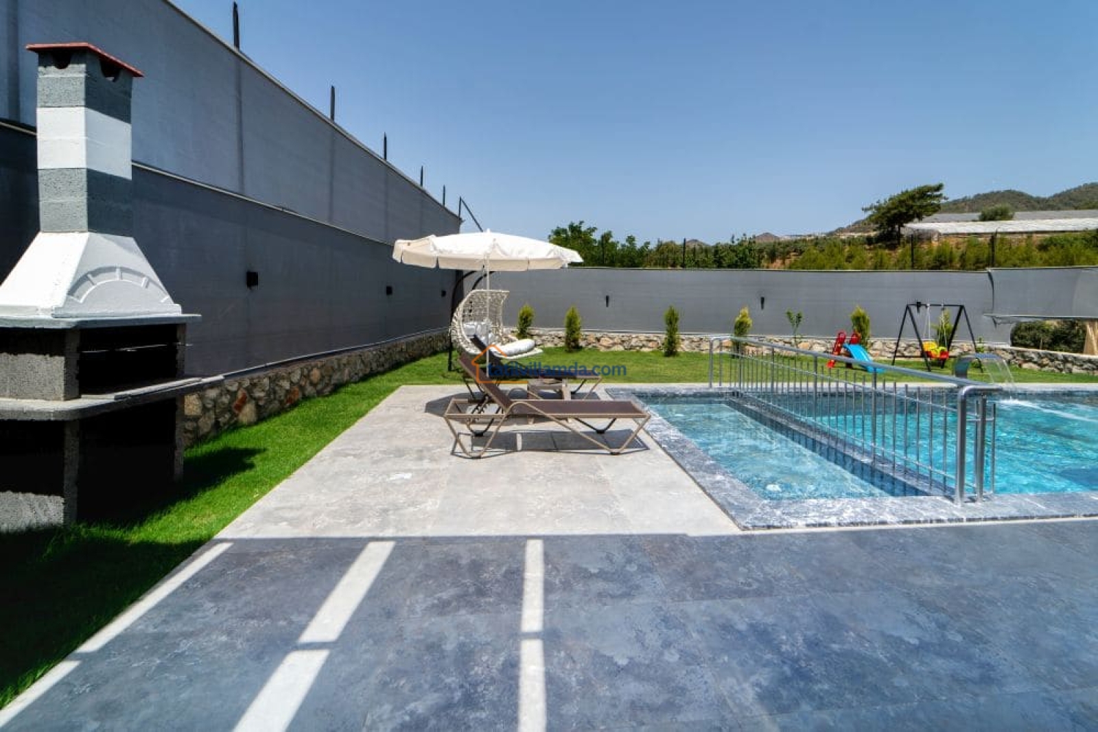 Bahçesi keyifli vakit geçirmek üzere özenle düzenlenmiştir. Mini çocuk oyun alanı sayesinde küçük misafirler güvenle oyun oynarken, yetişkinler havuz başında dinlenebilir. Bahçede barbekü, şezlonglar, salıncak ve açık hava yemek masası, sevdiklerinizle keyifli anlar yaşamanız için düşünülmüştür.