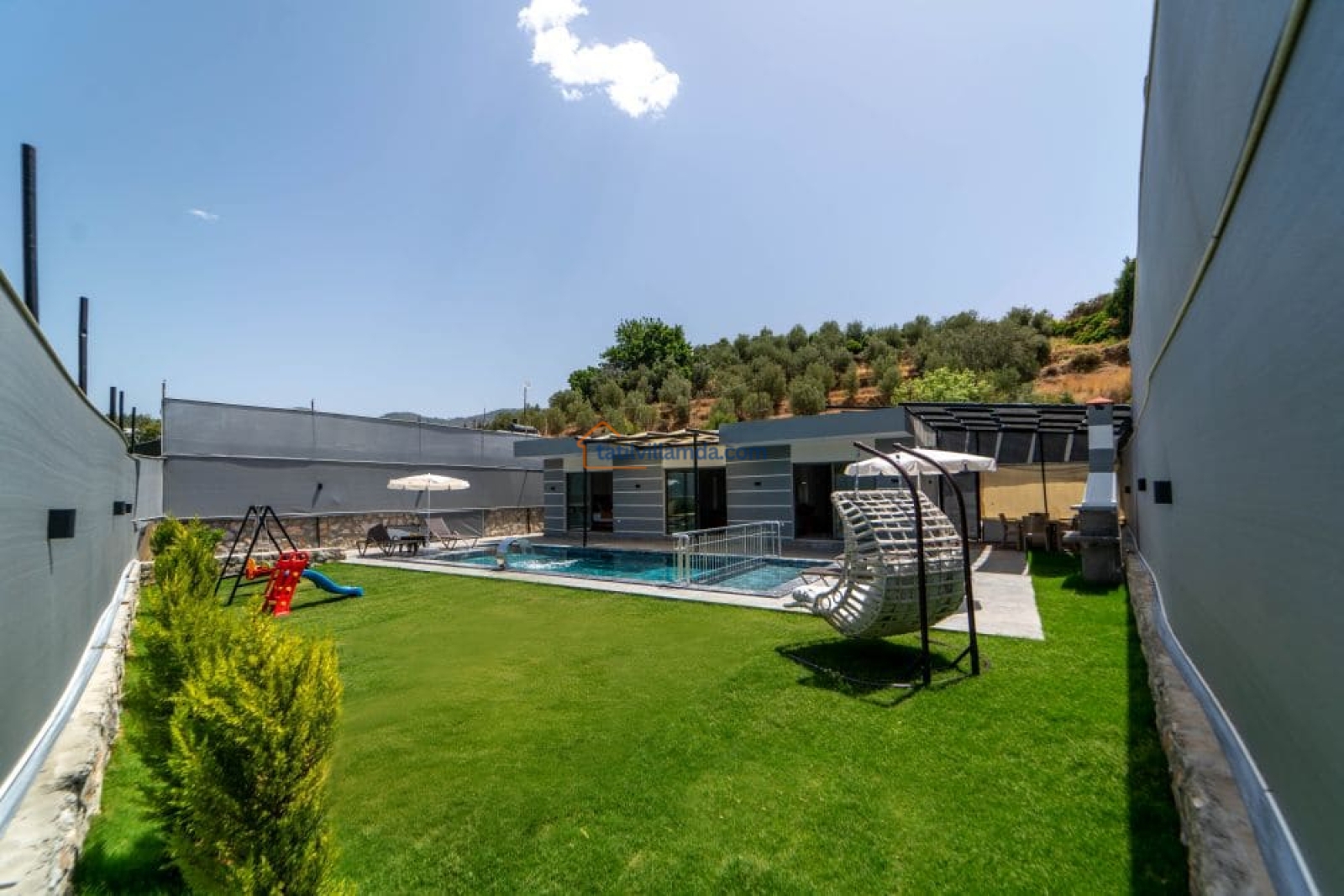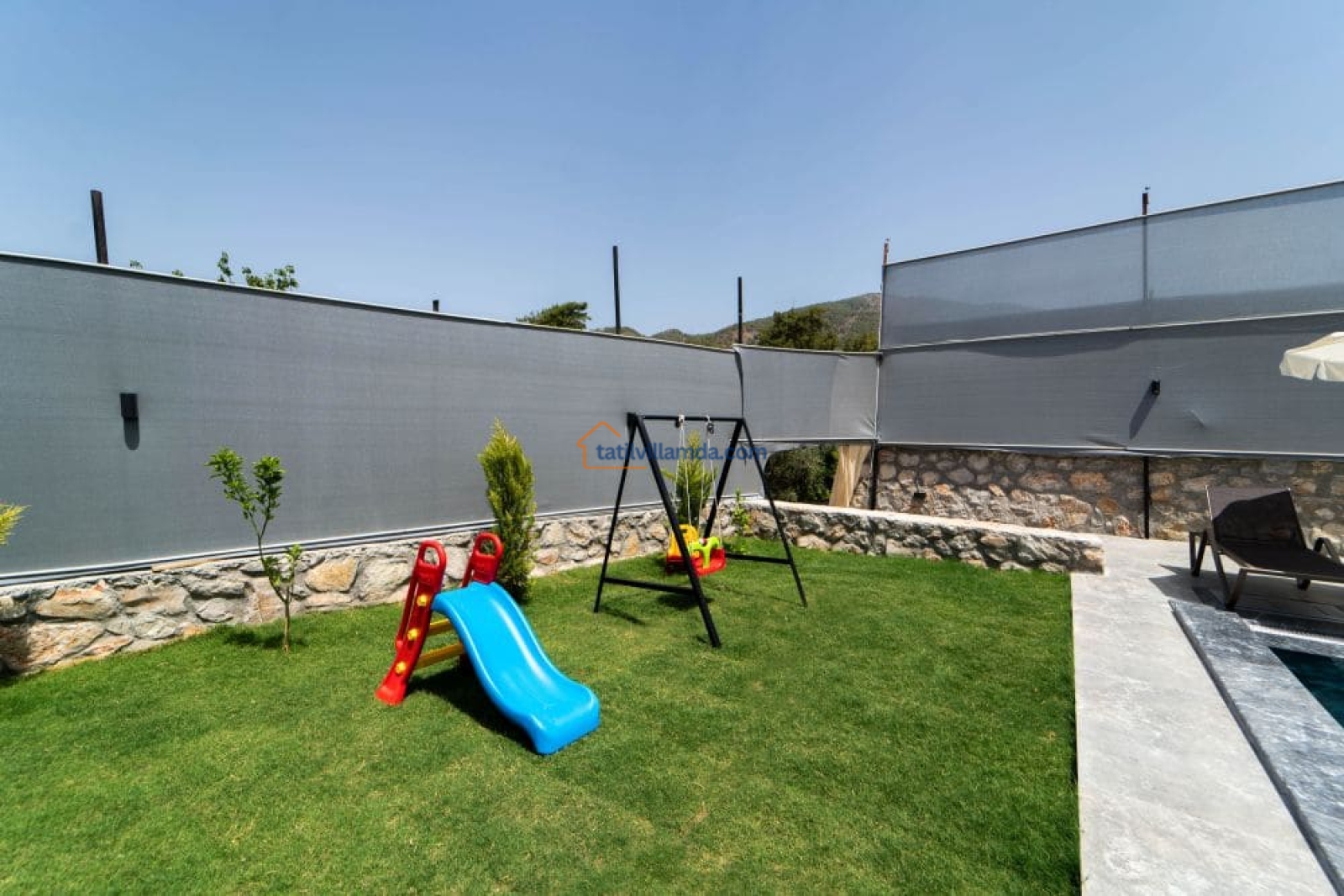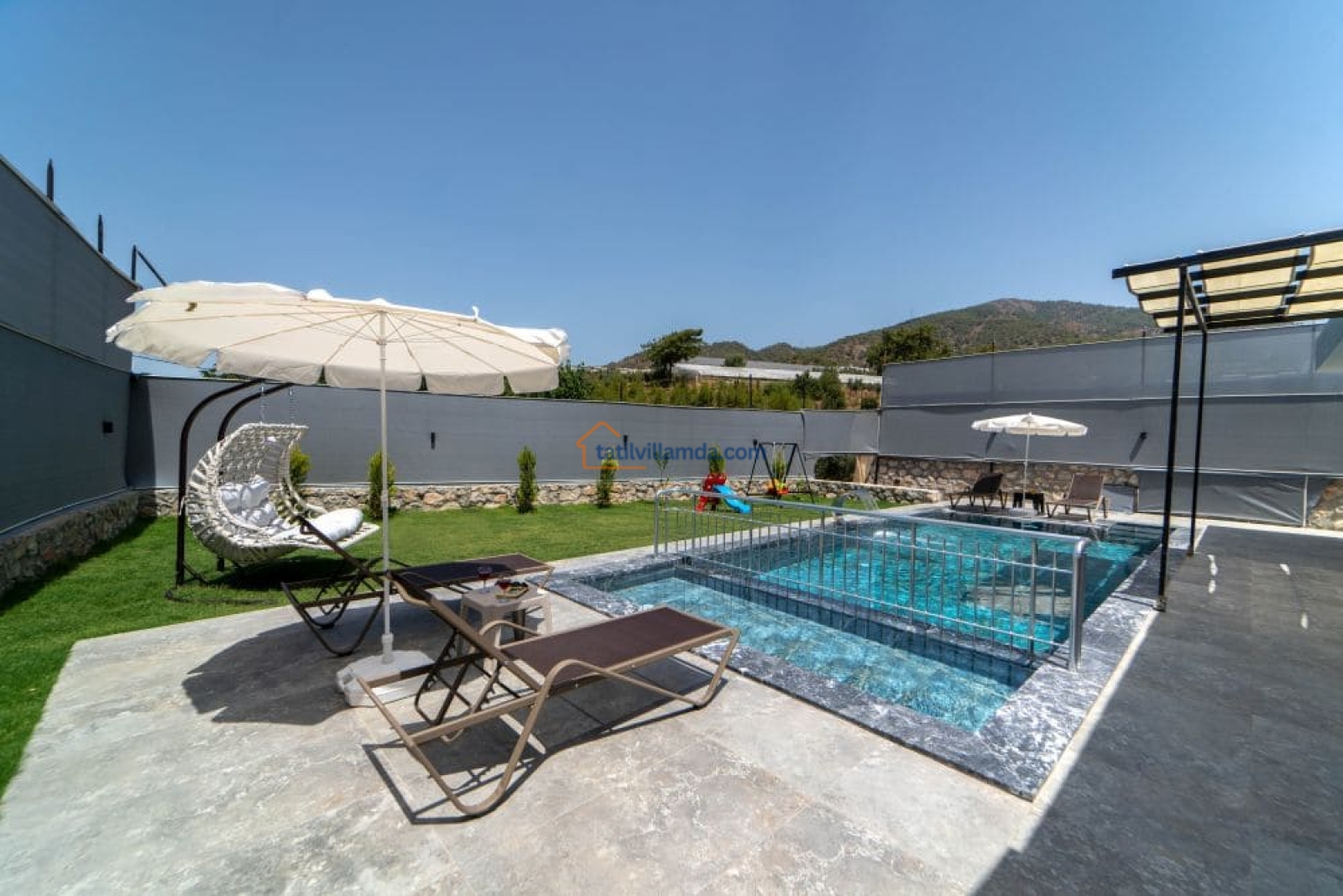 Bahçesi keyifli vakit geçirmek üzere özenle düzenlenmiştir. Mini çocuk oyun alanı sayesinde küçük misafirler güvenle oyun oynarken, yetişkinler havuz başında dinlenebilir. Bahçede barbekü, şezlonglar, salıncak ve açık hava yemek masası, sevdiklerinizle keyifli anlar yaşamanız için düşünülmüştür.