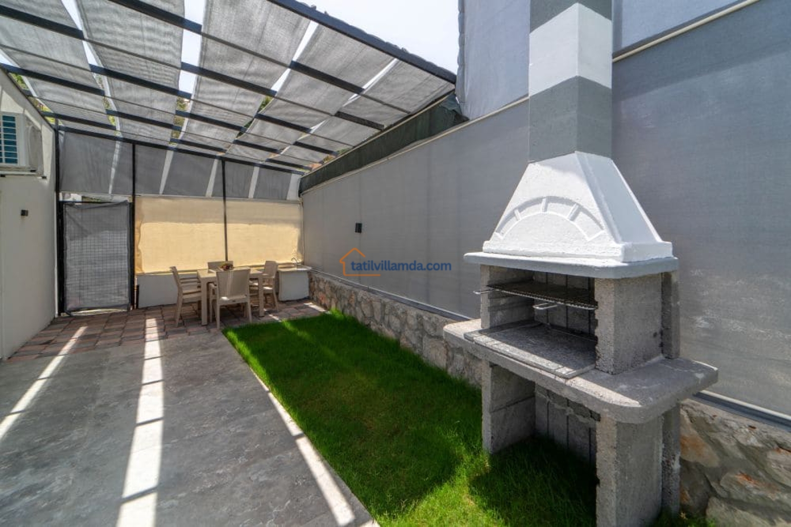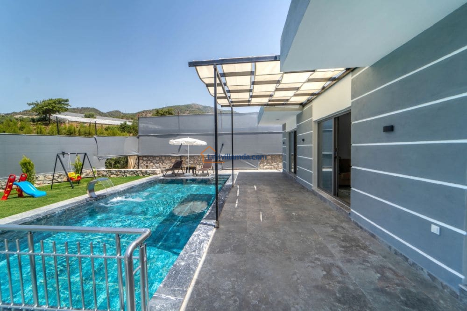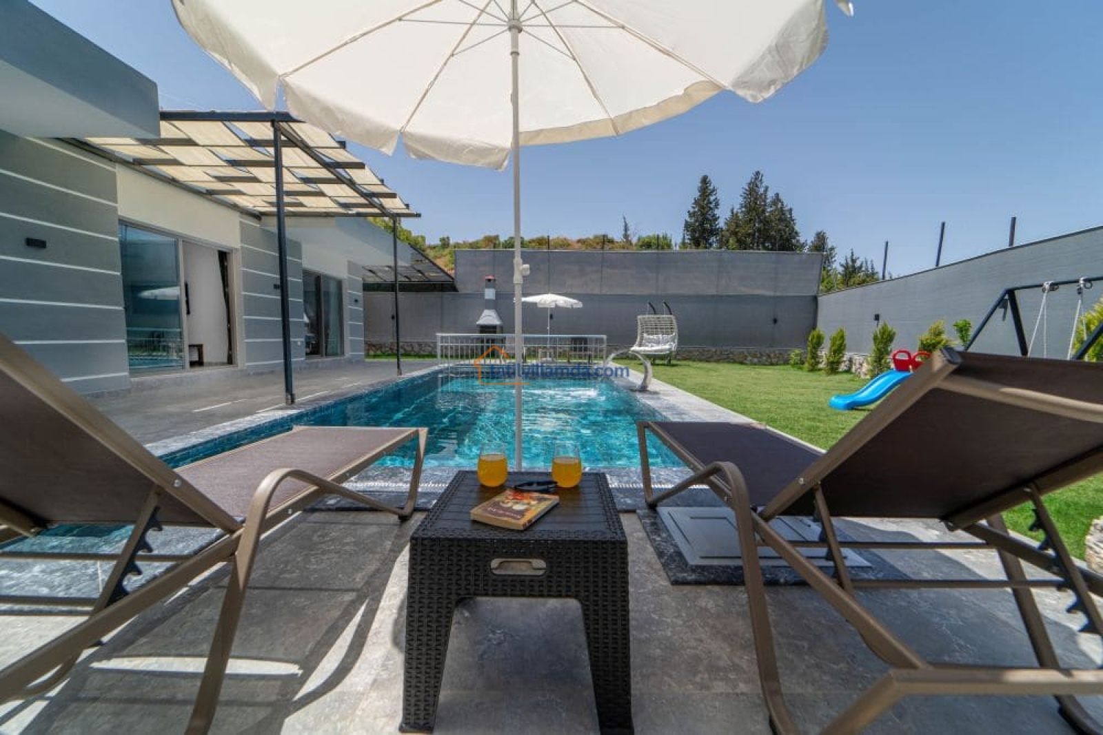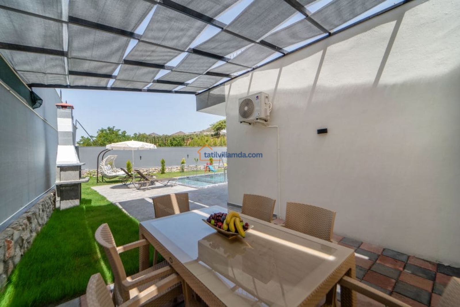 Bahçesi keyifli vakit geçirmek üzere özenle düzenlenmiştir. Mini çocuk oyun alanı sayesinde küçük misafirler güvenle oyun oynarken, yetişkinler havuz başında dinlenebilir. Bahçede barbekü, şezlonglar, salıncak ve açık hava yemek masası, sevdiklerinizle keyifli anlar yaşamanız için düşünülmüştür.