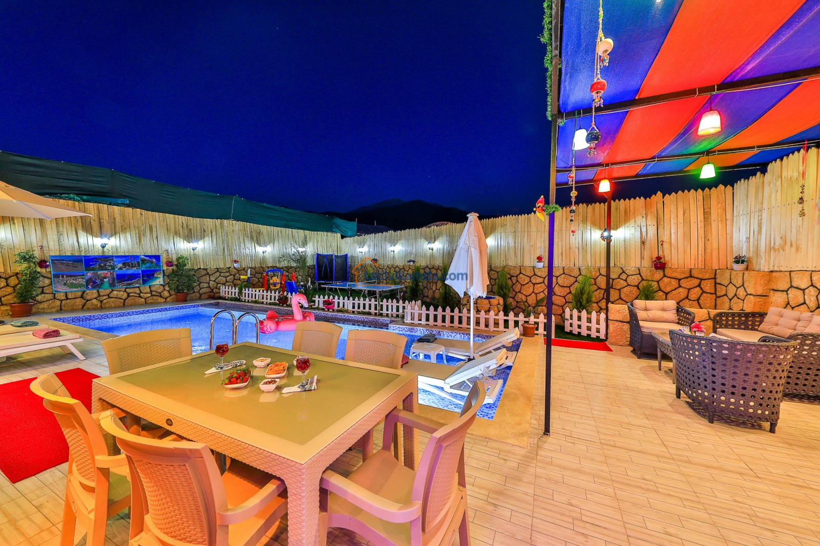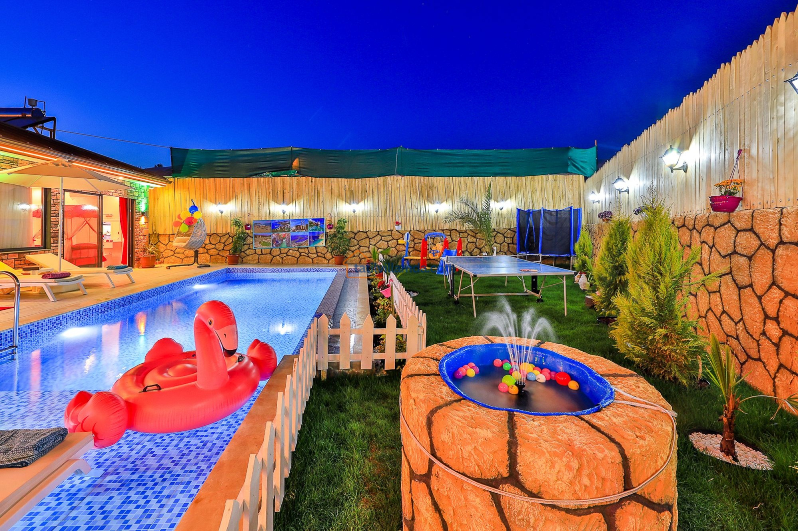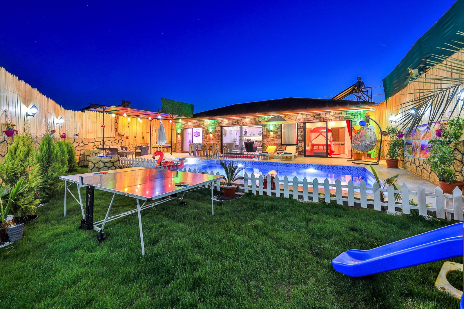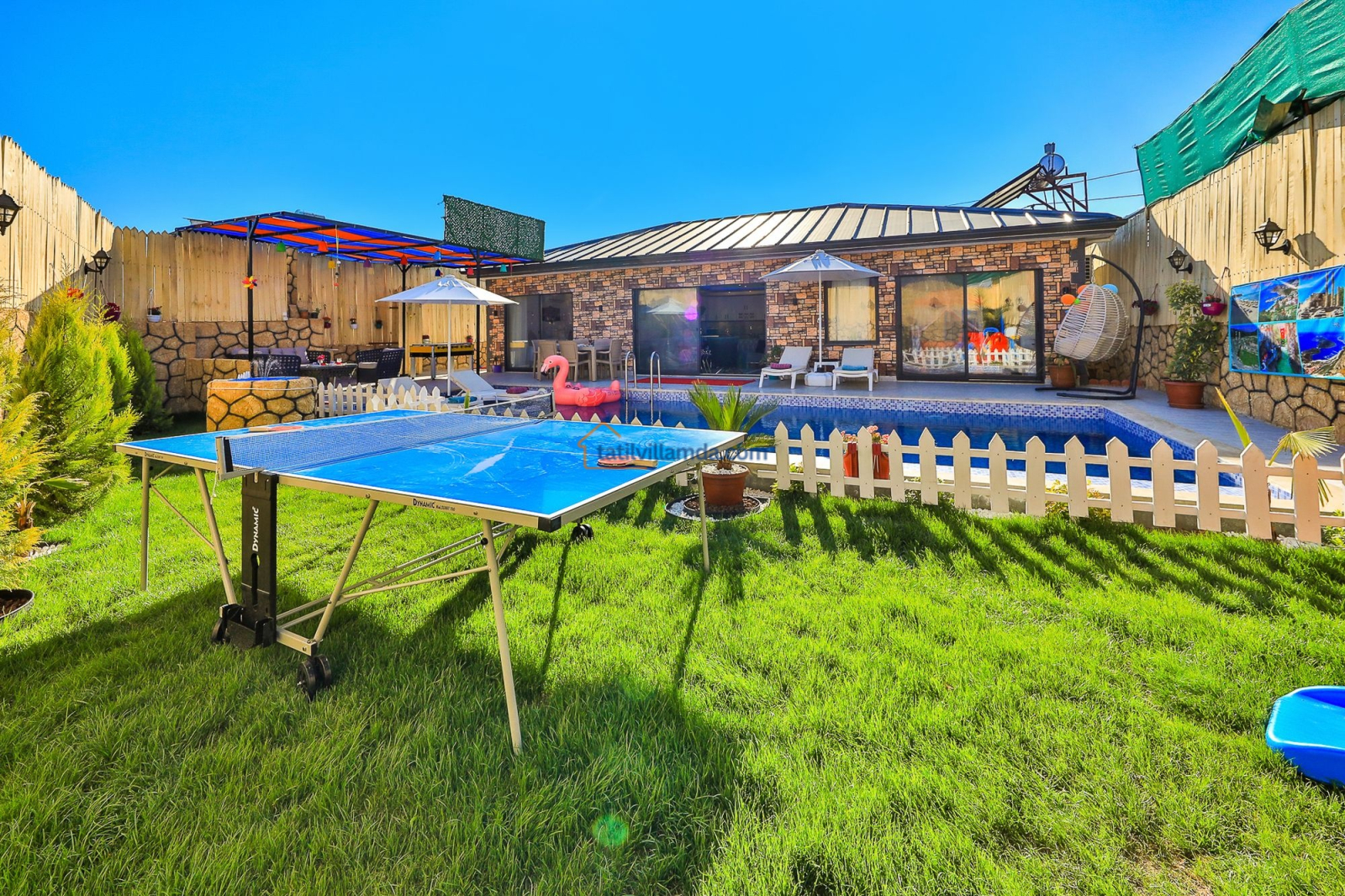 Dış alanı ise tatilin en huzurlu anlarını yaşamanız için tasarlanmıştır. Geniş havuz terasında şezlonglar, şemsiye, salıncak ve masa takımı yer alırken, günün her saatinde keyifli vakit geçirmenize olanak tanır. Bahçe kısmında ise bahçe oturma grubu, langırt, masa tenisi, trambolin ve çocuk oyun alanı gibi her yaşa hitap eden aktiviteler bulunmaktadır. Ayrıca geniş verandası, akşam serinliğinde sevdiklerinizle hoş sohbetler edebileceğiniz özel bir alan sunar.