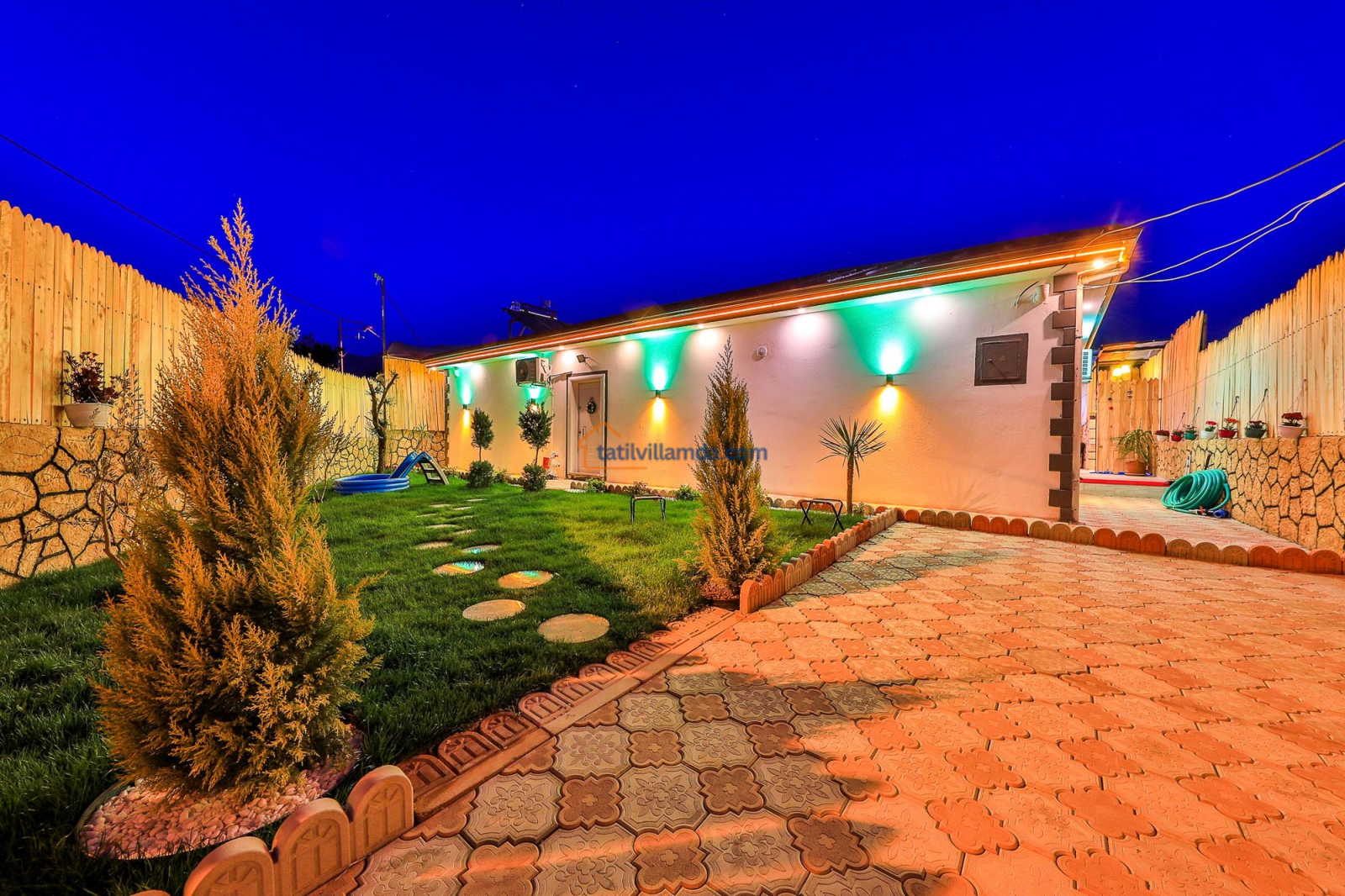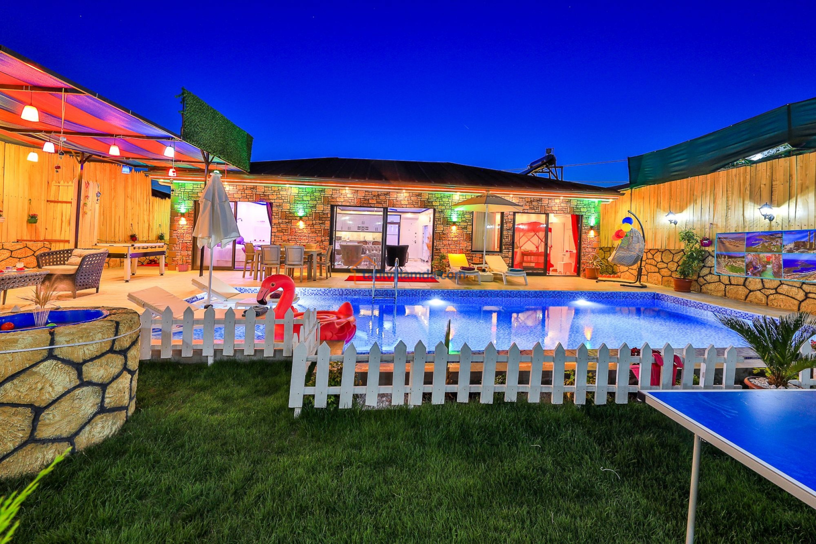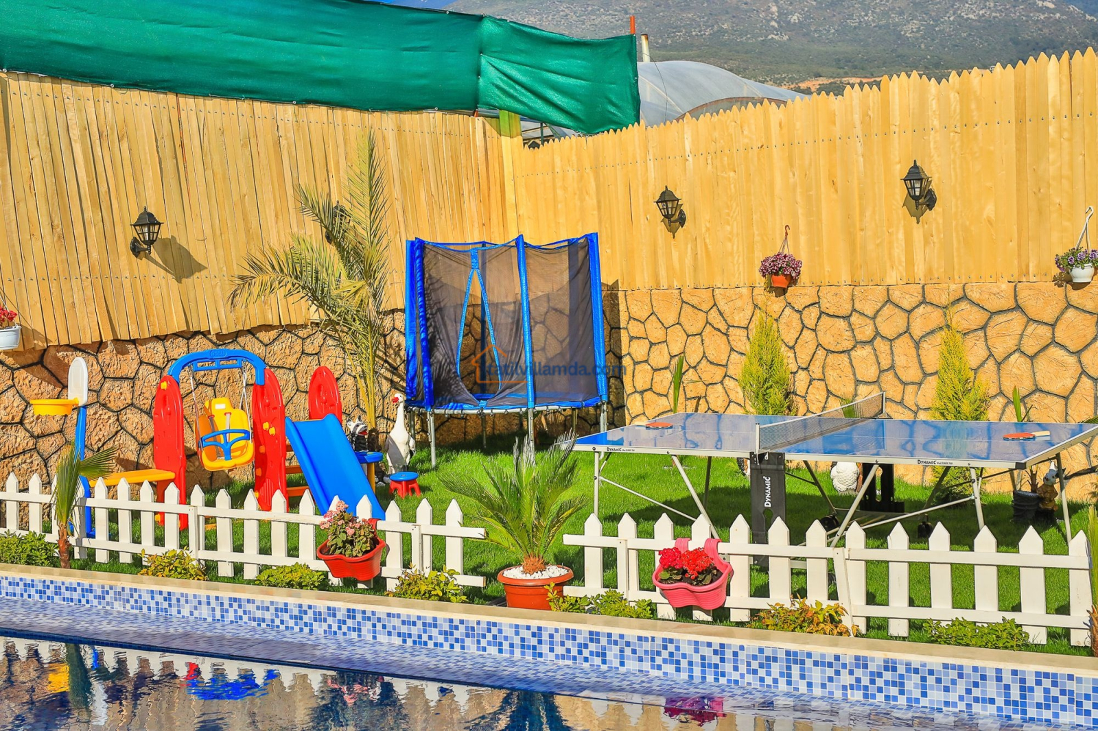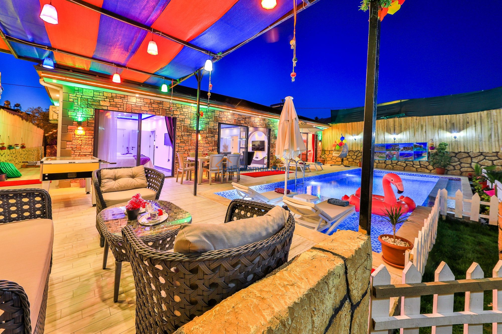 Dış alanı ise tatilin en huzurlu anlarını yaşamanız için tasarlanmıştır. Geniş havuz terasında şezlonglar, şemsiye, salıncak ve masa takımı yer alırken, günün her saatinde keyifli vakit geçirmenize olanak tanır. Bahçe kısmında ise bahçe oturma grubu, langırt, masa tenisi, trambolin ve çocuk oyun alanı gibi her yaşa hitap eden aktiviteler bulunmaktadır. Ayrıca geniş verandası, akşam serinliğinde sevdiklerinizle hoş sohbetler edebileceğiniz özel bir alan sunar.
