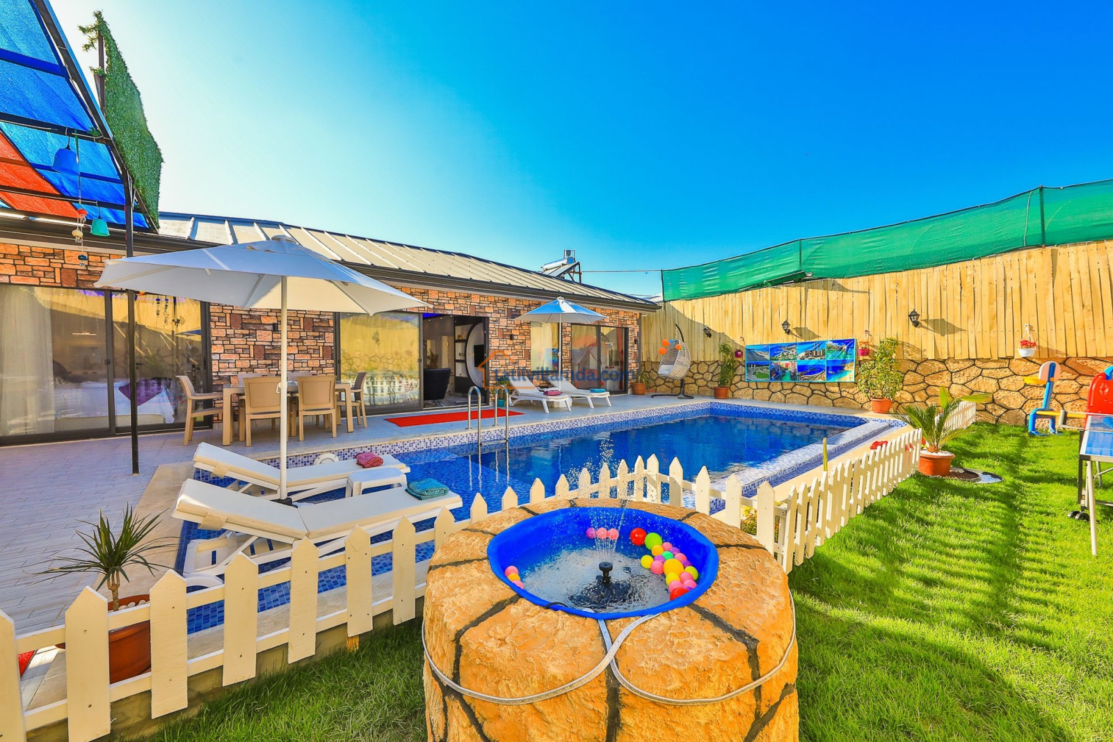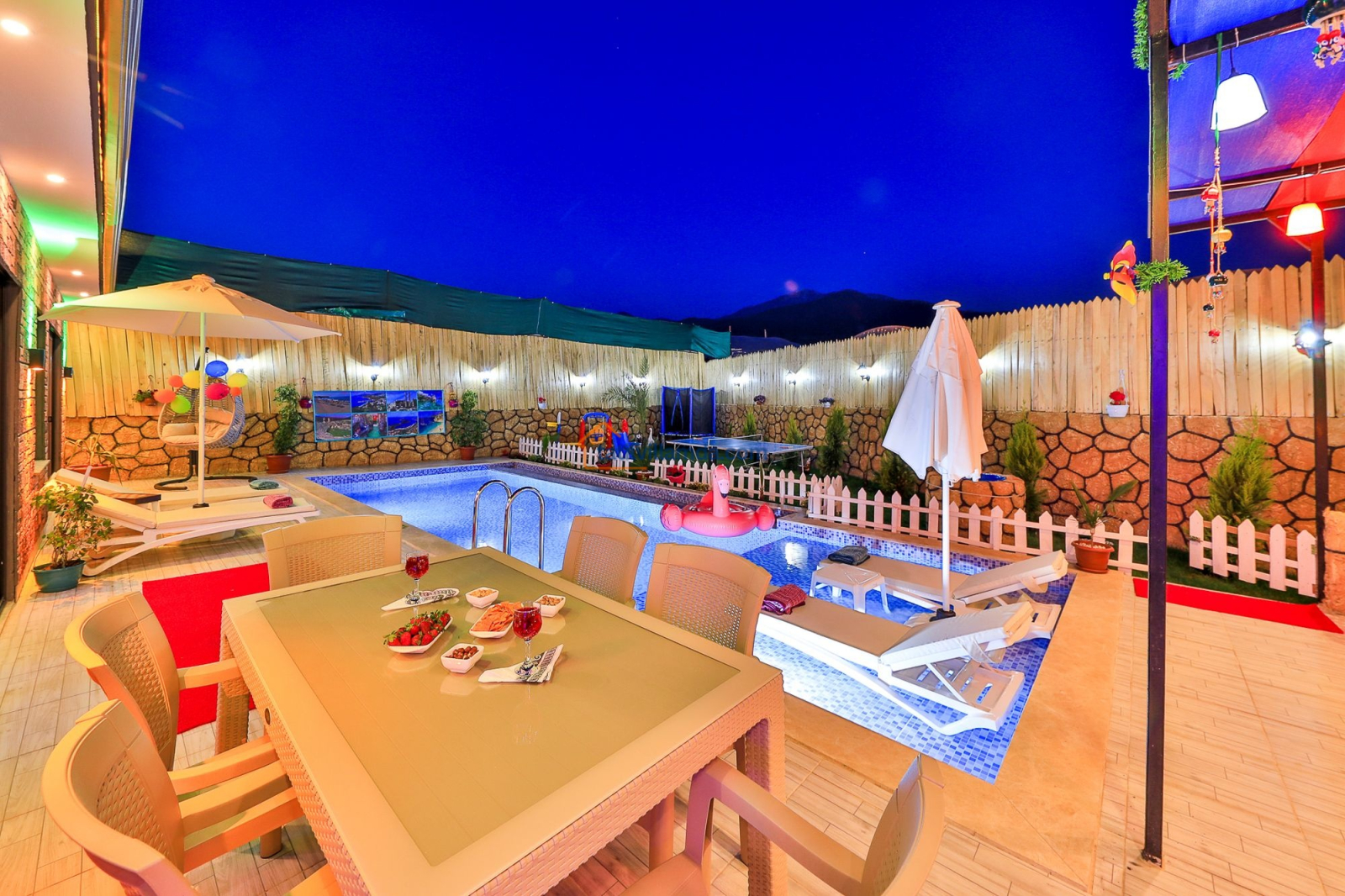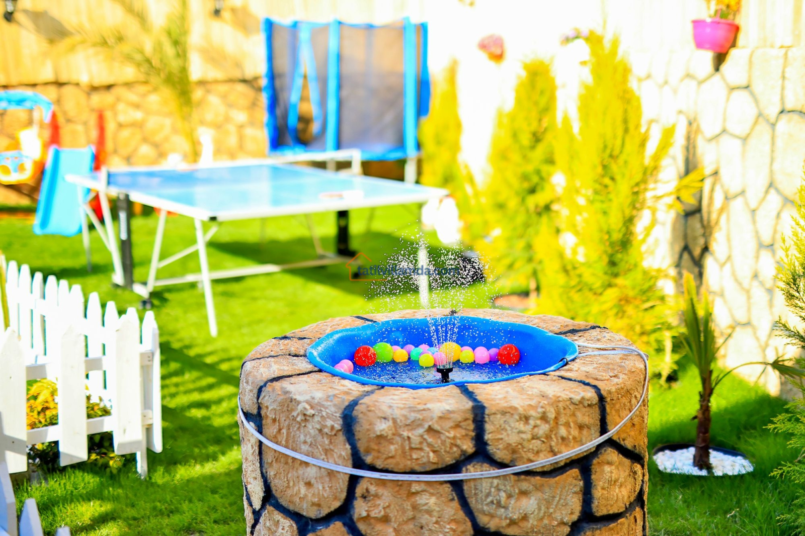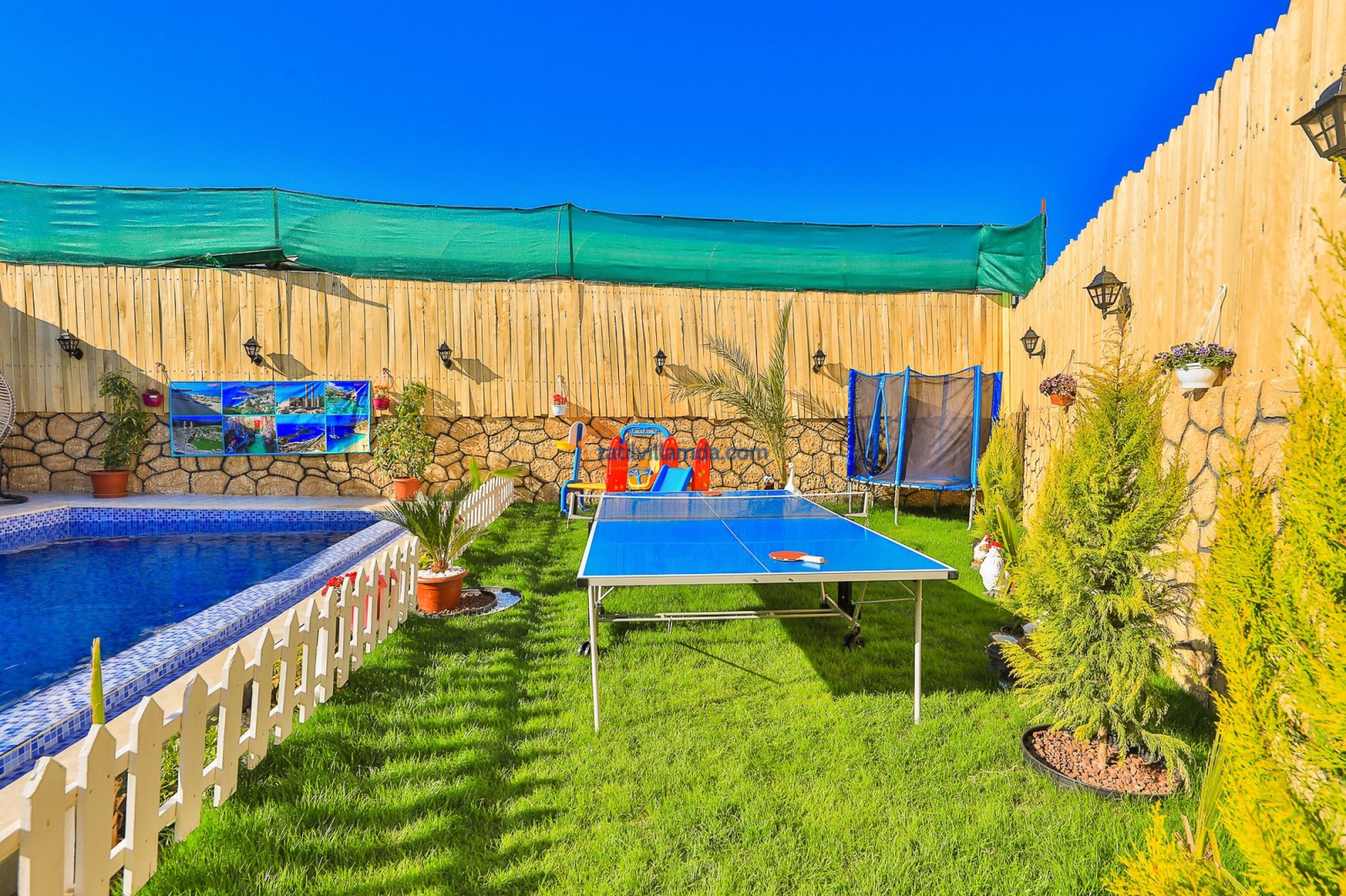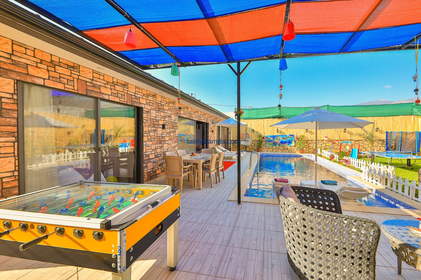 Dış alanı ise tatilin en huzurlu anlarını yaşamanız için tasarlanmıştır. Geniş havuz terasında şezlonglar, şemsiye, salıncak ve masa takımı yer alırken, günün her saatinde keyifli vakit geçirmenize olanak tanır. Bahçe kısmında ise bahçe oturma grubu, langırt, masa tenisi, trambolin ve çocuk oyun alanı gibi her yaşa hitap eden aktiviteler bulunmaktadır. Ayrıca geniş verandası, akşam serinliğinde sevdiklerinizle hoş sohbetler edebileceğiniz özel bir alan sunar.