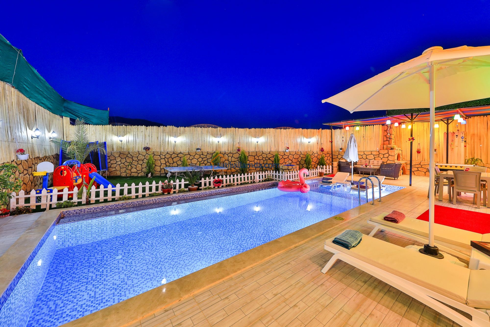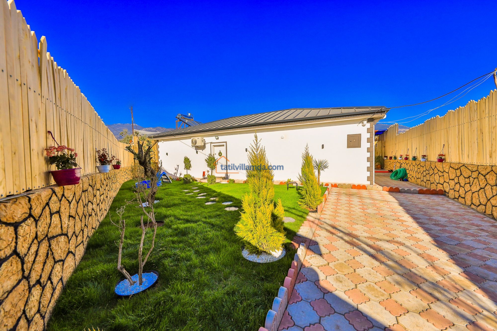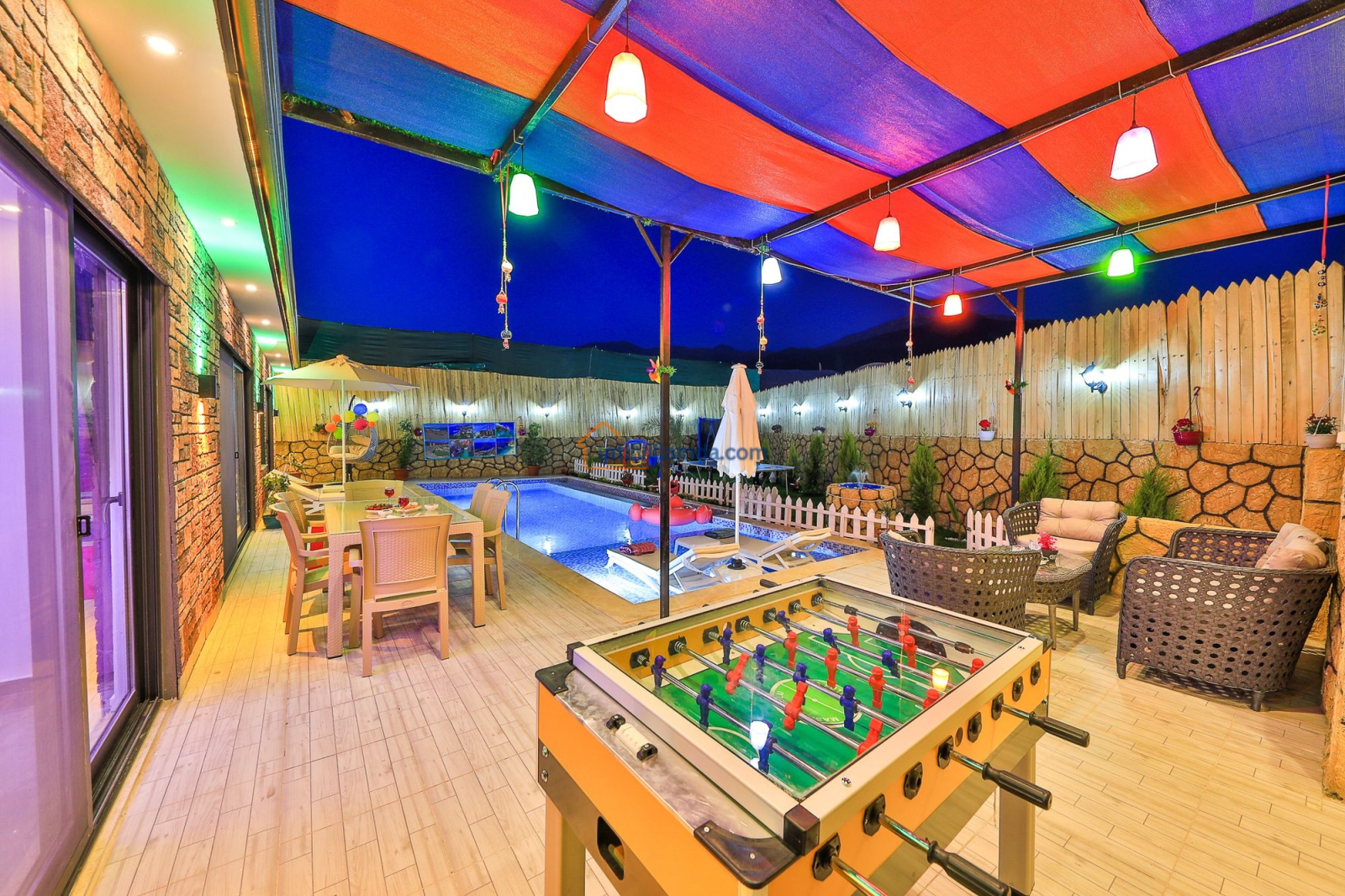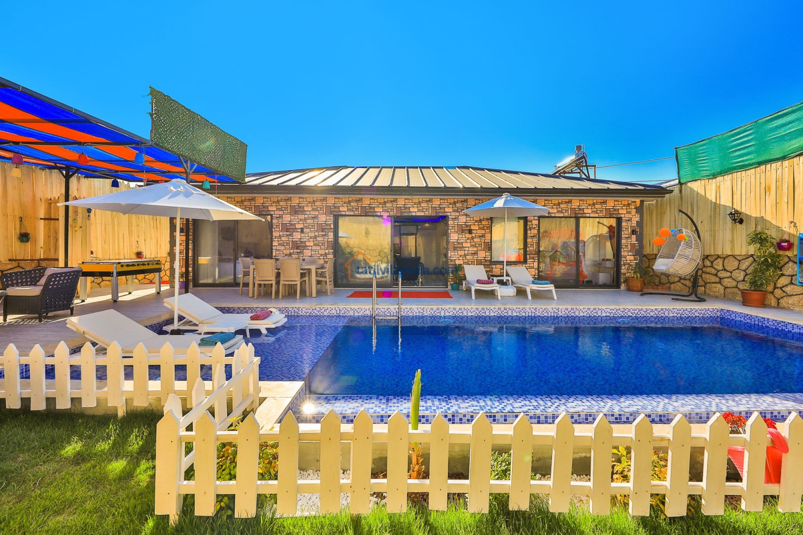 Dış alanı ise tatilin en huzurlu anlarını yaşamanız için tasarlanmıştır. Geniş havuz terasında şezlonglar, şemsiye, salıncak ve masa takımı yer alırken, günün her saatinde keyifli vakit geçirmenize olanak tanır. Bahçe kısmında ise bahçe oturma grubu, langırt, masa tenisi, trambolin ve çocuk oyun alanı gibi her yaşa hitap eden aktiviteler bulunmaktadır. Ayrıca geniş verandası, akşam serinliğinde sevdiklerinizle hoş sohbetler edebileceğiniz özel bir alan sunar.