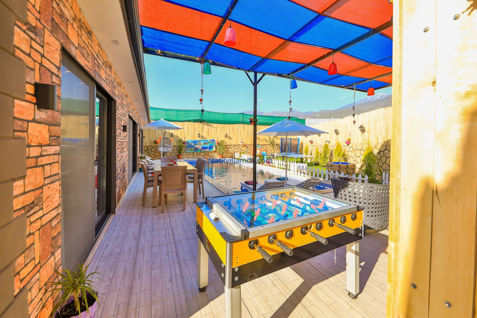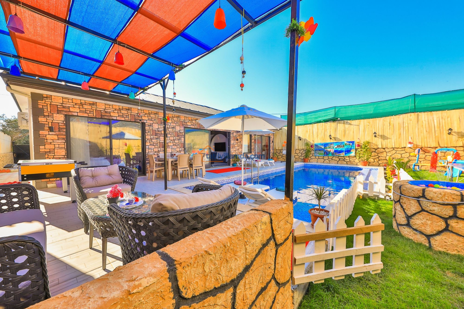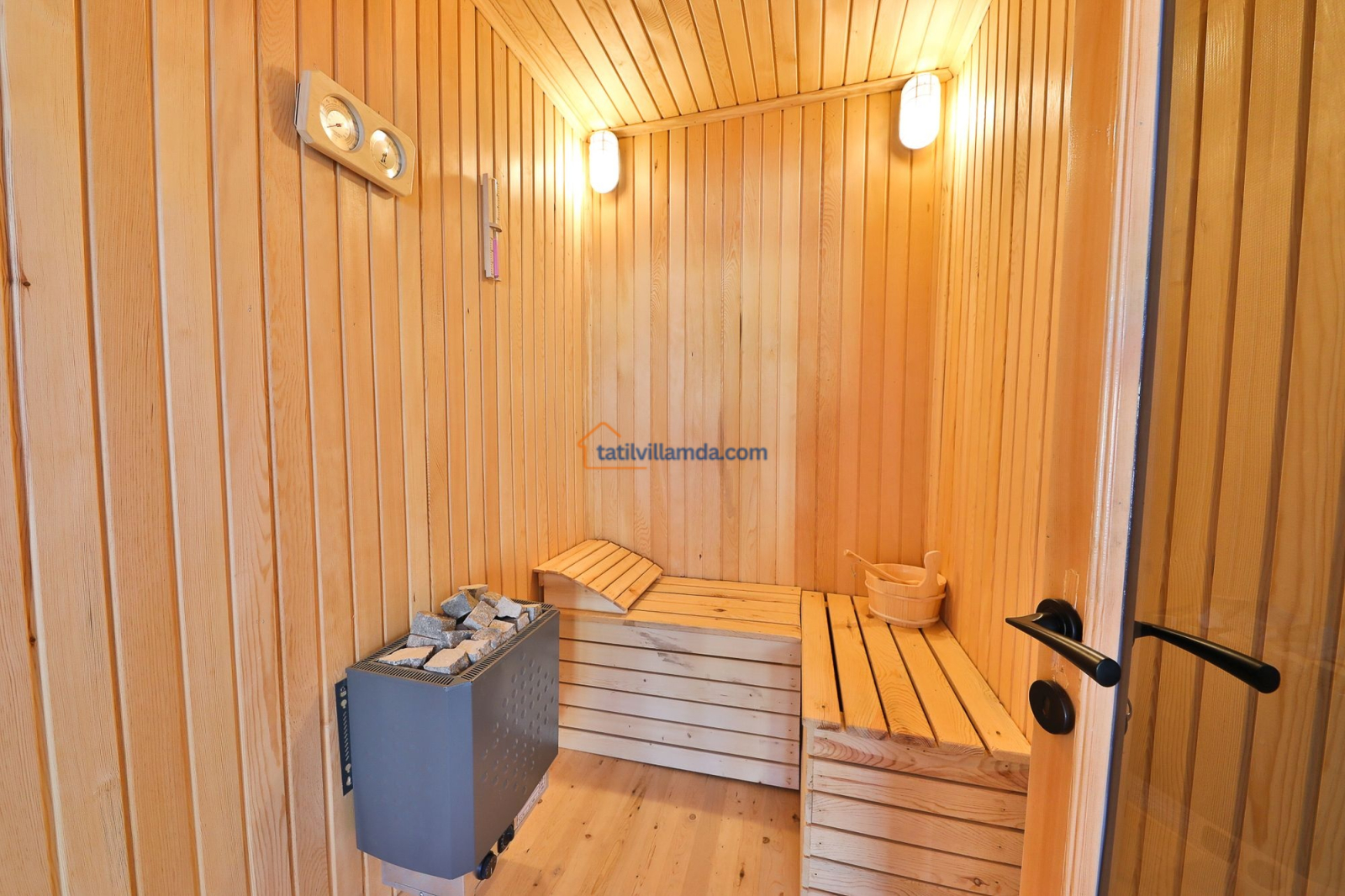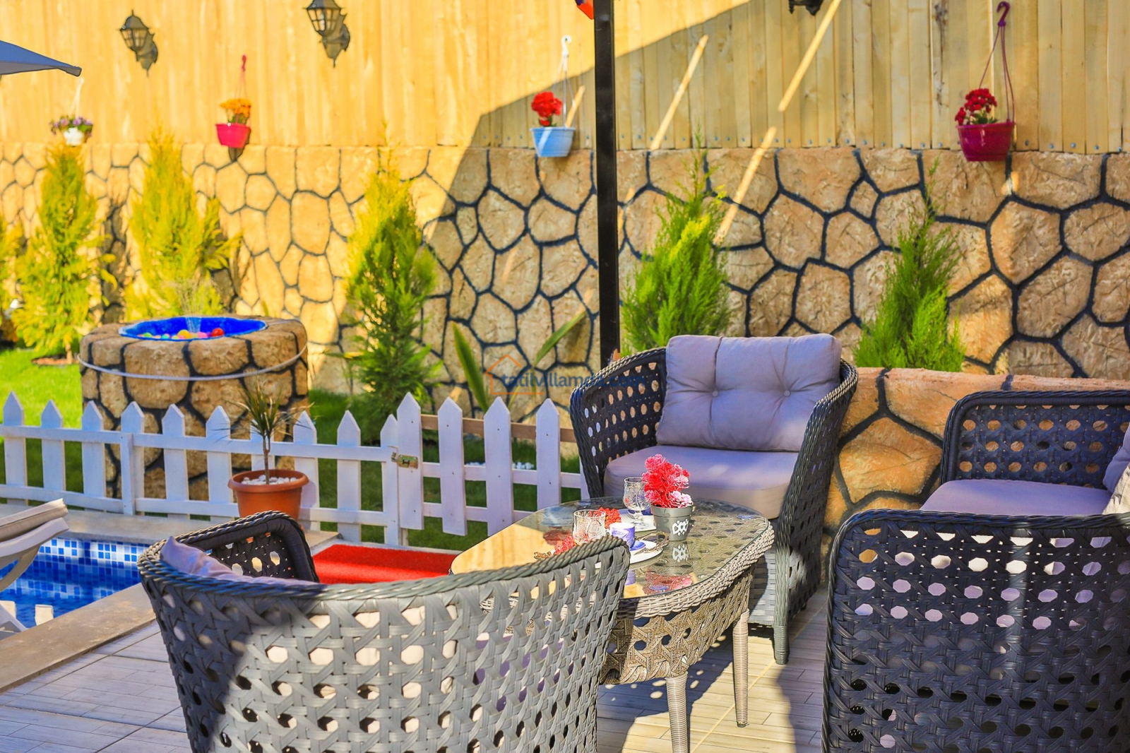 Dış alanı ise tatilin en huzurlu anlarını yaşamanız için tasarlanmıştır. Geniş havuz terasında şezlonglar, şemsiye, salıncak ve masa takımı yer alırken, günün her saatinde keyifli vakit geçirmenize olanak tanır. Bahçe kısmında ise bahçe oturma grubu, langırt, masa tenisi, trambolin ve çocuk oyun alanı gibi her yaşa hitap eden aktiviteler bulunmaktadır. Ayrıca geniş verandası, akşam serinliğinde sevdiklerinizle hoş sohbetler edebileceğiniz özel bir alan sunar.