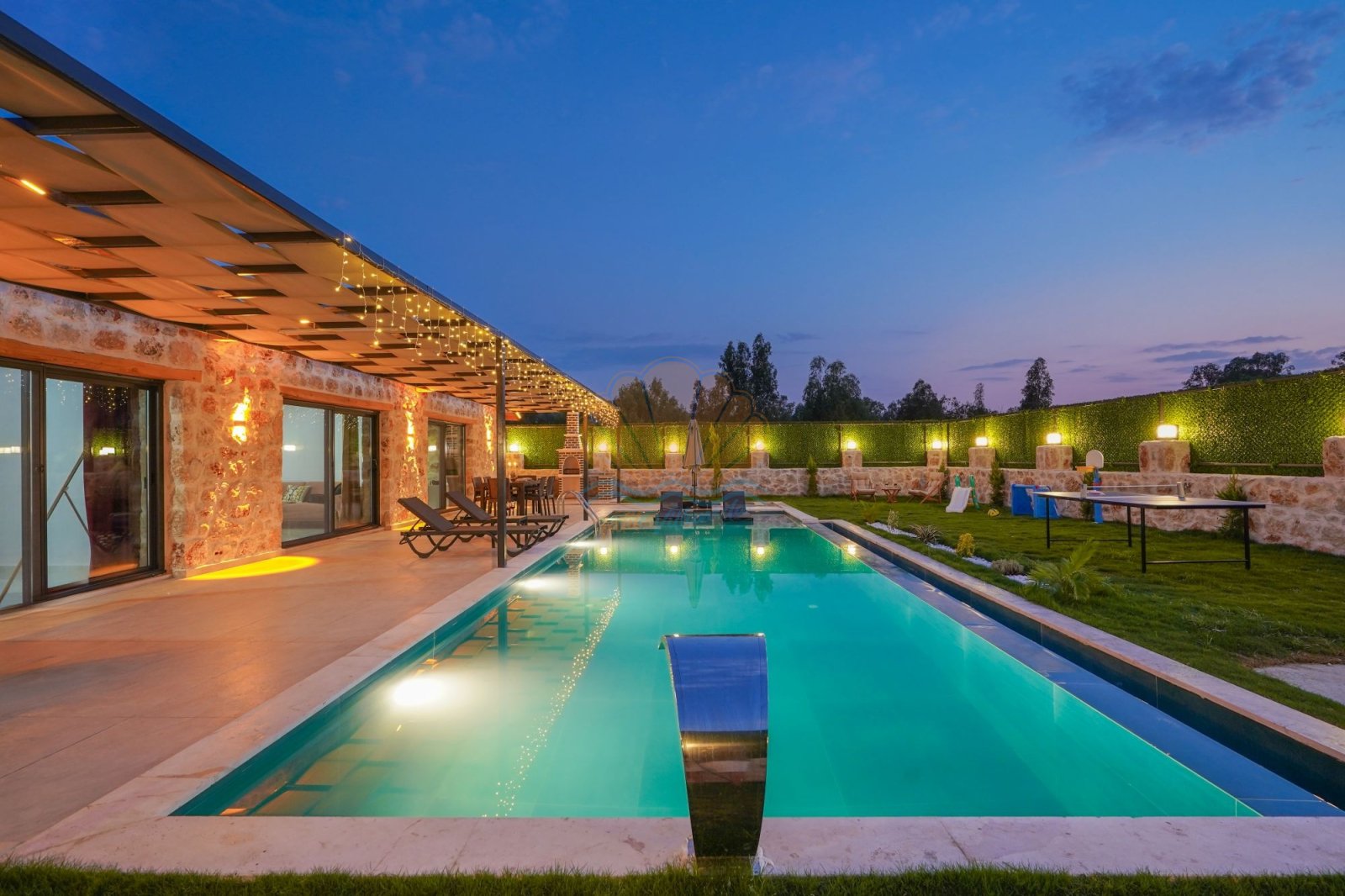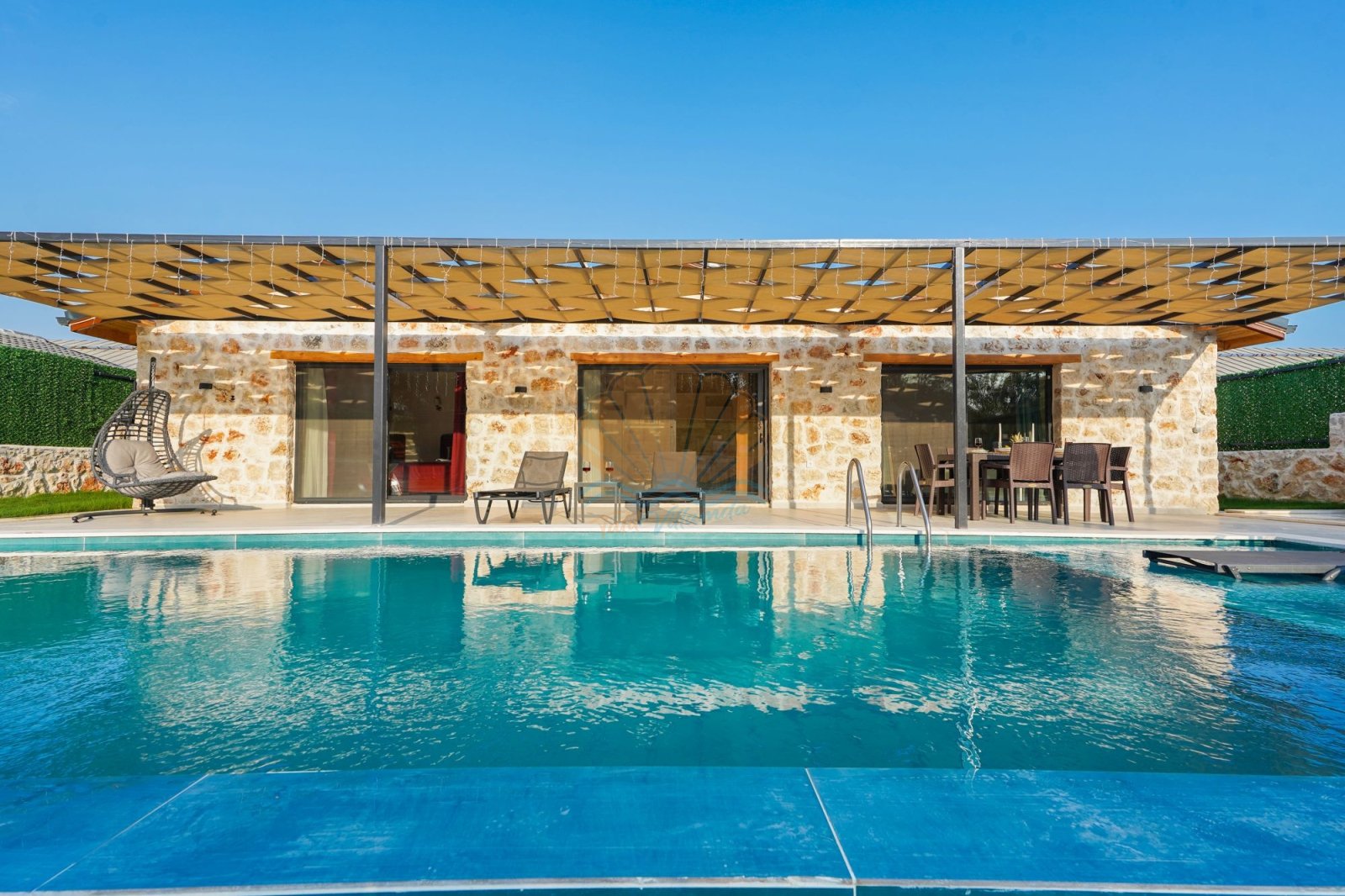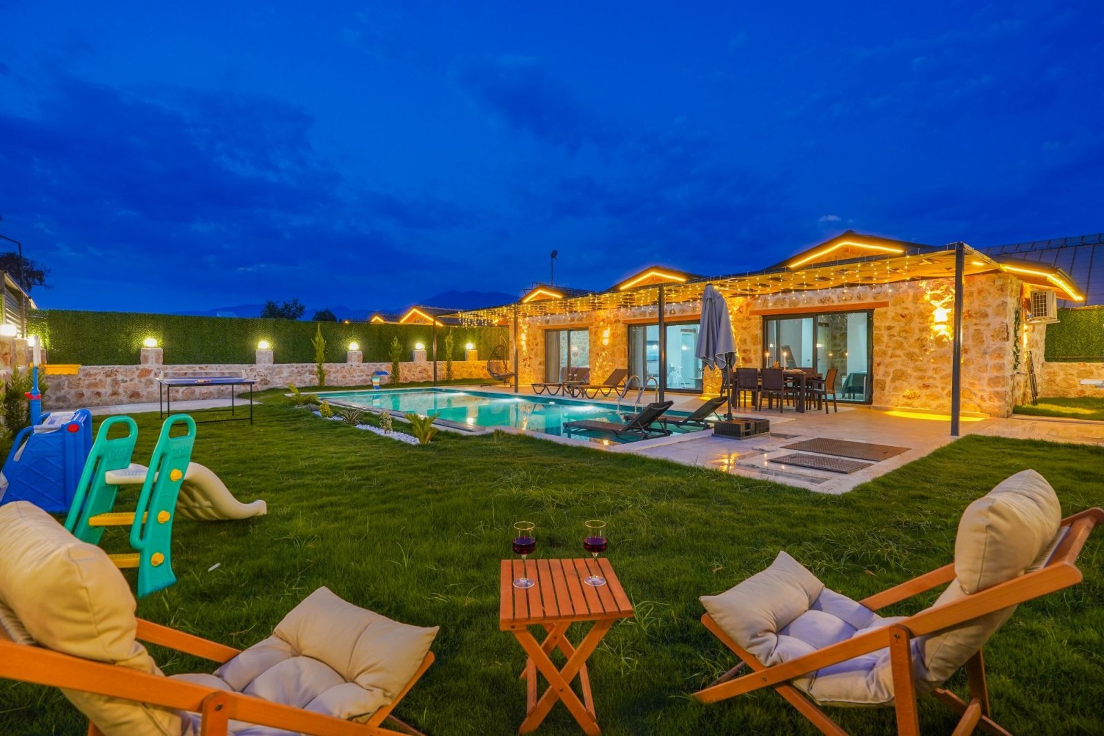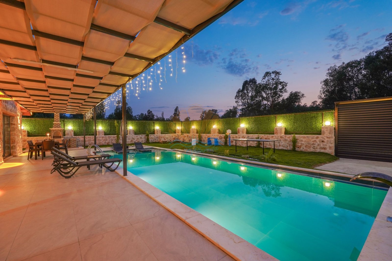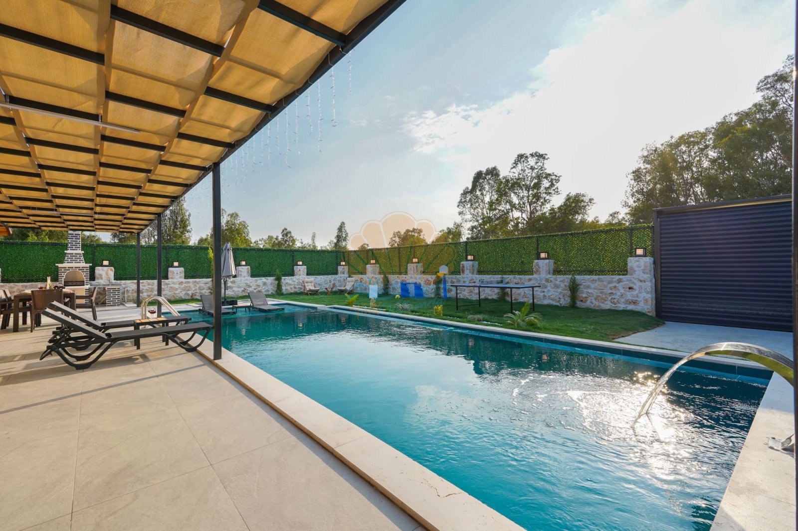 Villanın korunaklı ve geniş yüzme havuzu, gün boyu özgürce yüzmenin ve güneşin tadını çıkarmanın keyfini yaşatır. Havuz başında yer alan şezlonglar, şemsiye ve salıncak, tatilinize dingin anlar katar. Bahçede bulunan masa takımı ve barbekü alanı ise sevdiklerinizle birlikte keyifli akşam yemekleri için sıcak bir atmosfer sunar. Jakuzili yatak odası, günün yorgunluğunu atmanız ve kendinizi şımartmanız için özel olarak düşünülmüştür.