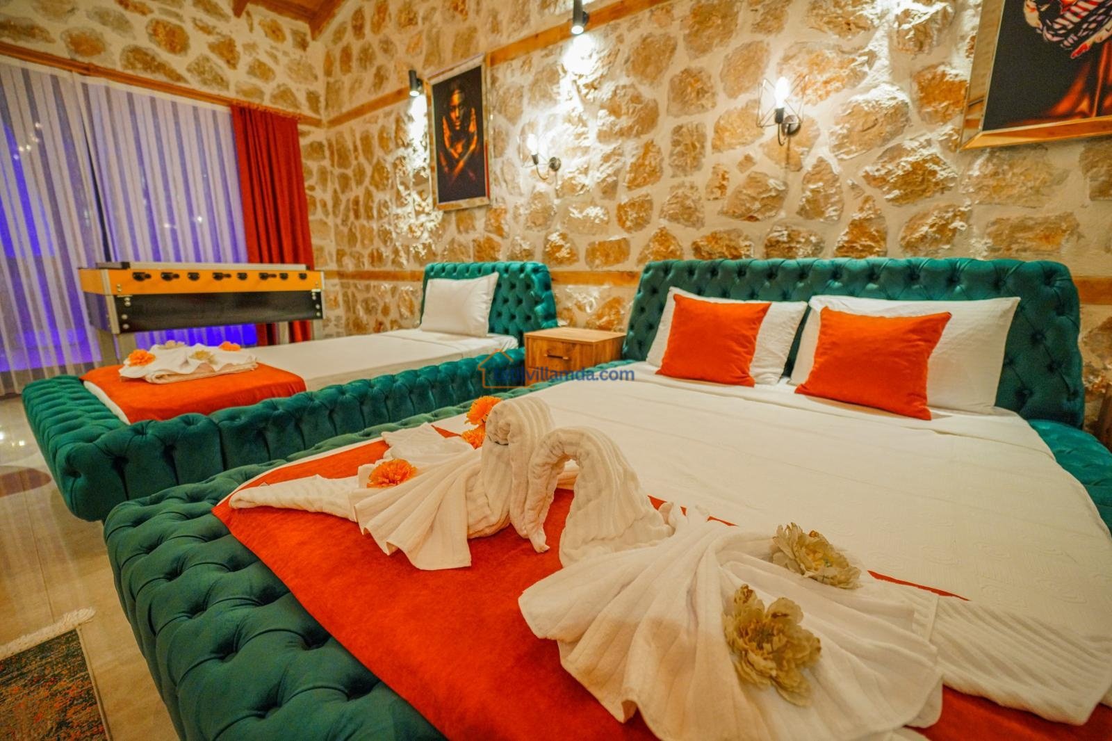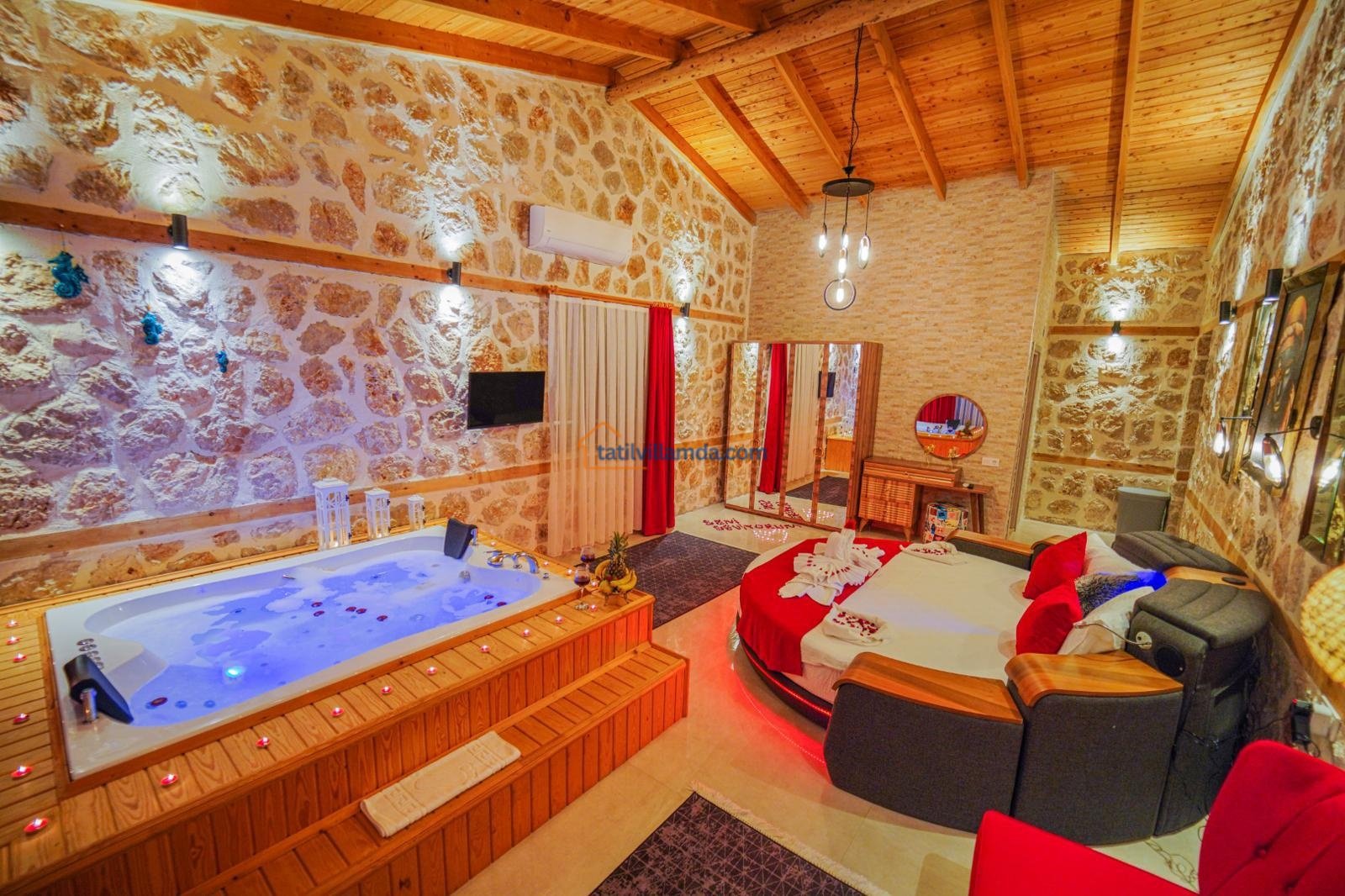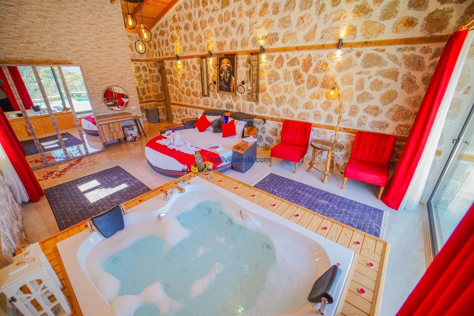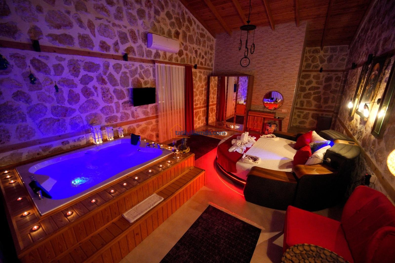 Toplamda 2 yatak odasına sahip olan villa 5 kişilik konaklama kapasitesine sahiptir. Bir yatak odasında konforlu çift kişilik yatak, diğer odada ise bir adet çift kişilik ve bir adet tek kişilik yatak bulunmaktadır. Ayrıca villada tatilin keyfini ikiye katlayan jakuzili banyo da mevcuttur. Tüm odalar ferah, aydınlık ve özenle dizayn edilmiştir.
