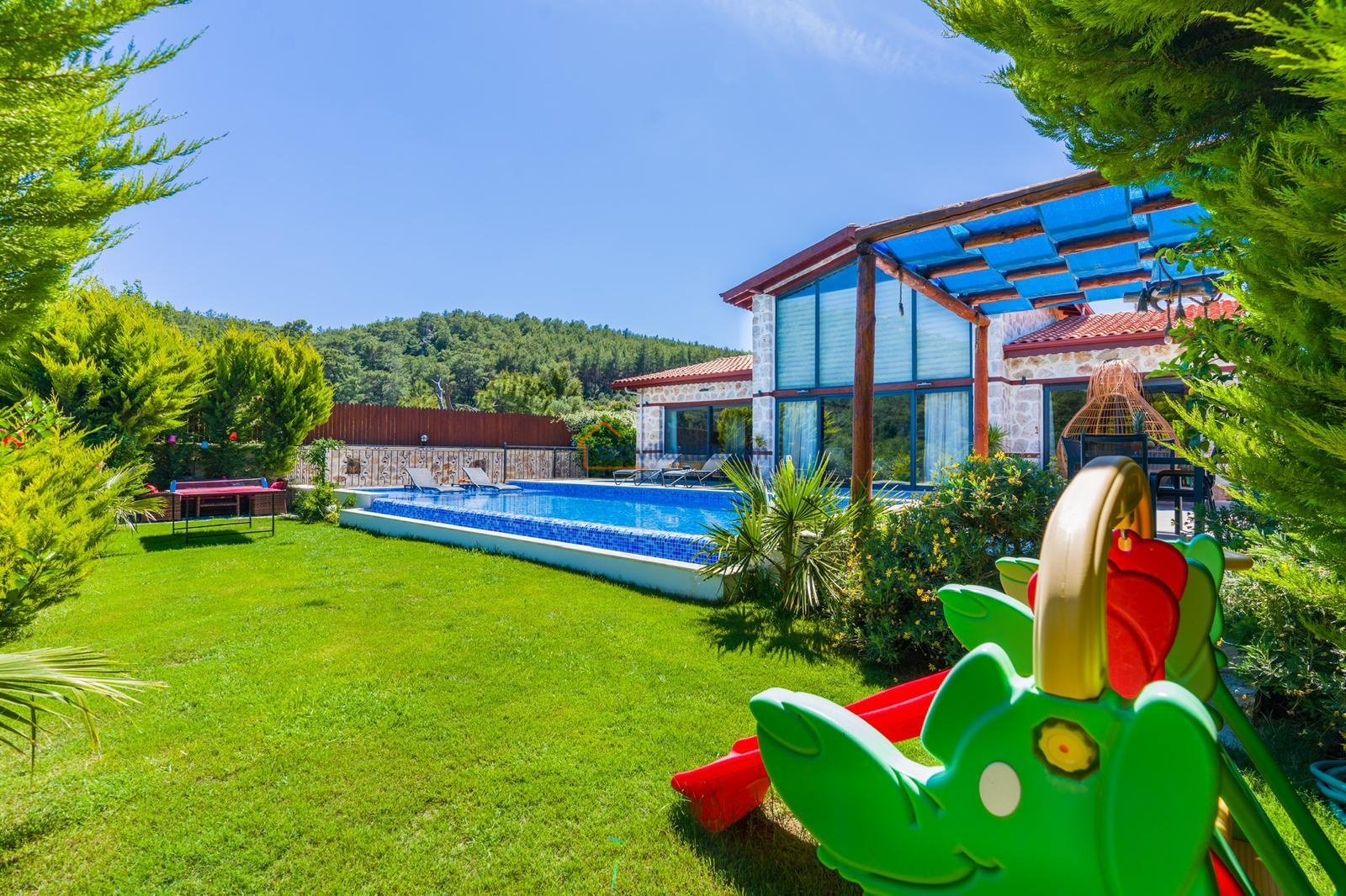 Geniş bahçe alanında misafirlerin keyifle vakit geçirebileceği birçok olanak yer almaktadır. Havuz başında şezlong, şemsiye ve masa takımı, akşam yemekleri için barbekü alanı, eğlenceli anlar için masa tenisi ve langırt, dinlenmek isteyenler için salıncak ve bahçe oturma grubu, çocuklar için ise mini oyun alanı bulunmaktadır.