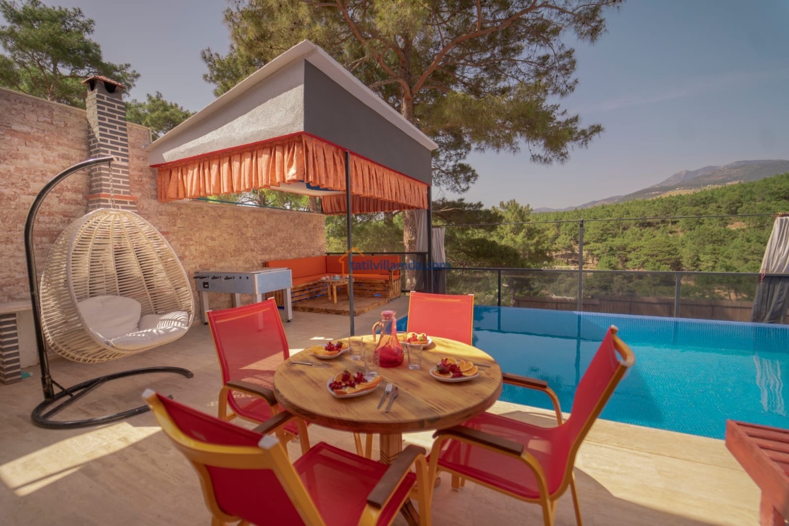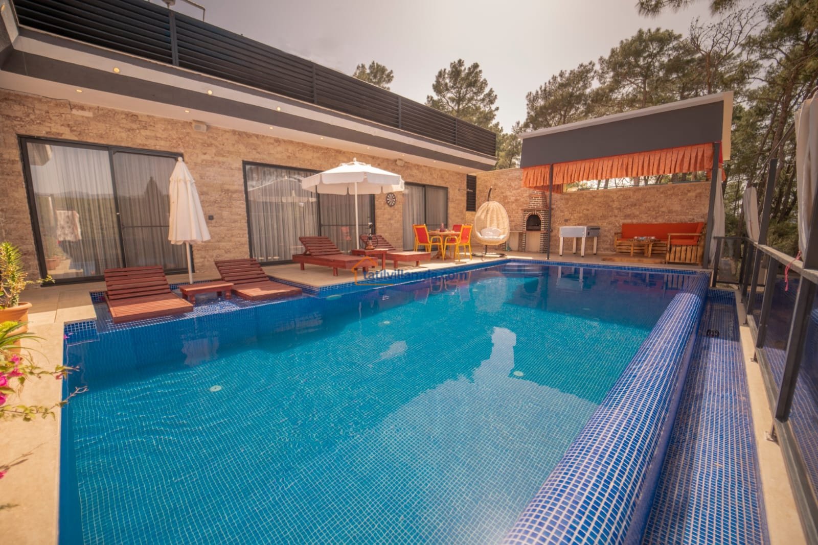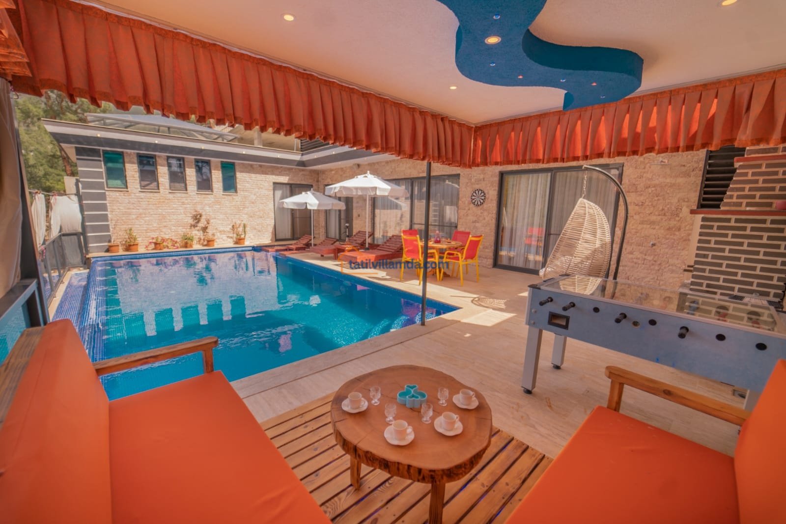 Korunaklı ve geniş yüzme havuzu, günün her saatinde özgürce yüzebilmeniz için ideal bir alan oluşturur. Havuz başında yer alan şezlonglar, şemsiye ve salıncak; güneşin tadını çıkarırken ya da gölgede kitabınızı okurken keyfinizi tamamlar. Barbekü alanı ve masa takımı, sevdiklerinizle paylaşacağınız uzun akşam yemeklerine ev sahipliği yaparken, çardaklı oturma grubu sohbetlerin en samimi durağı olur. Eğlenceyi sevenler için langırt detayı da villaya sıcak ve neşeli bir hava katar.