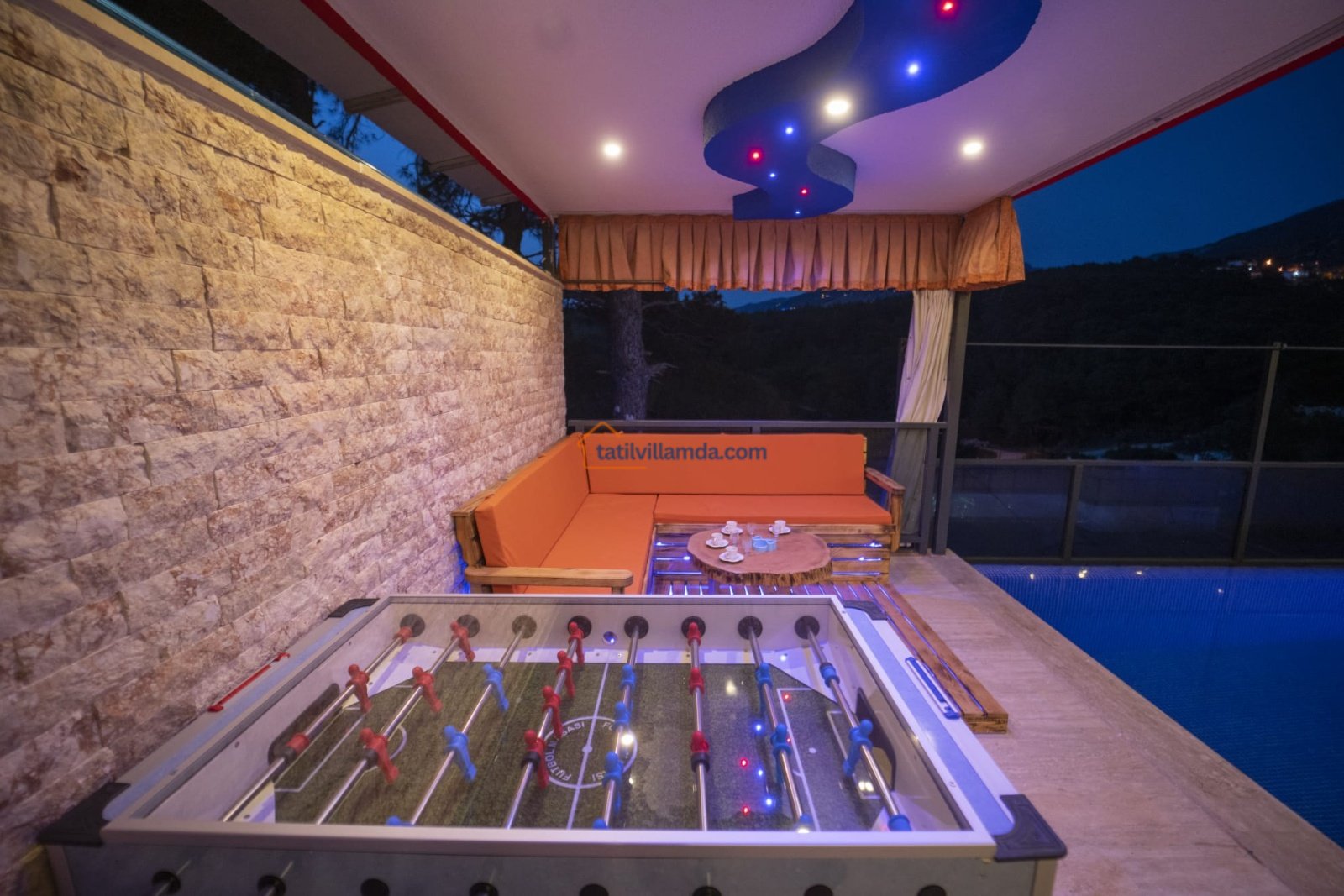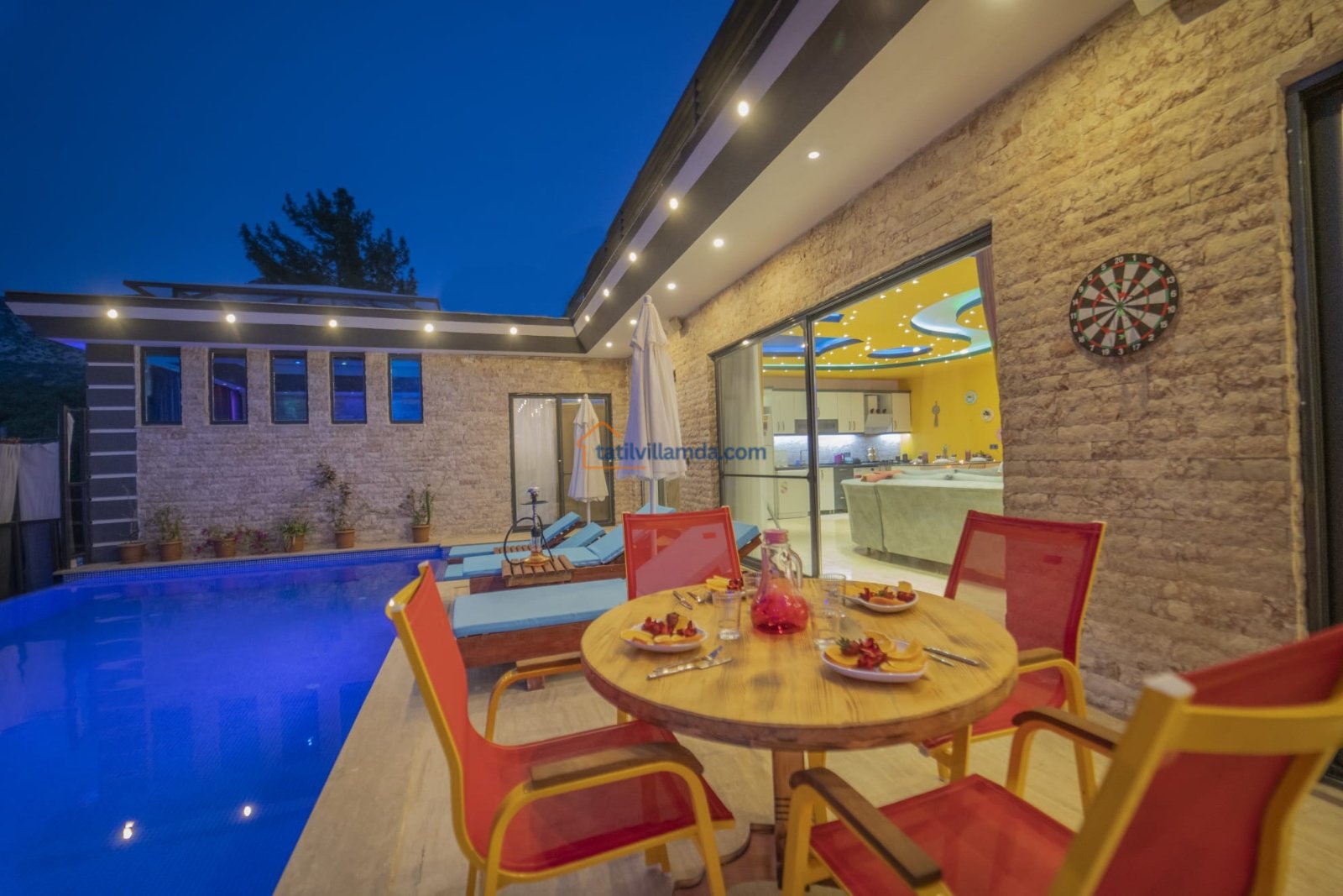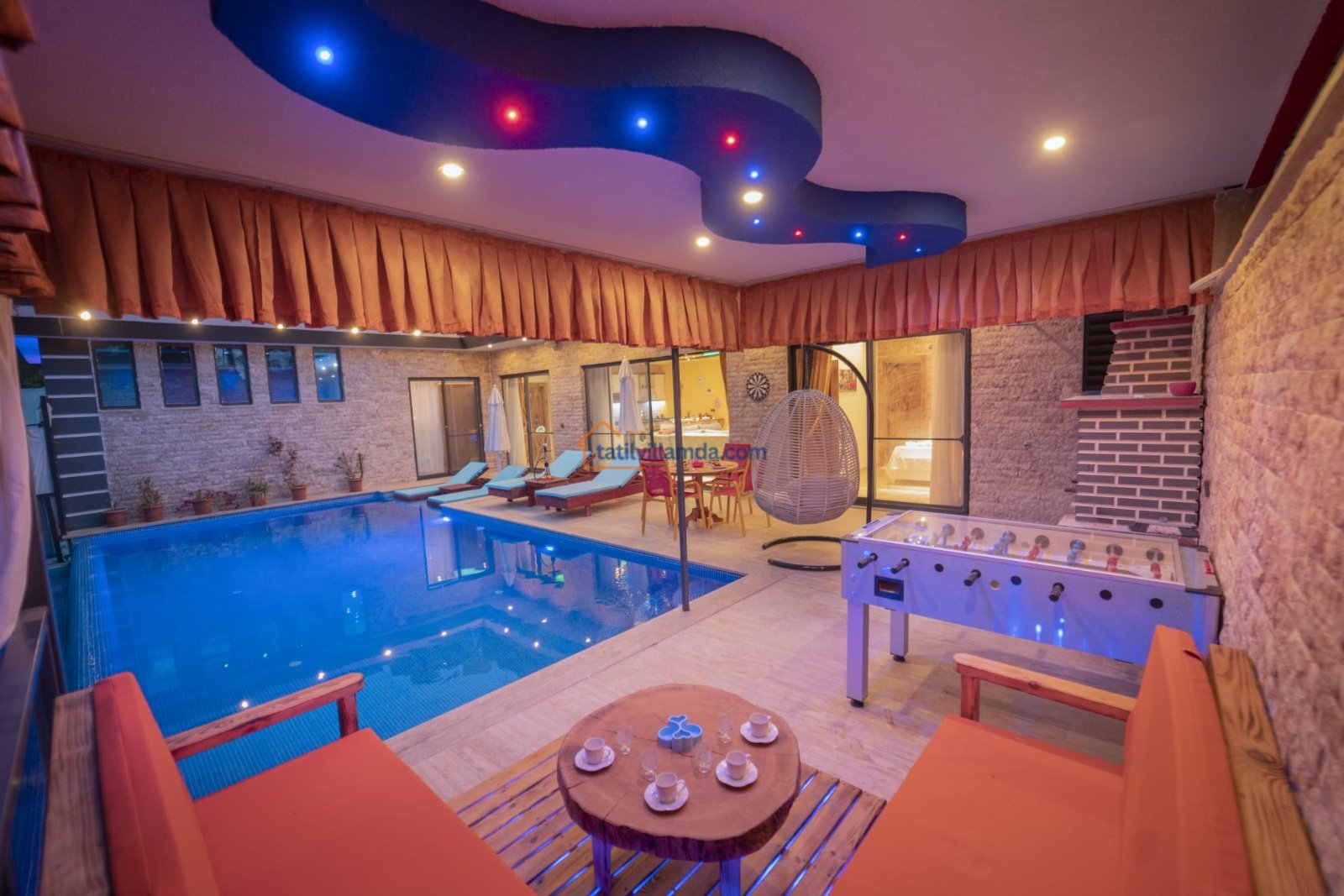 Korunaklı ve geniş yüzme havuzu, günün her saatinde özgürce yüzebilmeniz için ideal bir alan oluşturur. Havuz başında yer alan şezlonglar, şemsiye ve salıncak; güneşin tadını çıkarırken ya da gölgede kitabınızı okurken keyfinizi tamamlar. Barbekü alanı ve masa takımı, sevdiklerinizle paylaşacağınız uzun akşam yemeklerine ev sahipliği yaparken, çardaklı oturma grubu sohbetlerin en samimi durağı olur. Eğlenceyi sevenler için langırt detayı da villaya sıcak ve neşeli bir hava katar.