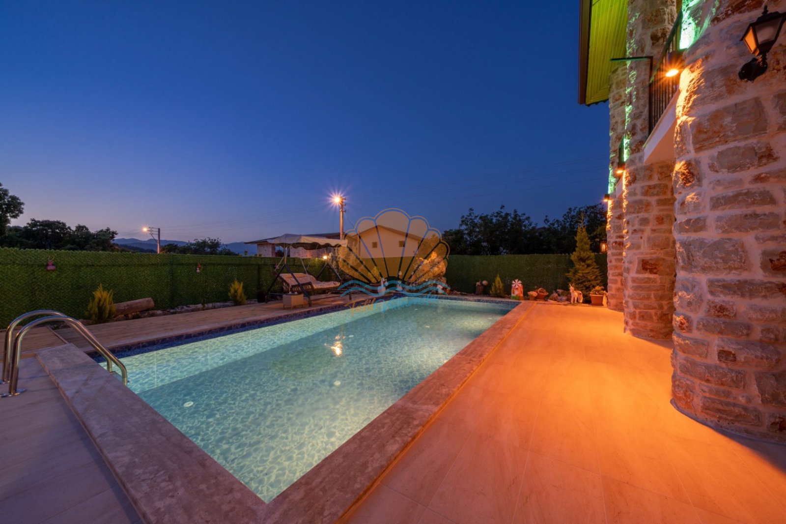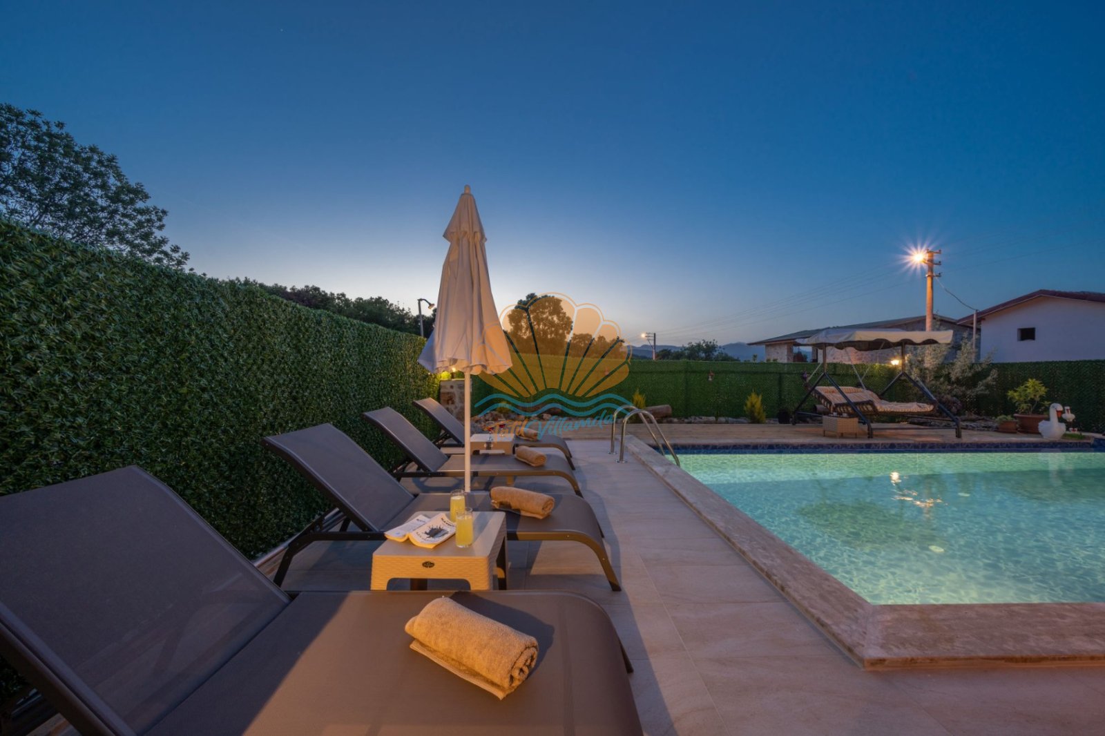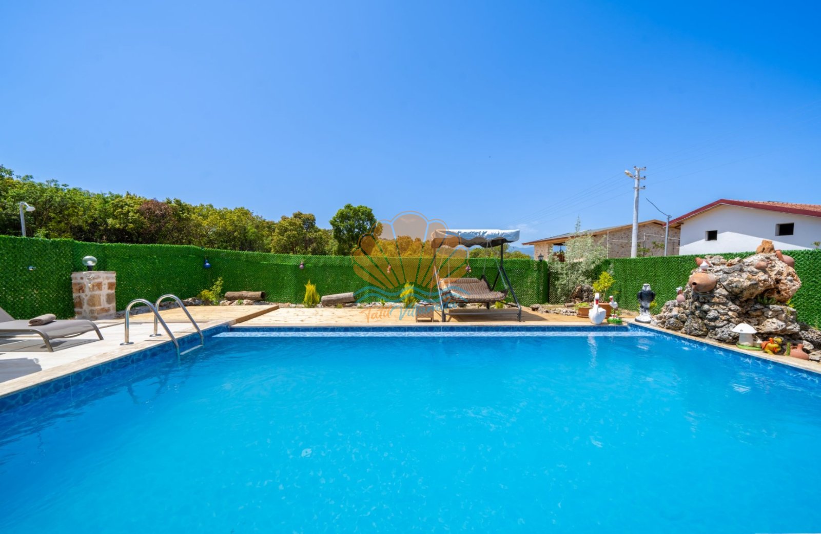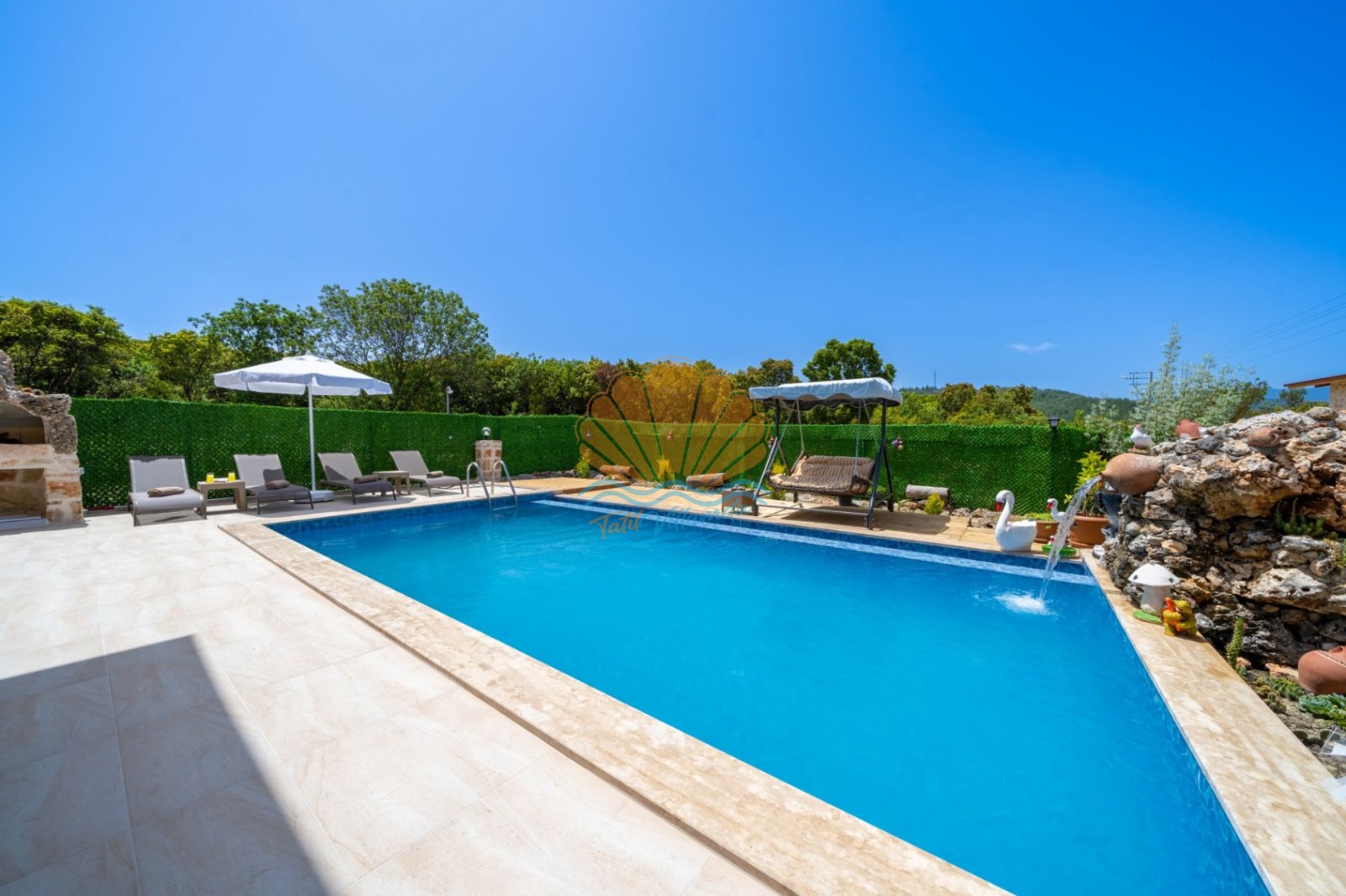 Villa Güneş’in geniş ve özel tasarımlı bahçesi, günün her saatinde keyifle vakit geçirmenize olanak tanır. Bahçede yer alan salıncak, oturma grubu ve barbekü alanı, özellikle akşam saatlerinde sevdiklerinizle hoş sohbetler eşliğinde unutulmaz anlar yaşamanıza imkân sunar. Havuz başında bulunan şezlong ve şemsiye ile güneşin tadını çıkarabilir, doğanın sakinliği içinde dinlenebilirsiniz.