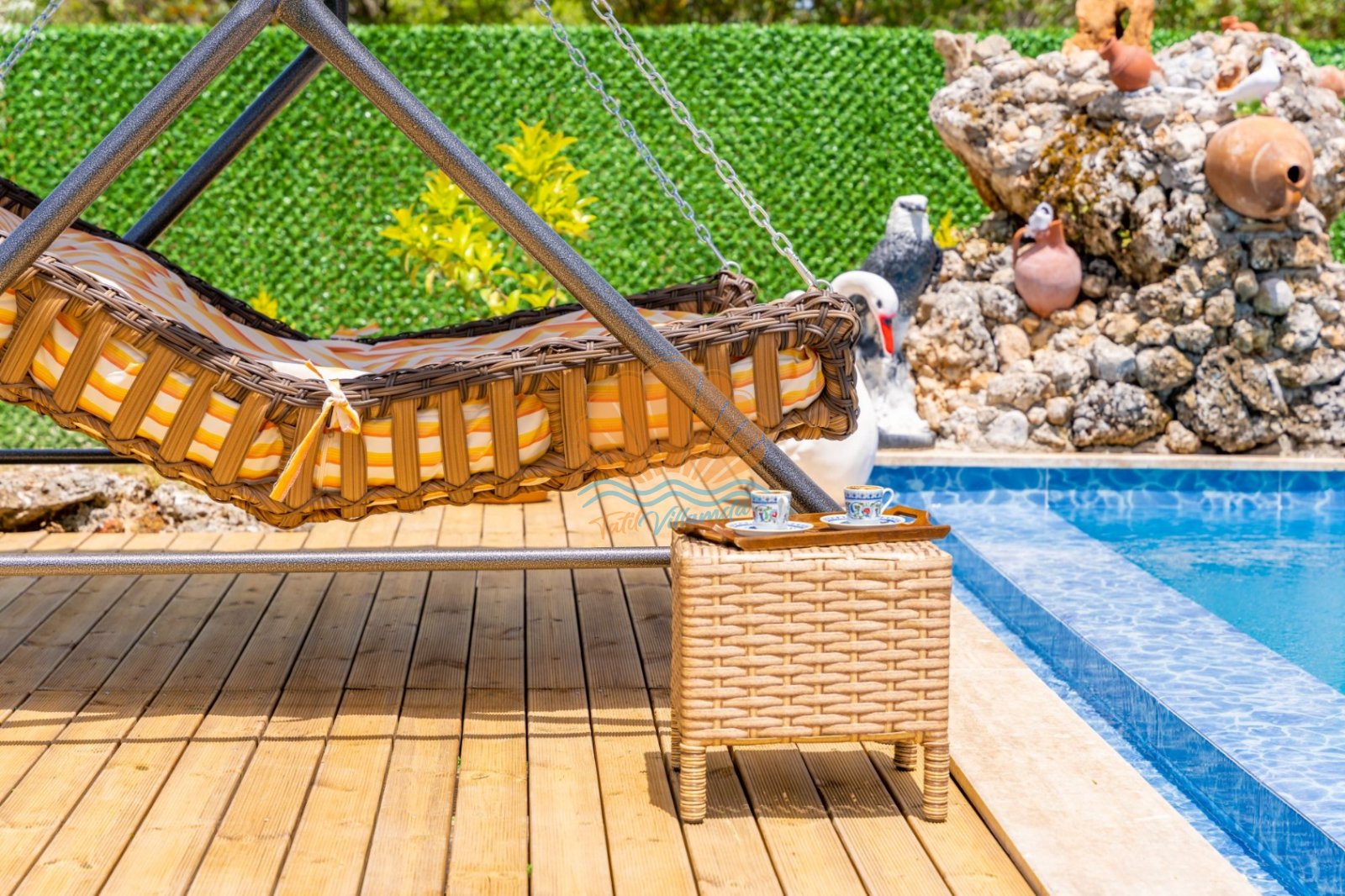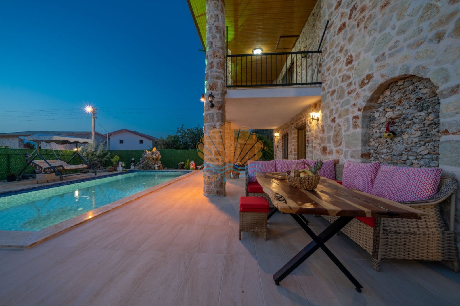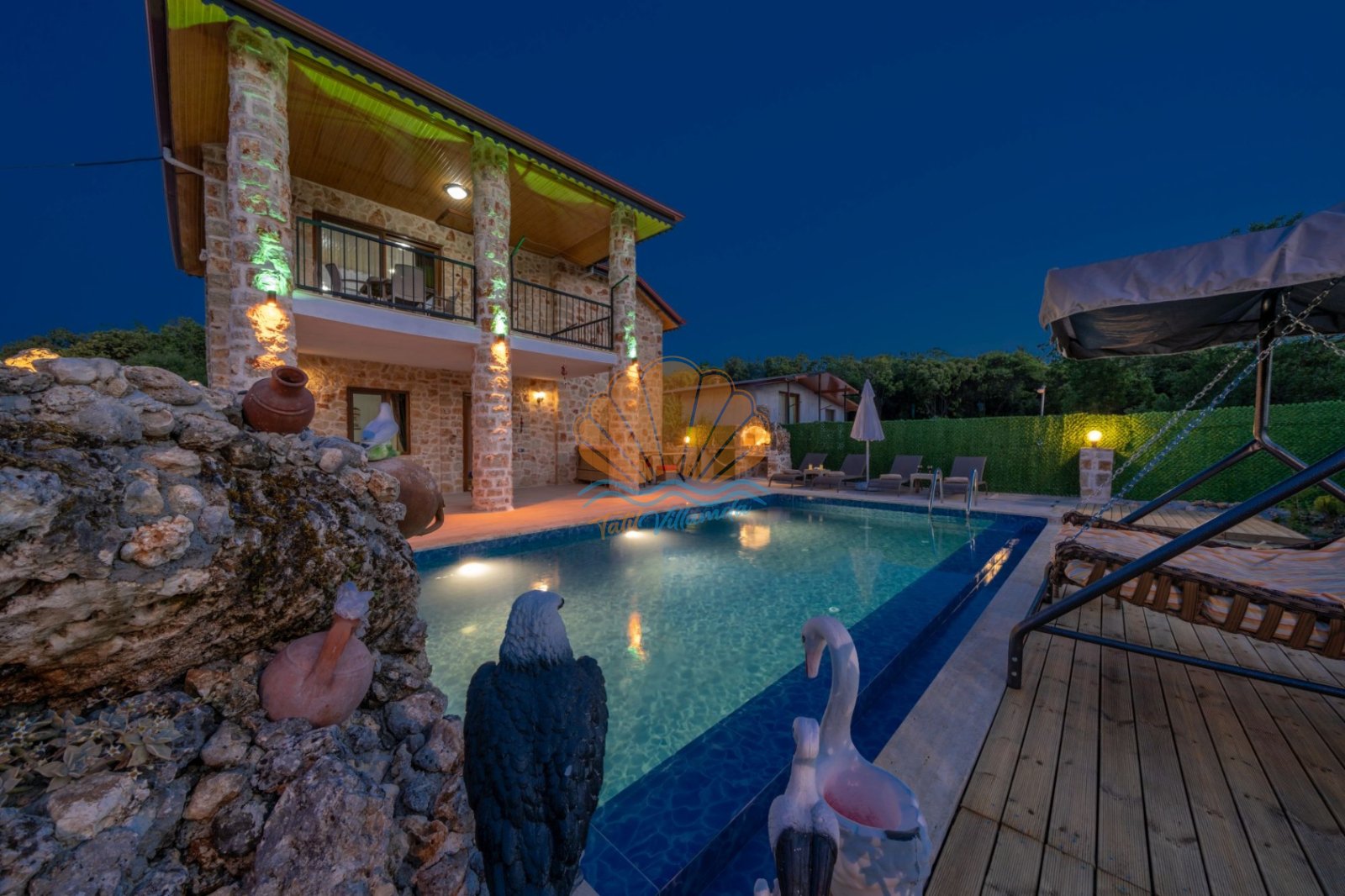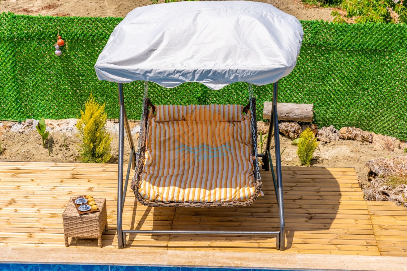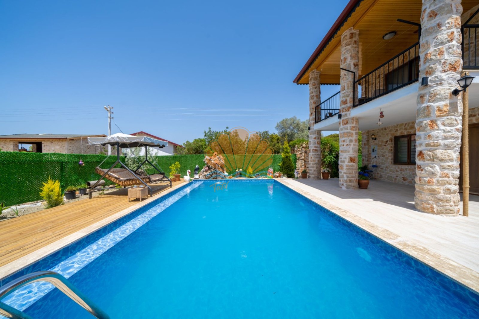 Villa Güneş’in geniş ve özel tasarımlı bahçesi, günün her saatinde keyifle vakit geçirmenize olanak tanır. Bahçede yer alan salıncak, oturma grubu ve barbekü alanı, özellikle akşam saatlerinde sevdiklerinizle hoş sohbetler eşliğinde unutulmaz anlar yaşamanıza imkân sunar. Havuz başında bulunan şezlong ve şemsiye ile güneşin tadını çıkarabilir, doğanın sakinliği içinde dinlenebilirsiniz.