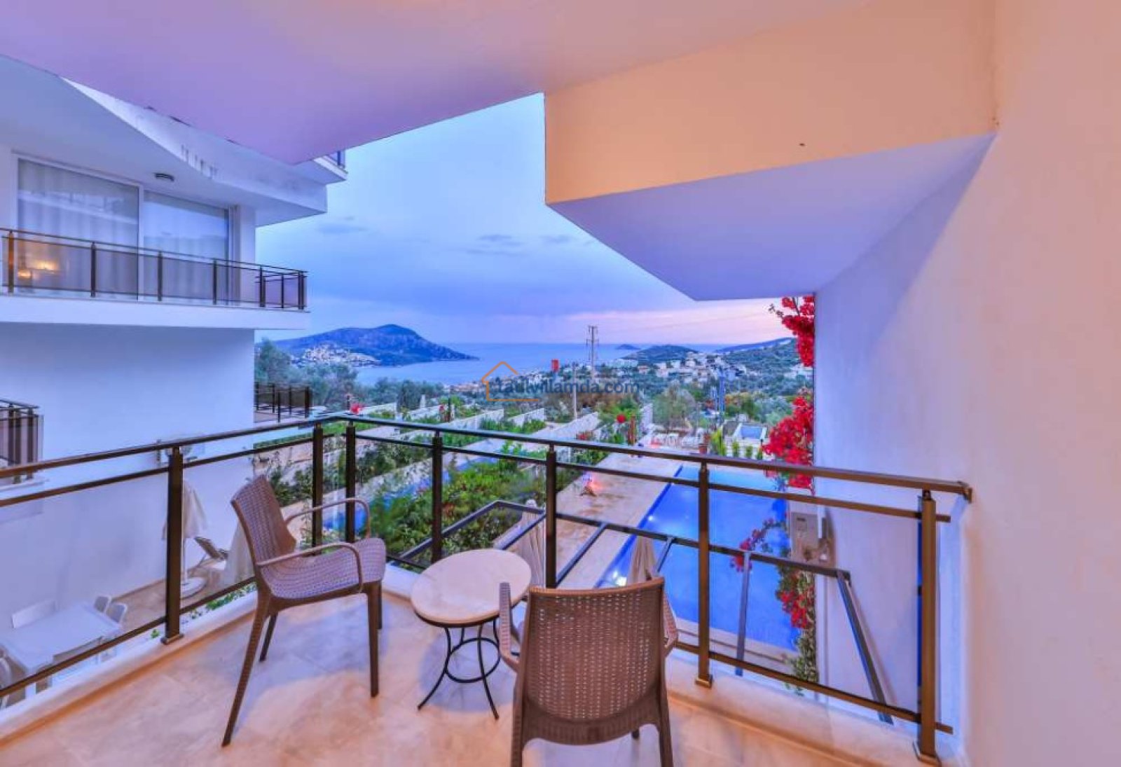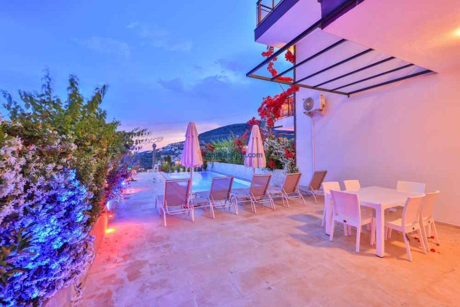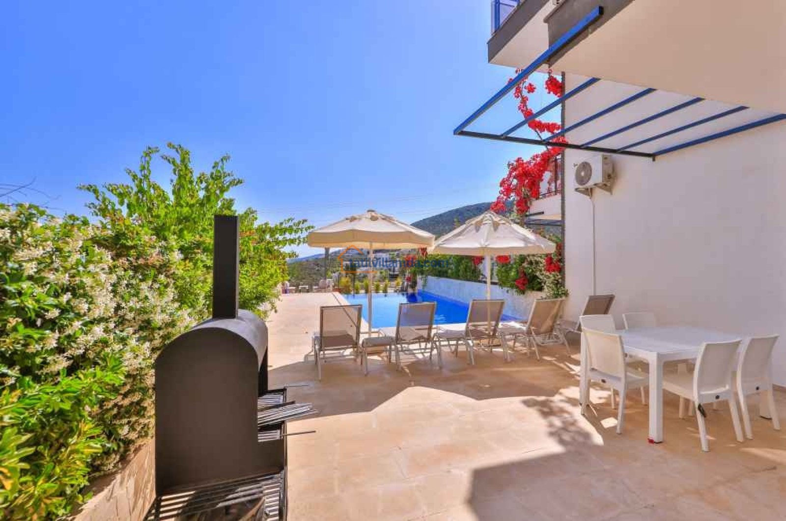 Villanın bahçesinde özel yüzme havuzu, şezlonglar, şemsiye, barbekü ve yemek masası takımı bulunmaktadır. Geniş terası sayesinde gün batımının keyfini çıkarabilir, havuz başında huzurlu anlar yaşayabilirsiniz. Merkezi konumuyla dikkat çeken villa, Kalkan şehir merkezine yalnızca 800 metre, en yakın plaja ise 1.6 km mesafededir. Bu sayede hem doğanın içinde huzurlu bir tatil geçirebilir hem de Kalkan’ın restoranları, kafeleri ve çarşısına kolayca ulaşabilirsiniz.