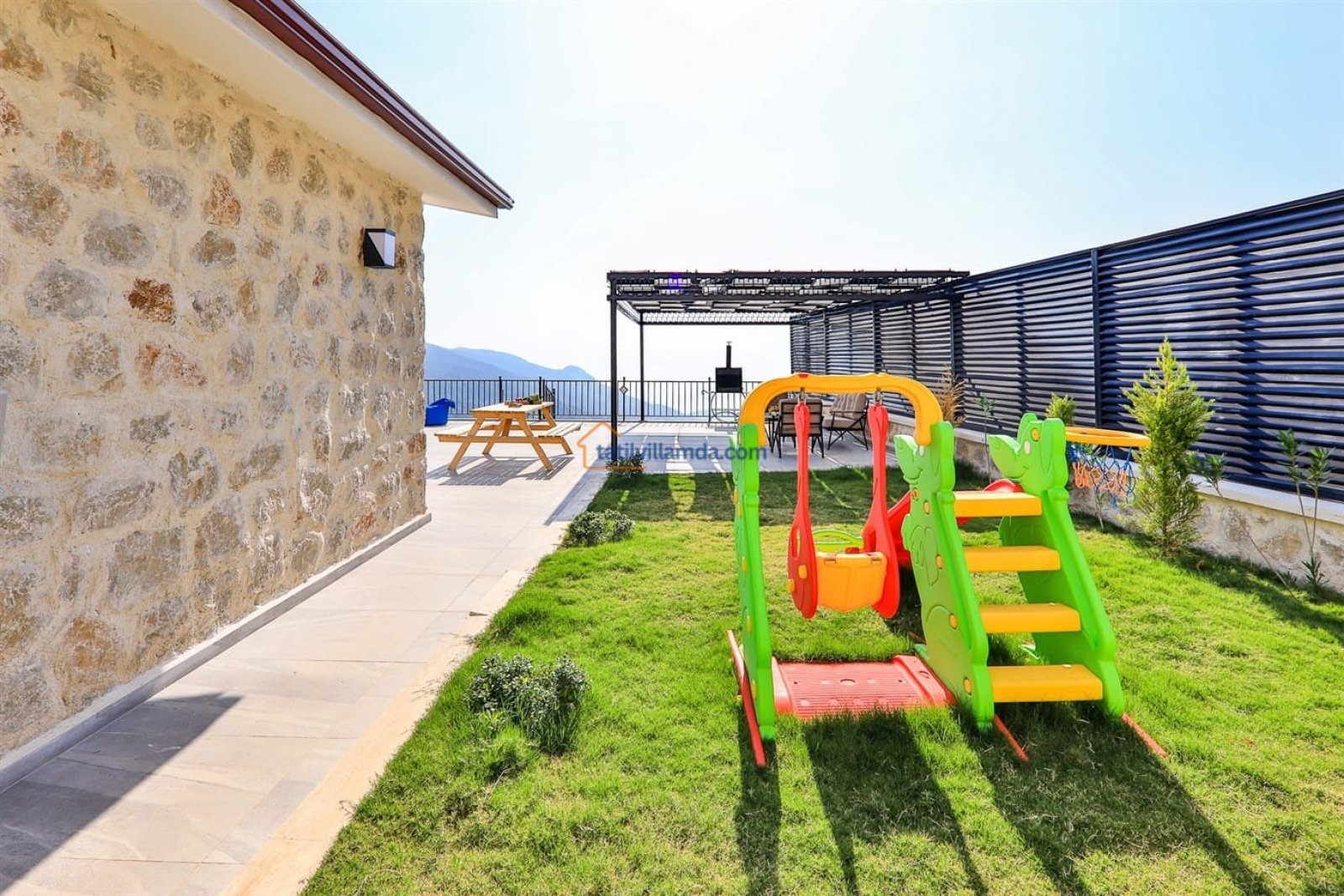 Korunaklı ve geniş yüzme havuzu sayesinde muhafazakâr aileler rahatlıkla tatillerini geçirebilir. Havuz başında yer alan şezlong ve şemsiyeler, güneşin tadını çıkarırken dinlenmeniz için idealdir. Bahçe alanında bulunan oturma grubu, gün batımında sevdiklerinizle sohbet etmek için keyifli bir ortam sunarken, barbekü alanı akşam yemeklerinizi keyifli anlara dönüştürür. Çocuklar için özel olarak düşünülmüş oyun parkı ise ailelerin içini rahatlatan önemli bir detaydır.