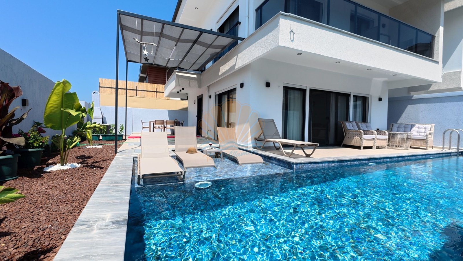Villanın özel yüzme havuzu ısıtmalı olup, üzeri açılır kapanır personel sistemi sayesinde dört mevsim kullanıma uygundur. Bu özelliği sayesinde serin havalarda bile yüzme keyfinden vazgeçmezsiniz. Havuz başında yer alan şezlonglar, şemsiye, salıncak, masa takımı ve bahçe oturma grubu gün boyu dinlenmeniz ve sevdiklerinizle keyifli vakit geçirmeniz için düşünülmüştür. Akşamları barbekü alanında lezzetli sofralar kurarak tatilin tadını doyasıya çıkarabilirsiniz.
