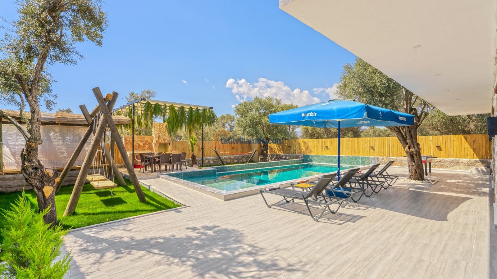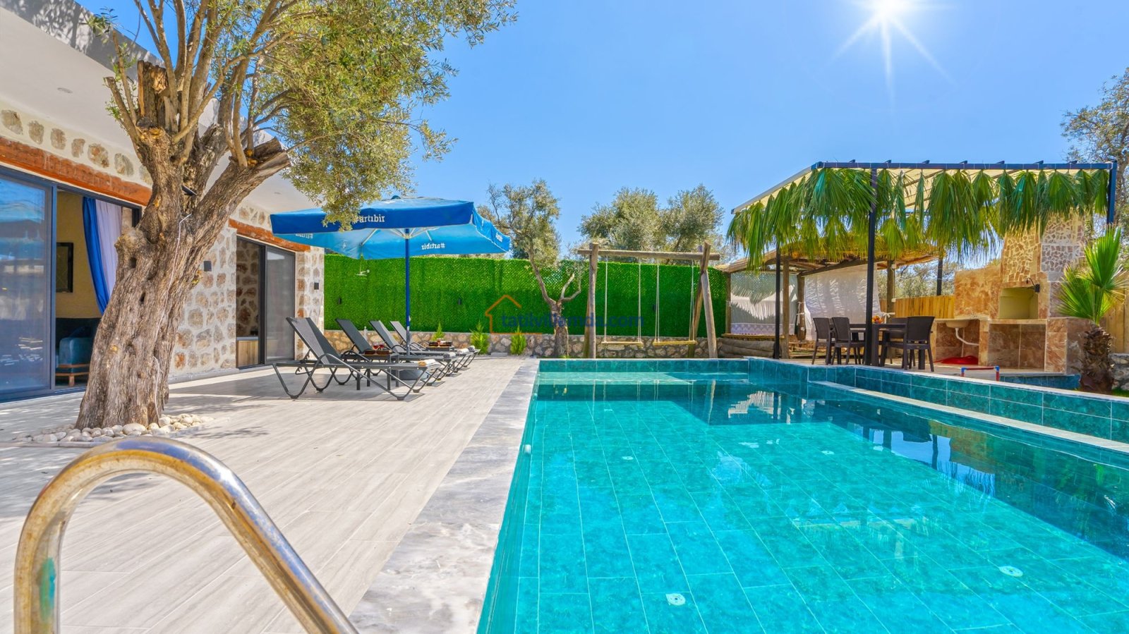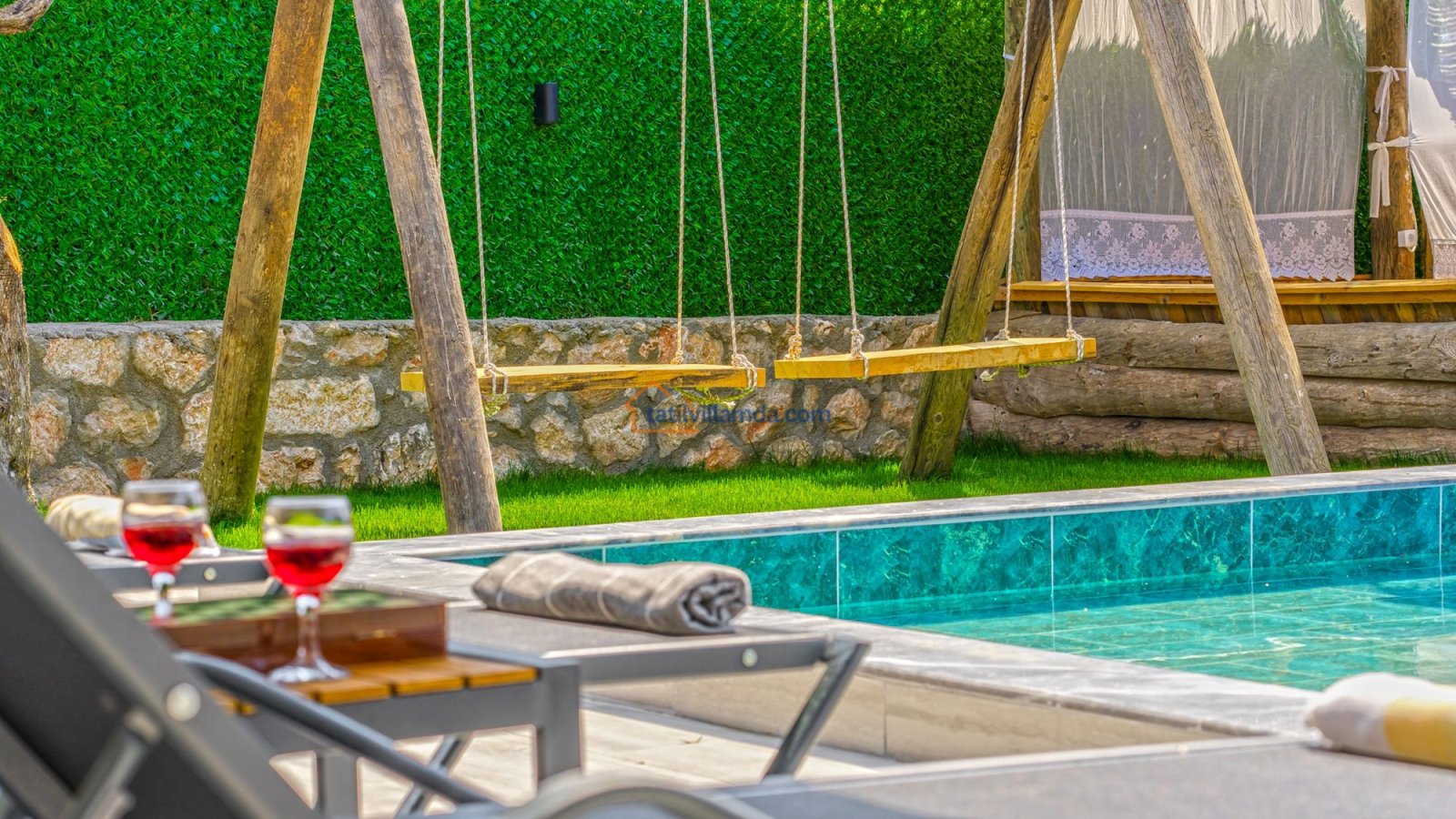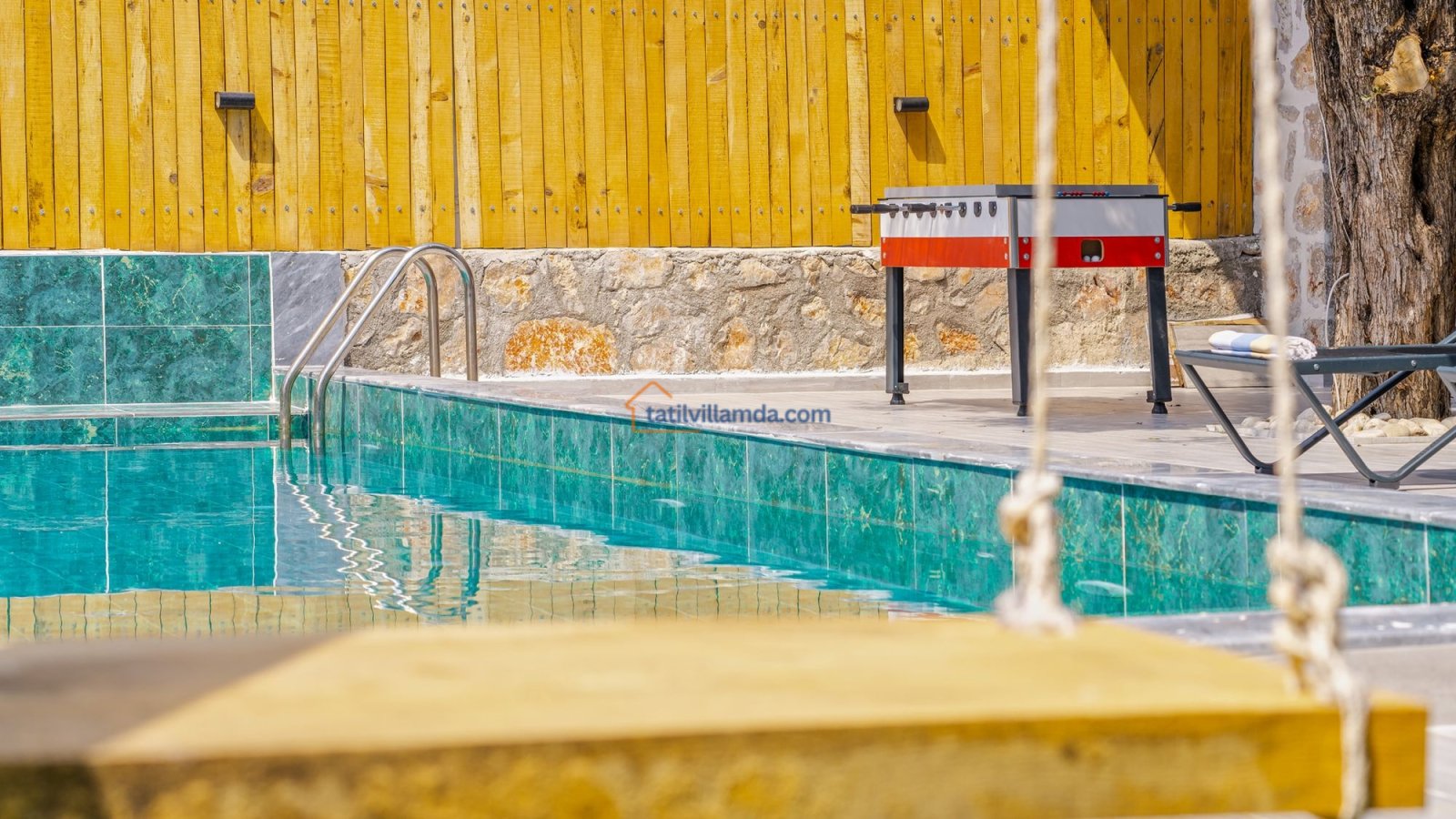 Villa Kaşlı 2’nin havuz başında şezlonglar, şemsiye, salıncak ve langırt yer almakta olup gün boyu eğlenceli ve dinlendirici vakit geçirmenizi sağlar. Bahçe alanında ise hamak, barbekü, yemek masası, çardaklı bahçe oturma grubu ve çocuklar için mini top sahası bulunmaktadır. Bu özellikleriyle hem yetişkinler hem de çocuklar için ayrı ayrı keyifli alanlar sunar. Akşamları barbekü keyfi yapabilir, gündüzleri ise havuzun ve bahçenin tadını doyasıya çıkarabilirsiniz.