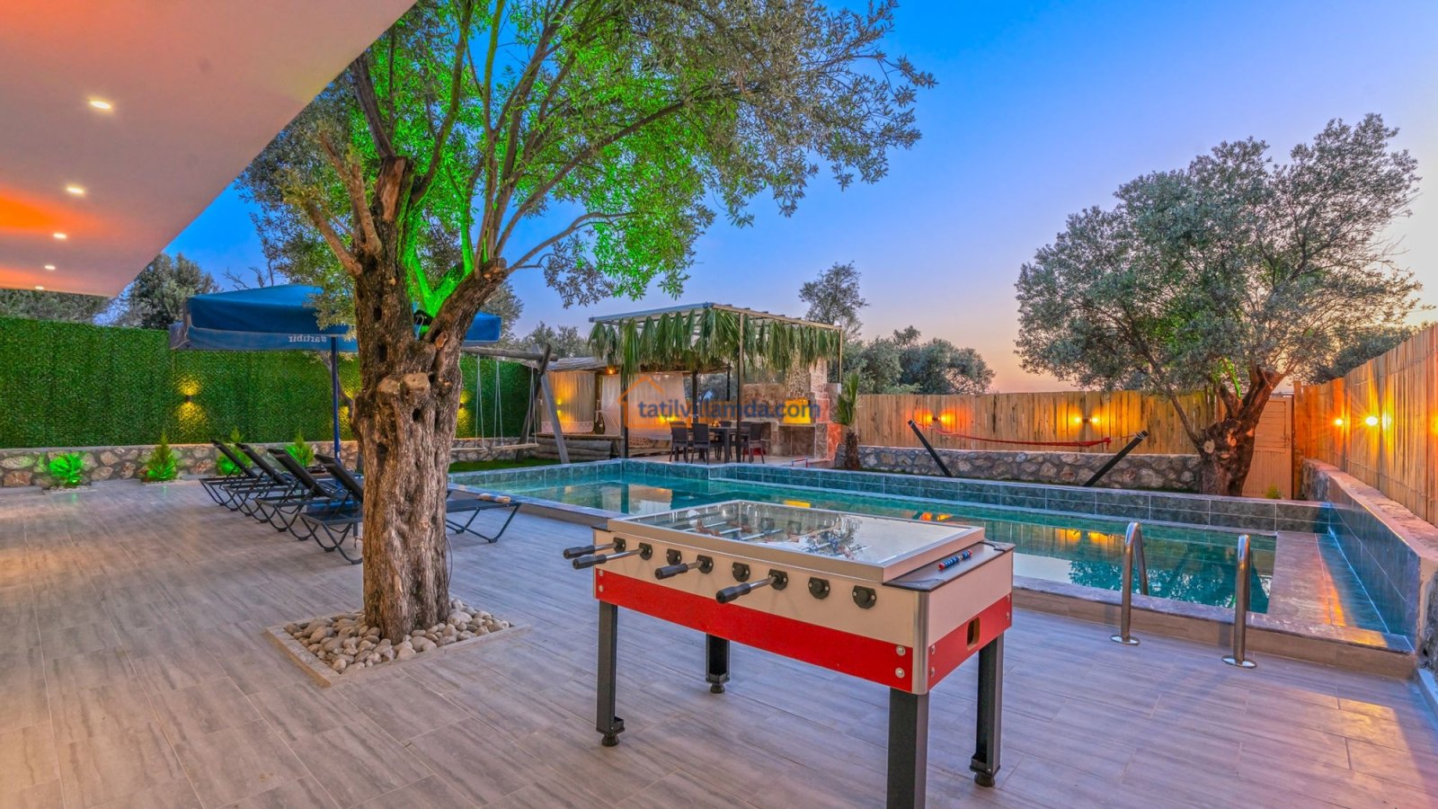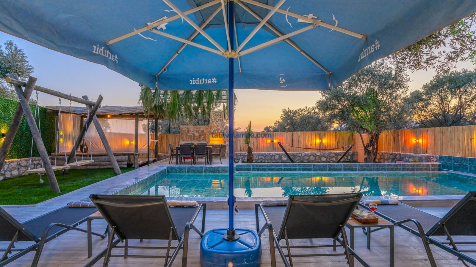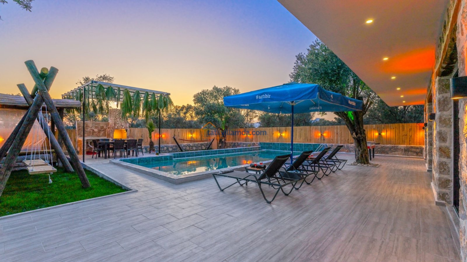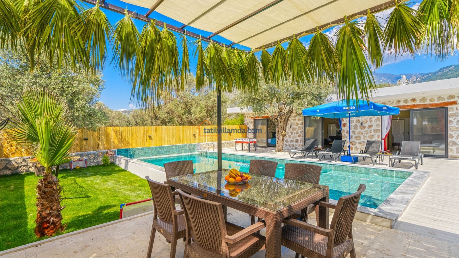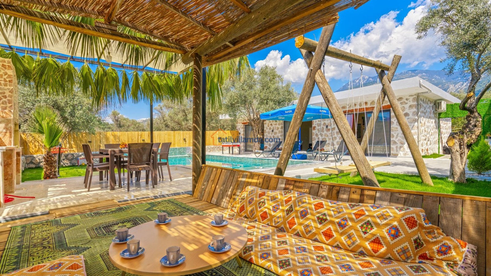 Villa Kaşlı 2’nin havuz başında şezlonglar, şemsiye, salıncak ve langırt yer almakta olup gün boyu eğlenceli ve dinlendirici vakit geçirmenizi sağlar. Bahçe alanında ise hamak, barbekü, yemek masası, çardaklı bahçe oturma grubu ve çocuklar için mini top sahası bulunmaktadır. Bu özellikleriyle hem yetişkinler hem de çocuklar için ayrı ayrı keyifli alanlar sunar. Akşamları barbekü keyfi yapabilir, gündüzleri ise havuzun ve bahçenin tadını doyasıya çıkarabilirsiniz.