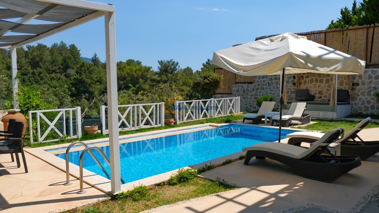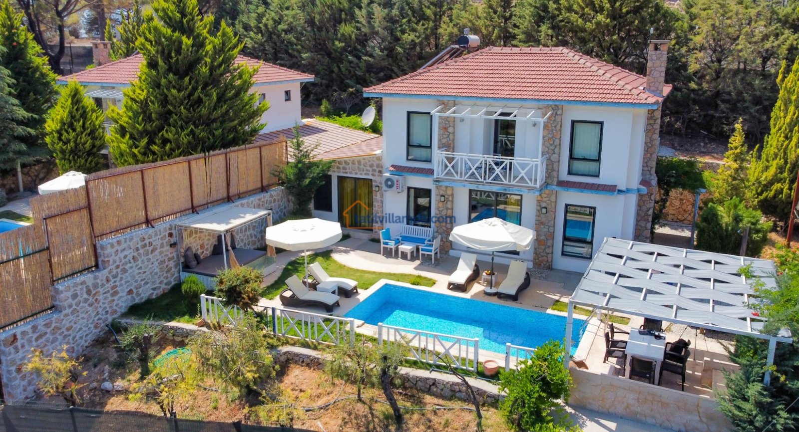 Villanın bahçe ve havuz alanı, günün en keyifli anlarının merkezi olmaya adaydır. Havuz başında yer alan şezlonglar ve şemsiyeler, güneşin tadını çıkarmanız için özenle konumlandırılmıştır. Bahçe oturma grubu, barbekü alanı ve özellikle akşam saatlerinde keyifli sohbetlere ev sahipliği yapan çardaklı loca, tatilinizi daha da özel kılar.