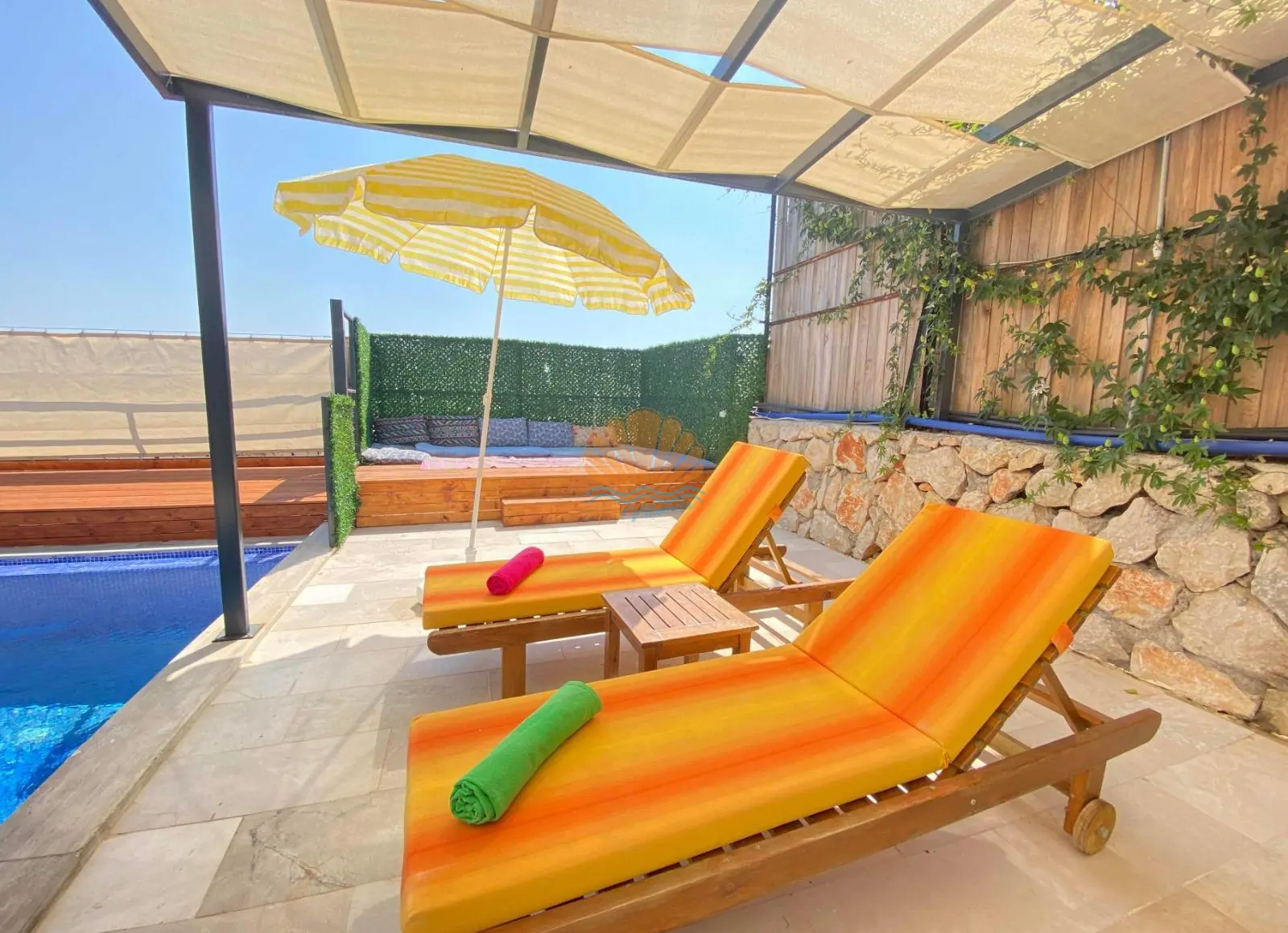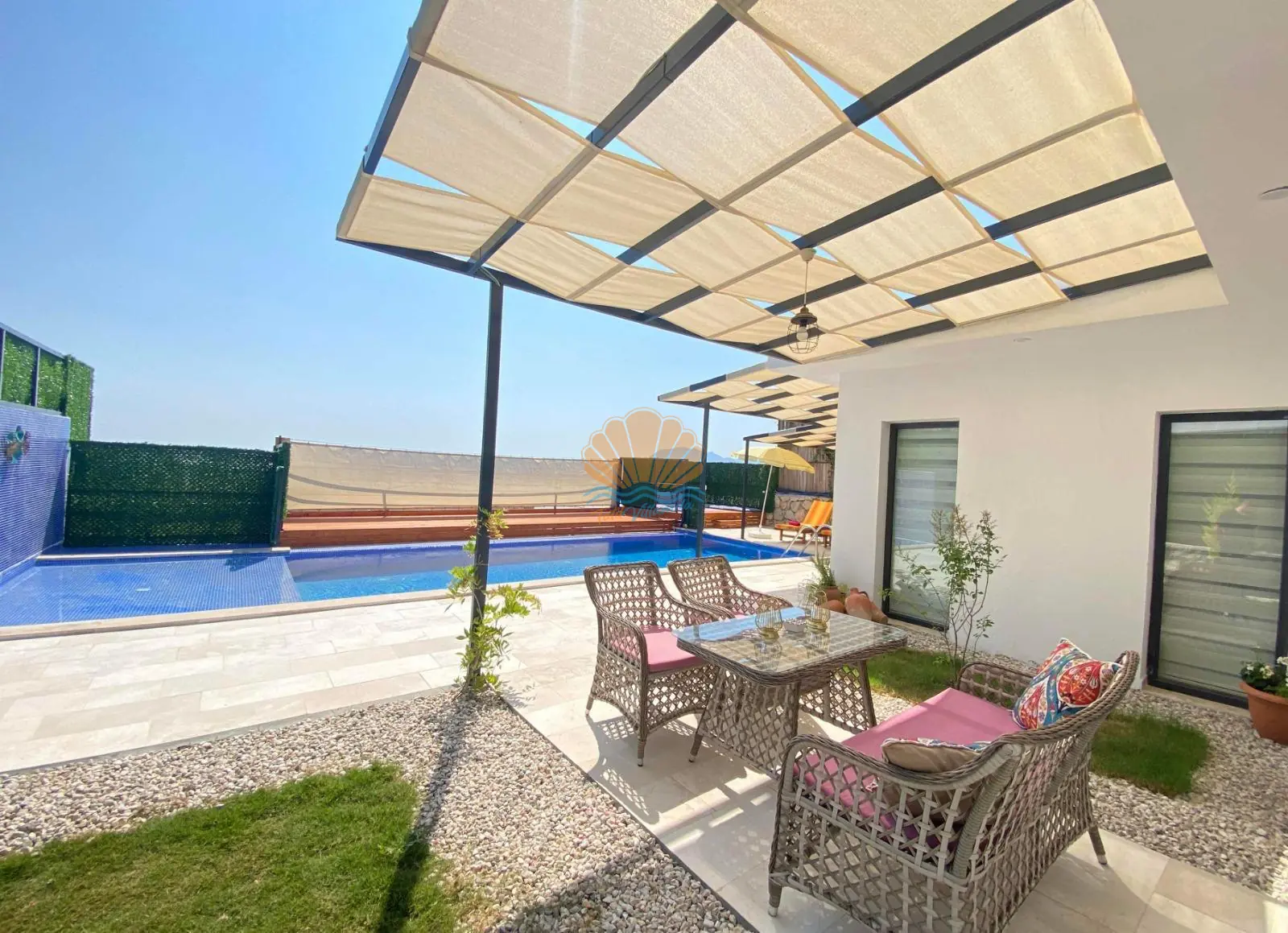Villanın geniş havuz terasında şezlonglar, şemsiye, konforlu bahçe oturma grubu ve barbekü alanı bulunmaktadır. Gün boyu güneşin tadını çıkarabilir, akşam saatlerinde ise sevdiklerinizle keyifli yemekler eşliğinde unutulmaz anlar yaşayabilirsiniz. Doğanın içerisinde yer alan Villa Lilla, şehir gürültüsünden uzak sakin bir atmosfer sunarken aynı zamanda Kalkan merkeze kısa sürüş mesafesindedir.