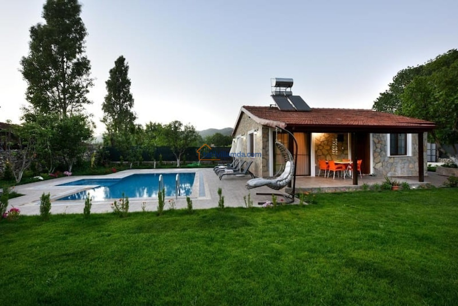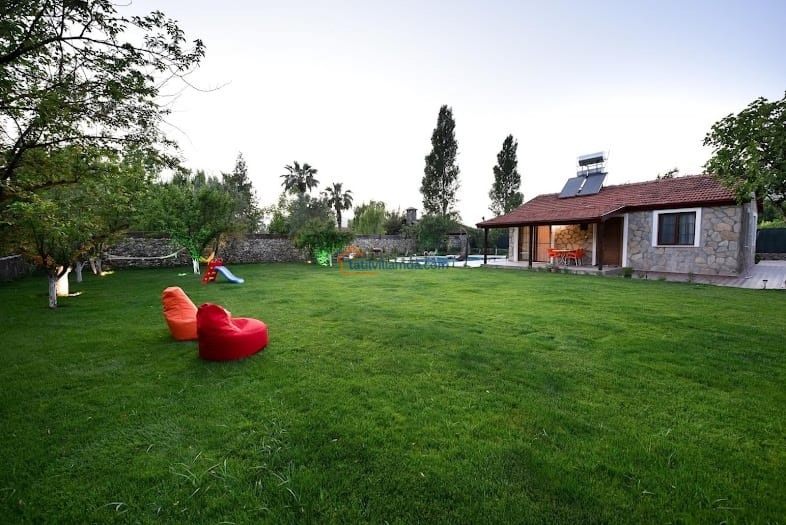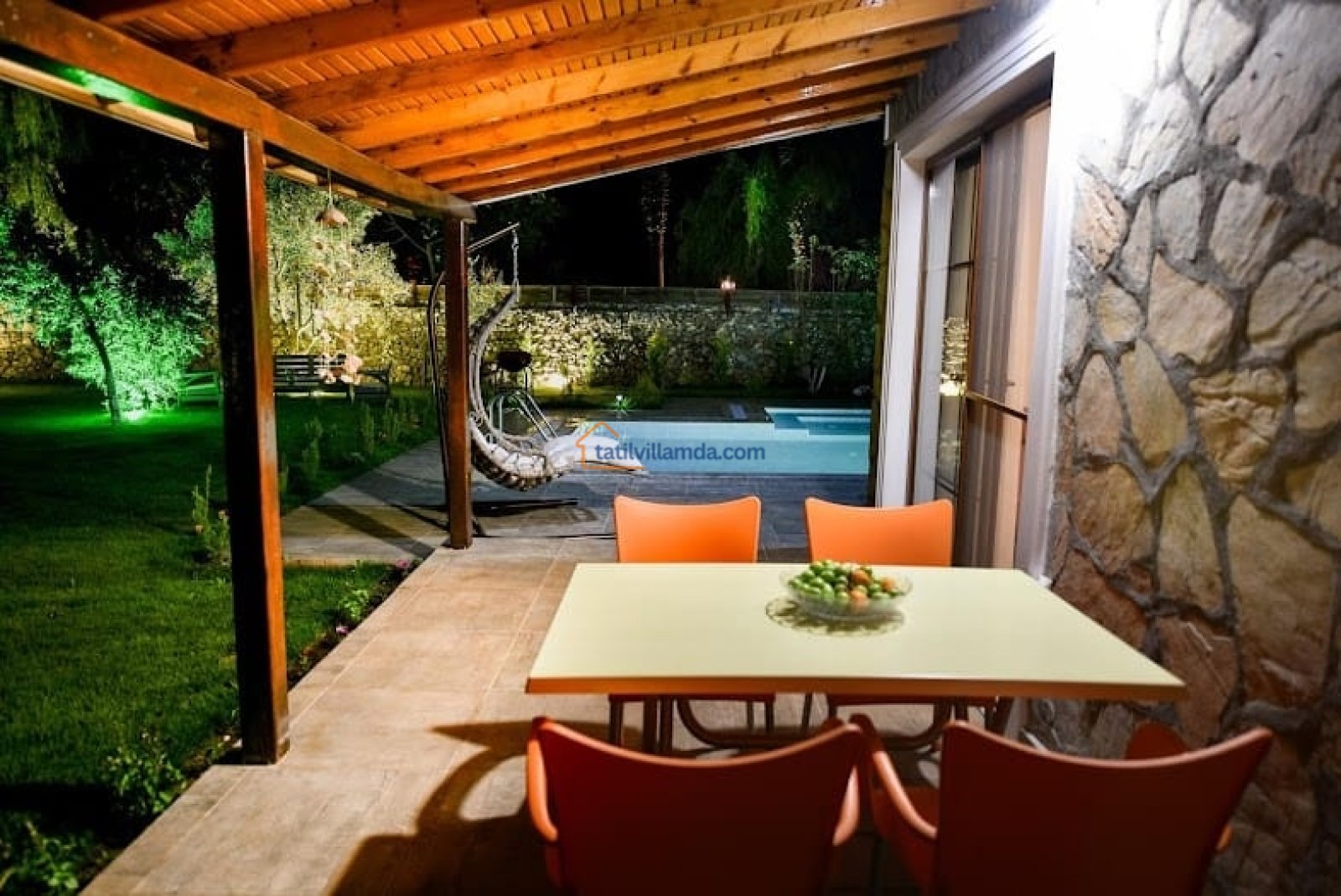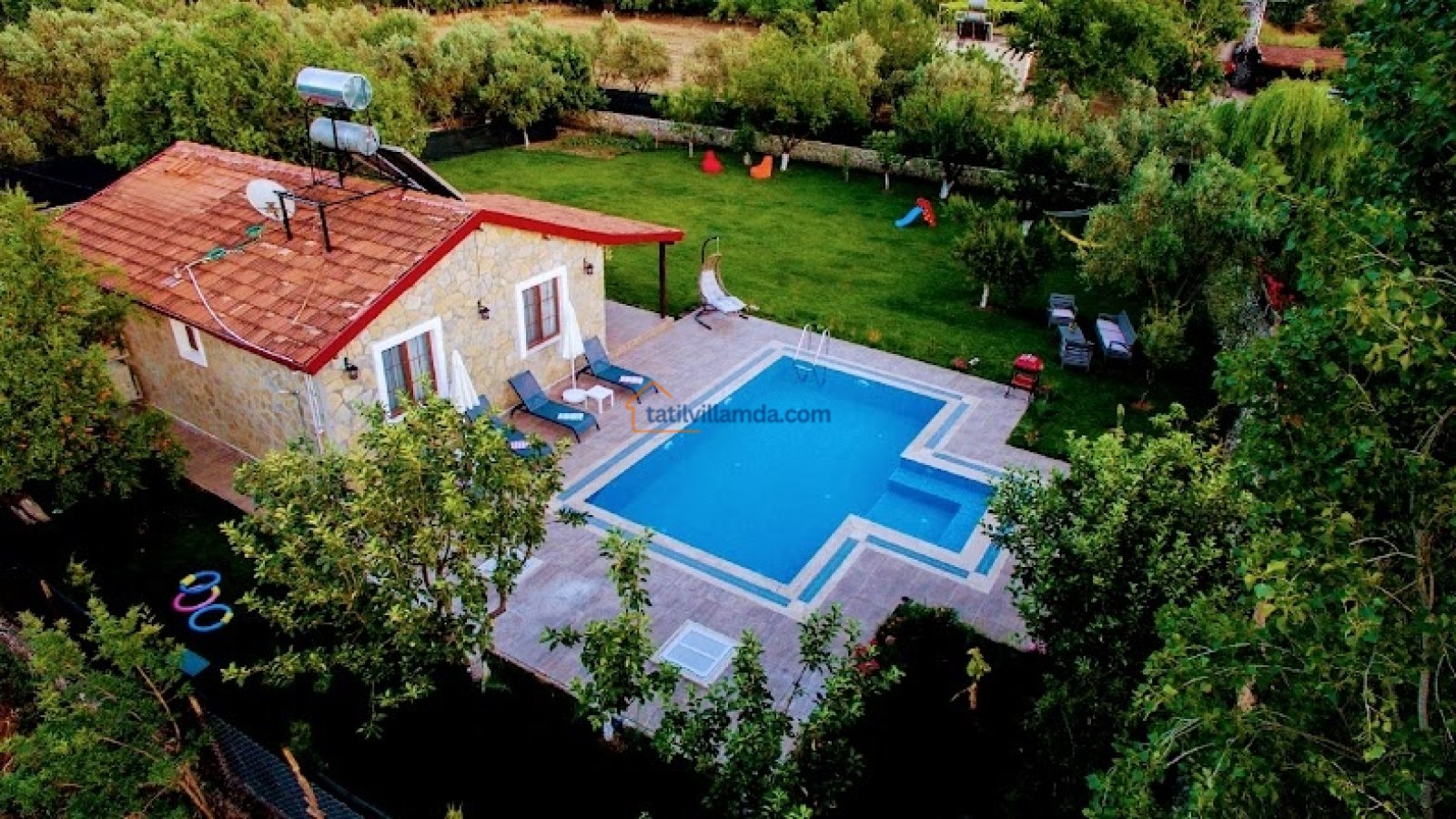 Villamız 2 yatak odası ve 1 salonuyla 4 kişiye kadar konaklama imkânı sağlar. Geniş ve yemyeşil bahçesinde çocuklar için mini bir oyun alanı bulunur. Havuz başında şezlong ve şemsiyelerle güneşin tadını çıkarabilir, bahçedeki hamak, oturma grubu, yemek masası ve salıncak ile huzurun keyfine varabilirsiniz. Ayrıca barbekü alanında sevdiklerinizle keyifli akşam yemekleri hazırlayabilirsiniz.