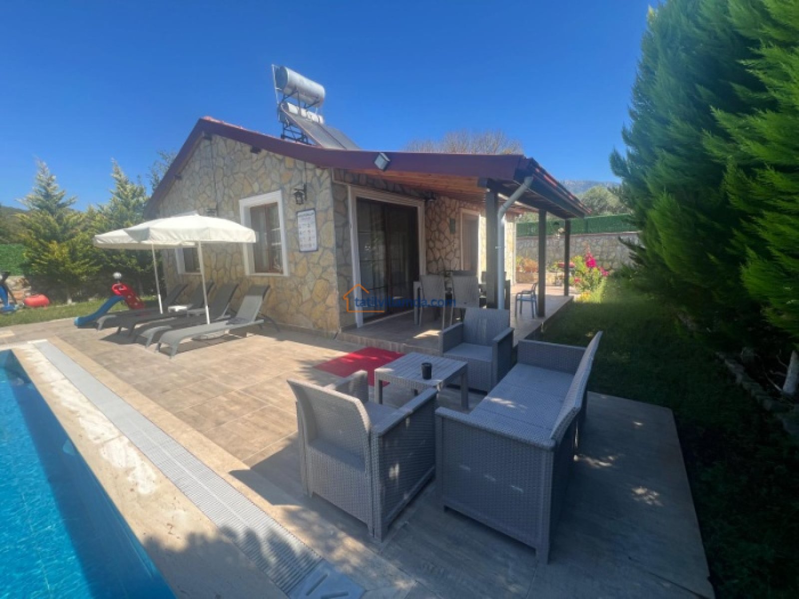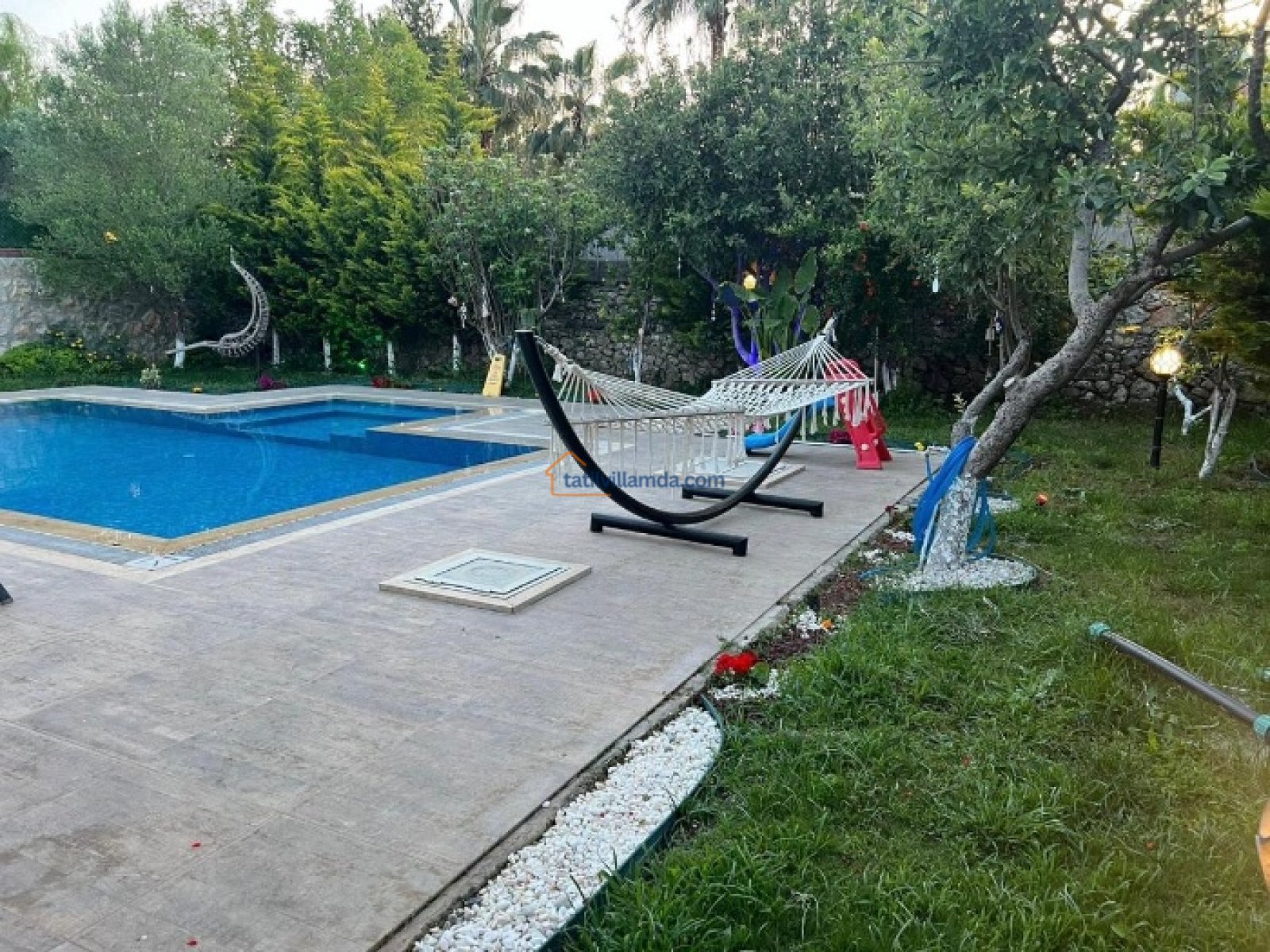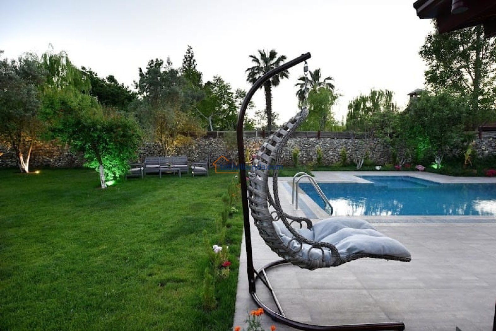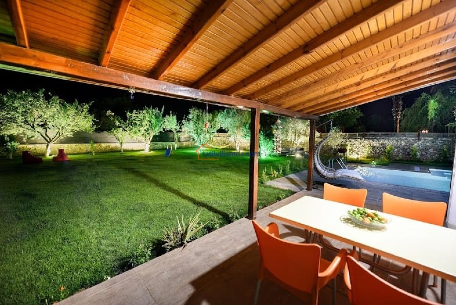 Villamız 2 yatak odası ve 1 salonuyla 4 kişiye kadar konaklama imkânı sağlar. Geniş ve yemyeşil bahçesinde çocuklar için mini bir oyun alanı bulunur. Havuz başında şezlong ve şemsiyelerle güneşin tadını çıkarabilir, bahçedeki hamak, oturma grubu, yemek masası ve salıncak ile huzurun keyfine varabilirsiniz. Ayrıca barbekü alanında sevdiklerinizle keyifli akşam yemekleri hazırlayabilirsiniz.