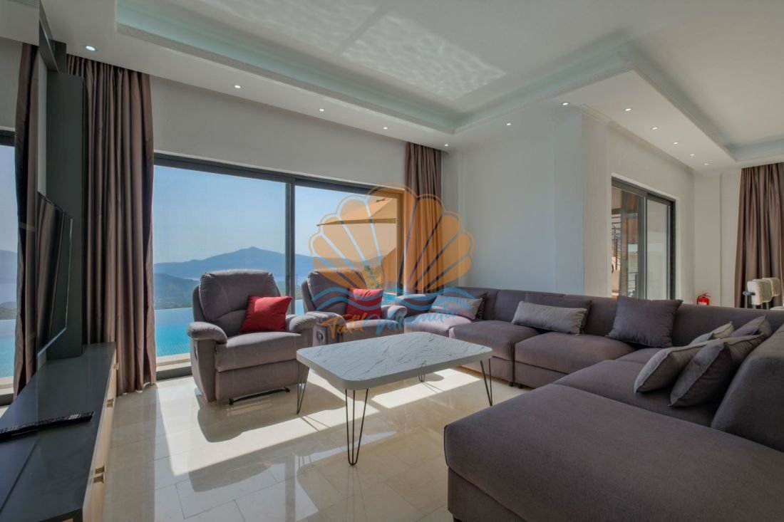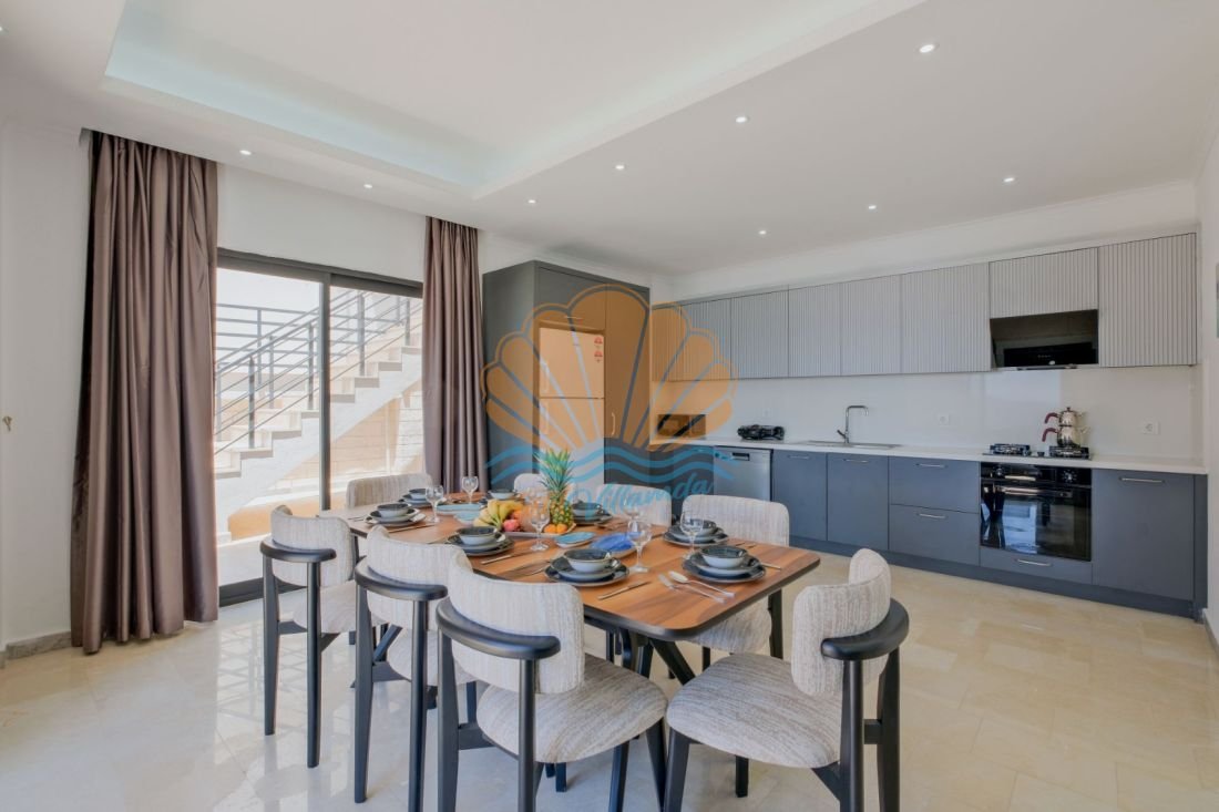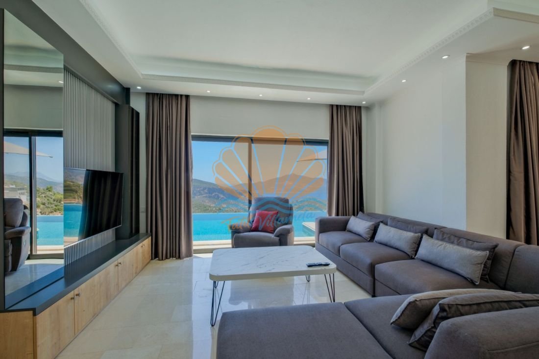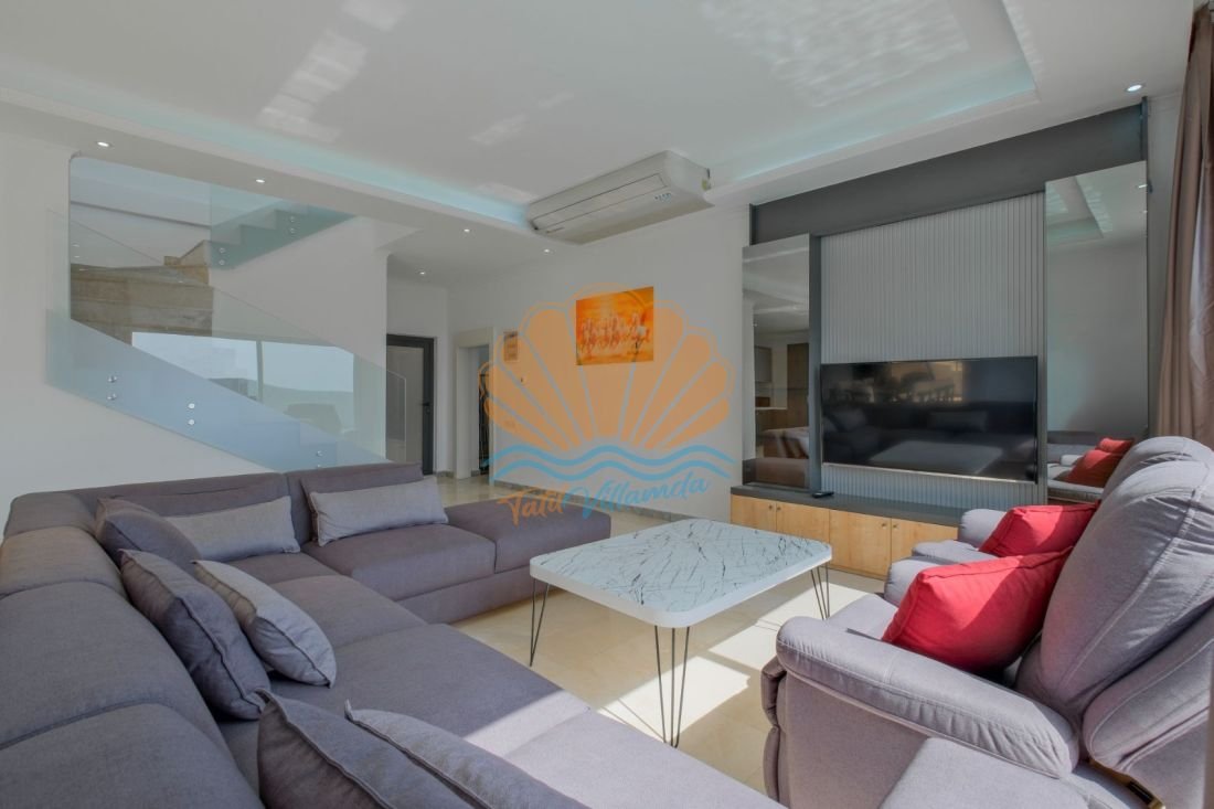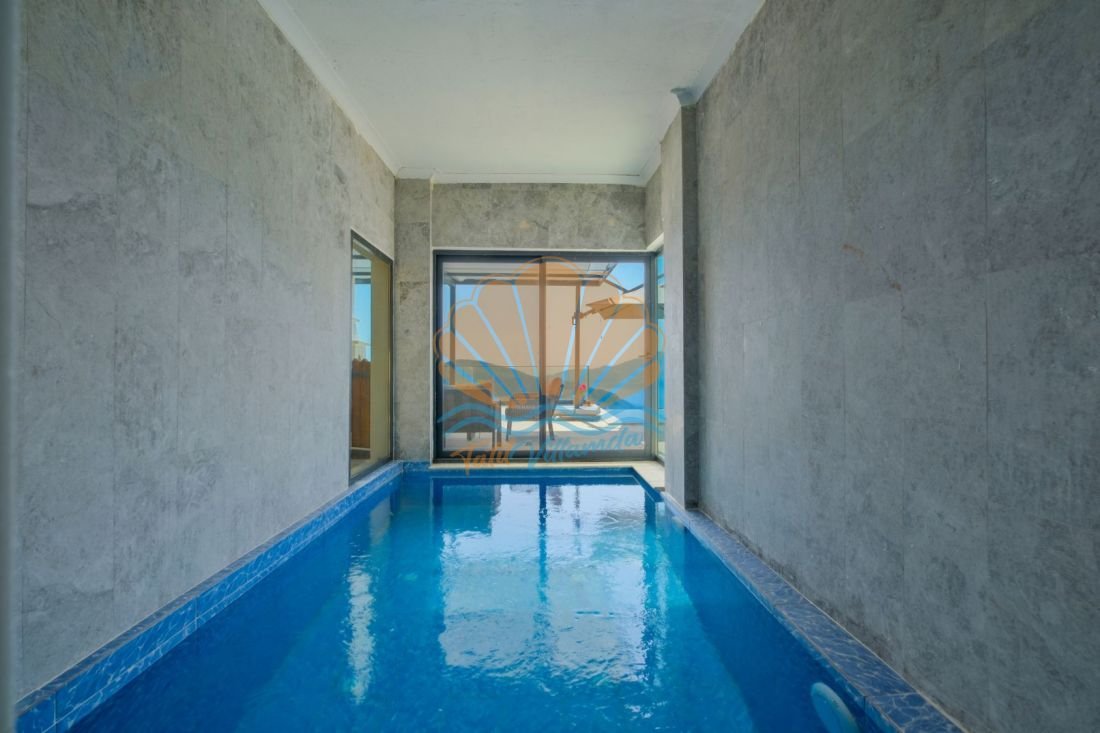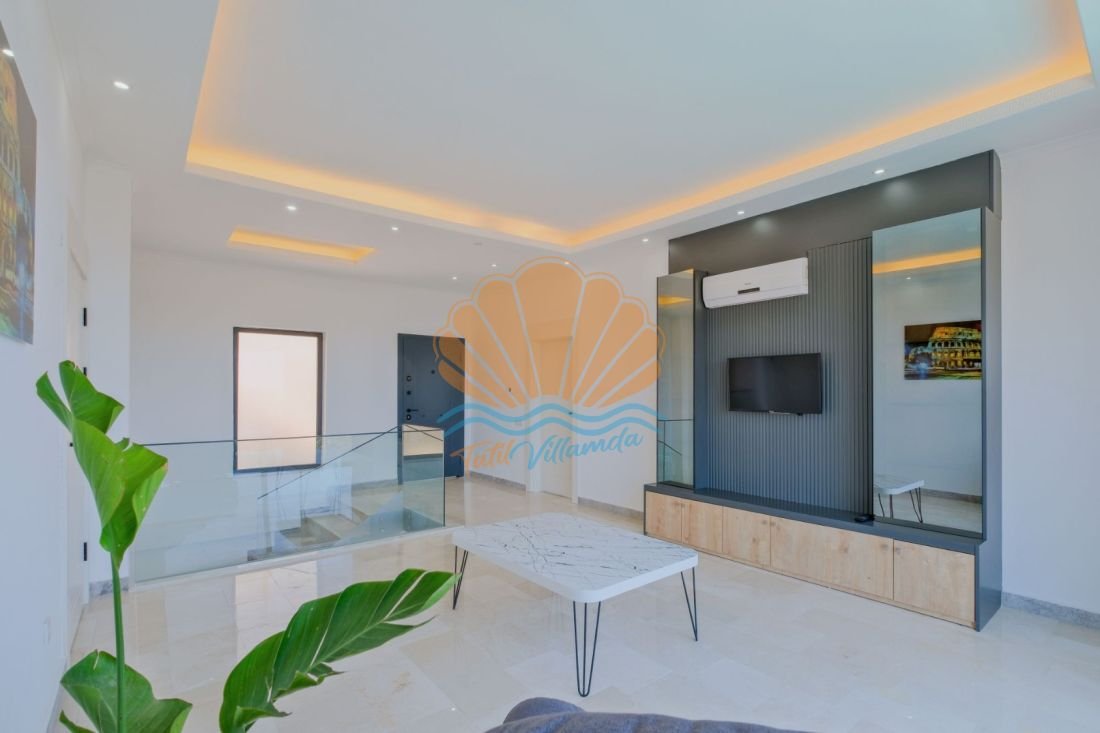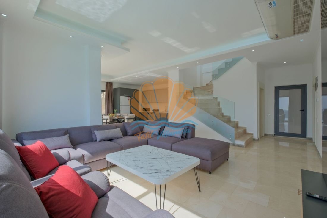 Lüks detaylarla donatılmış iç mekânda modern mobilyalar, kullanışlı bir mutfak ve geniş bir salon yer alır. Büyük cam açıklıklar sayesinde gün ışığı içeri bolca girer ve deniz manzarası yaşam alanının bir parçası haline gelir. Hem dinlenme hem de sosyal vakit geçirme alanları dengeli şekilde tasarlanmıştır.