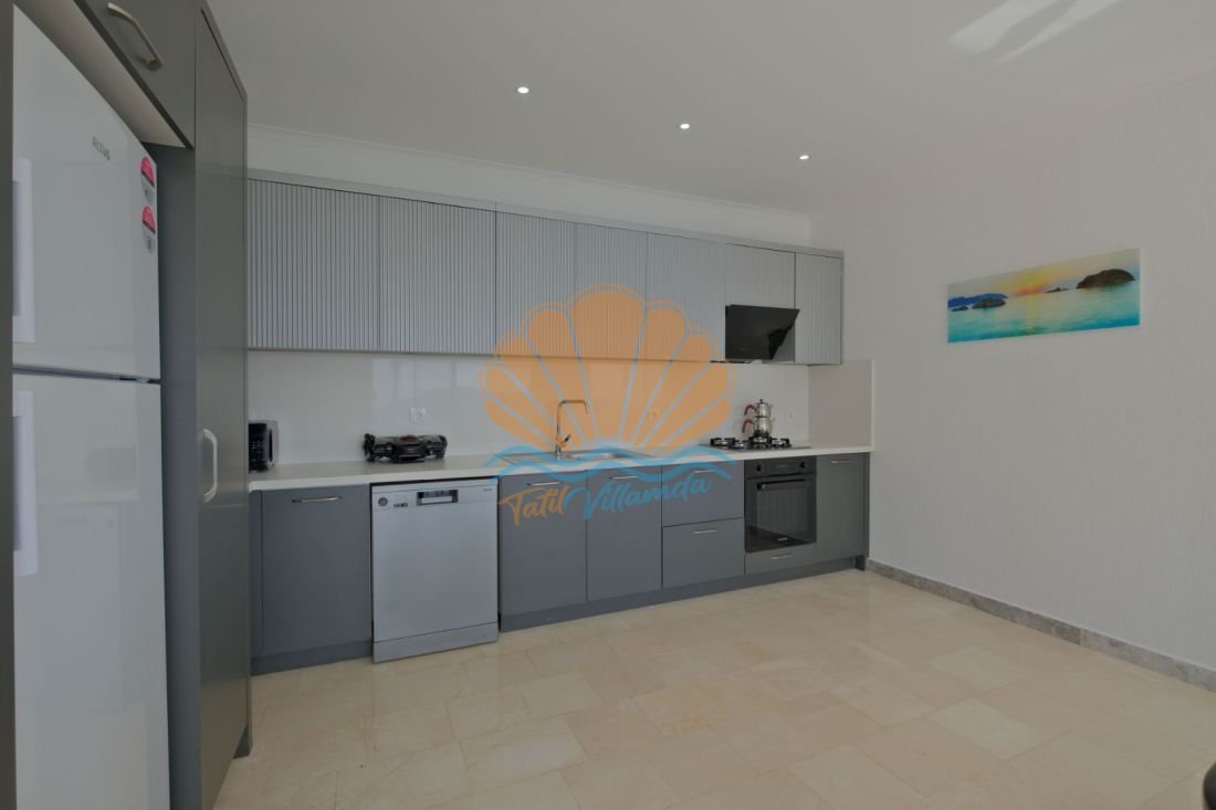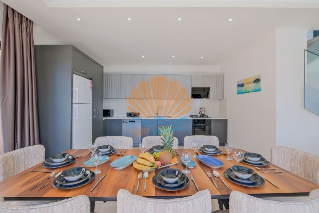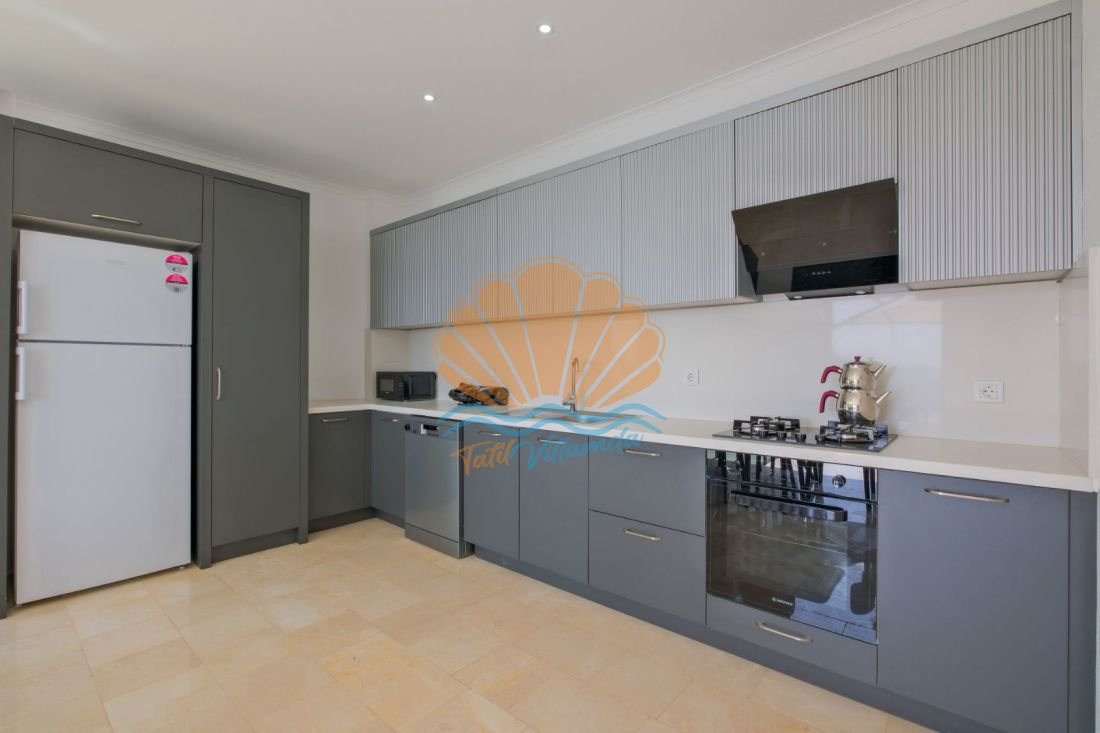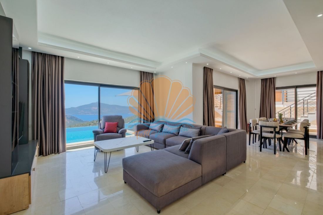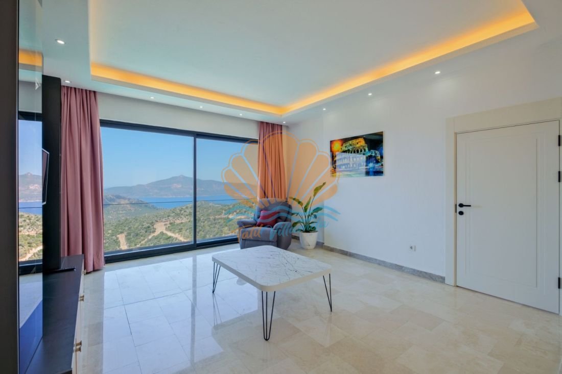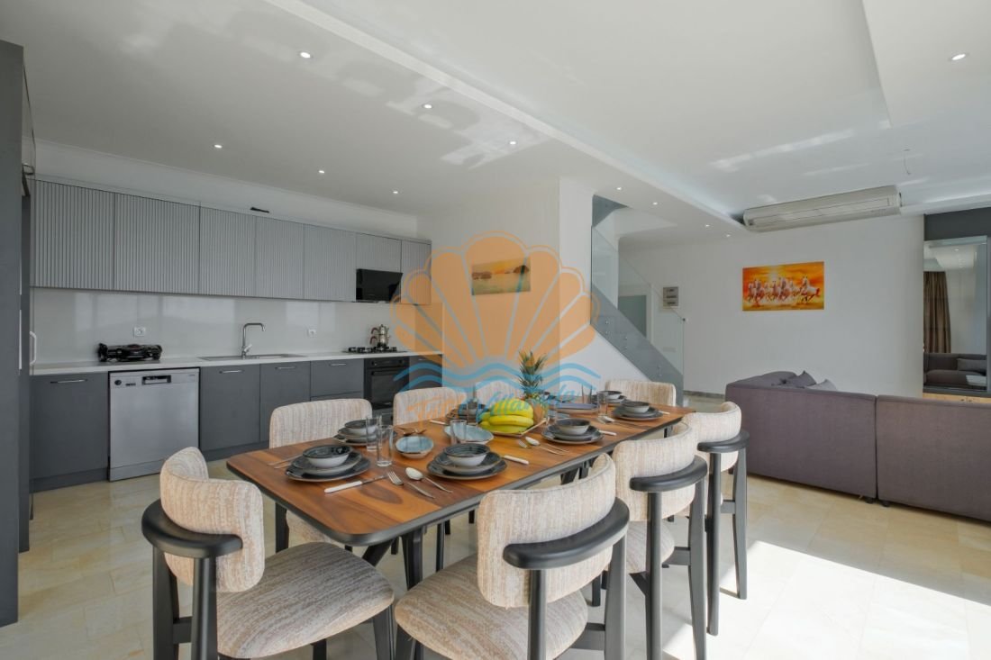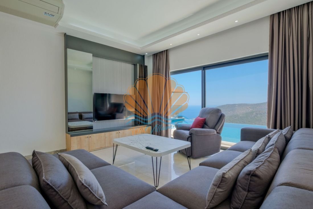 Lüks detaylarla donatılmış iç mekânda modern mobilyalar, kullanışlı bir mutfak ve geniş bir salon yer alır. Büyük cam açıklıklar sayesinde gün ışığı içeri bolca girer ve deniz manzarası yaşam alanının bir parçası haline gelir. Hem dinlenme hem de sosyal vakit geçirme alanları dengeli şekilde tasarlanmıştır.