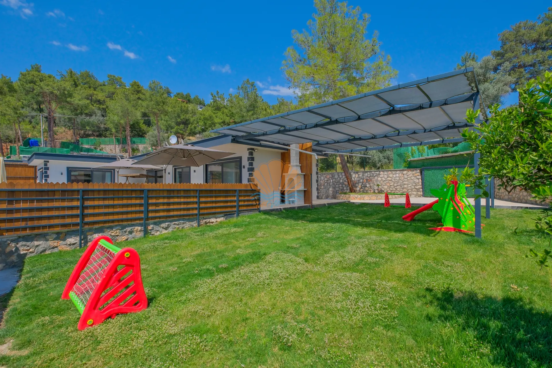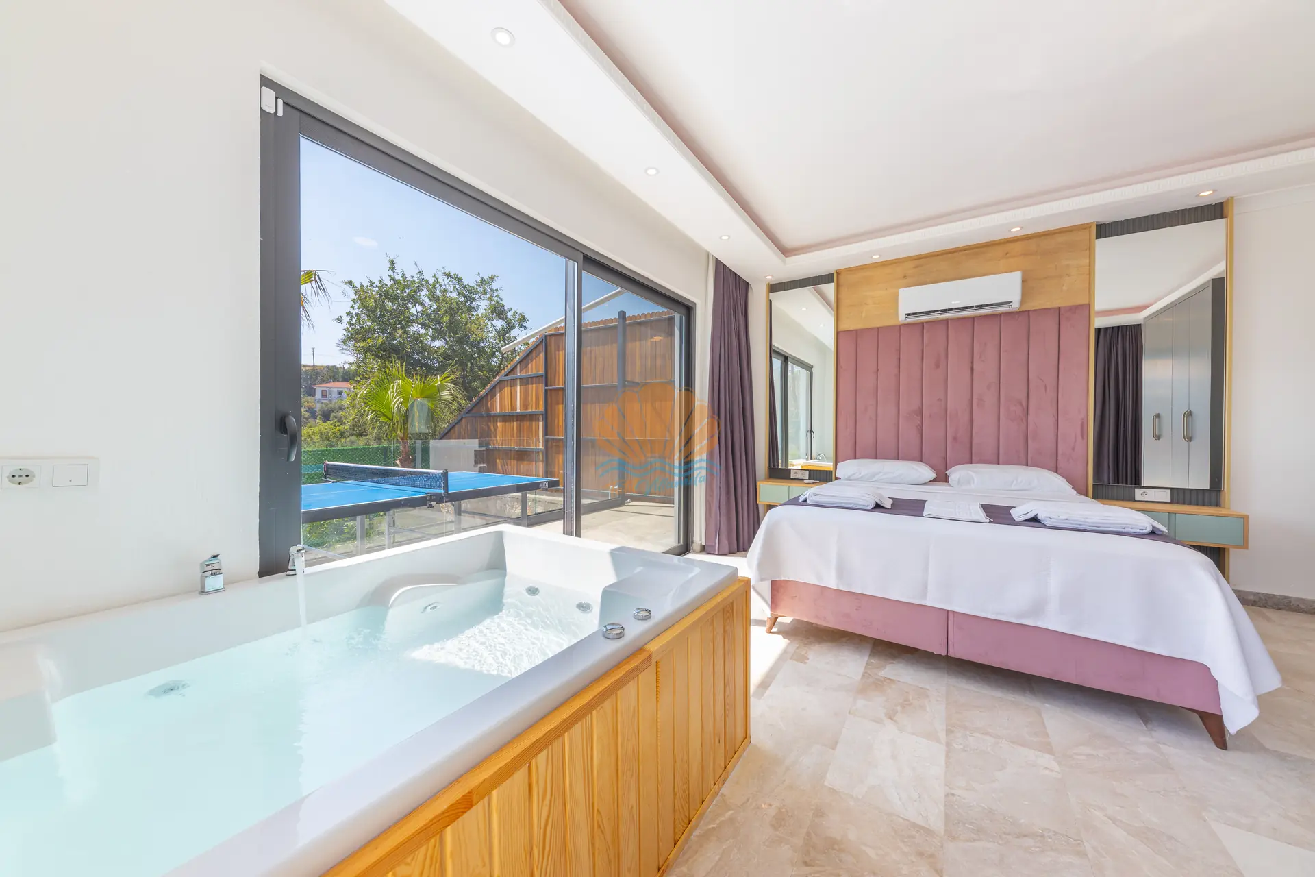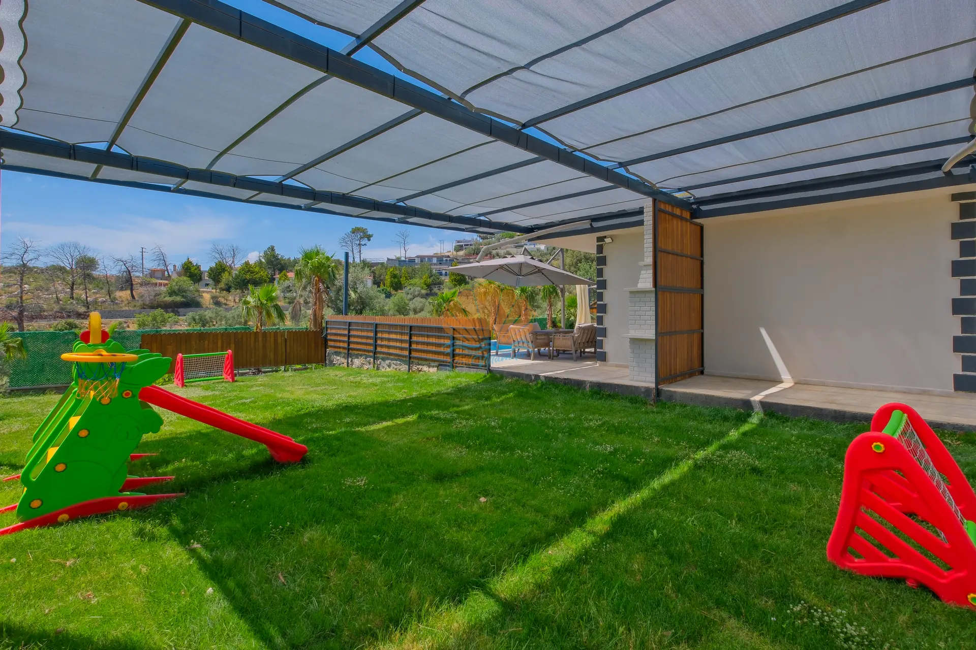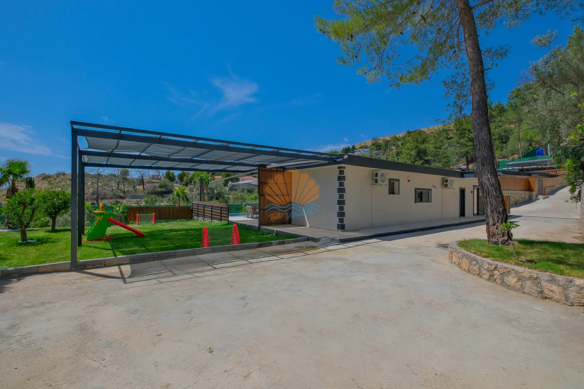 Bahçe alanında bulunan masa tenisi ve mini çocuk oyun parkı, hem yetişkinler hem de çocuklar için eğlenceli aktiviteler sunar. Bu sayede villa içerisinde vakit geçirirken sıkılmadan keyifli bir tatil deneyimi yaşayabilirsiniz.