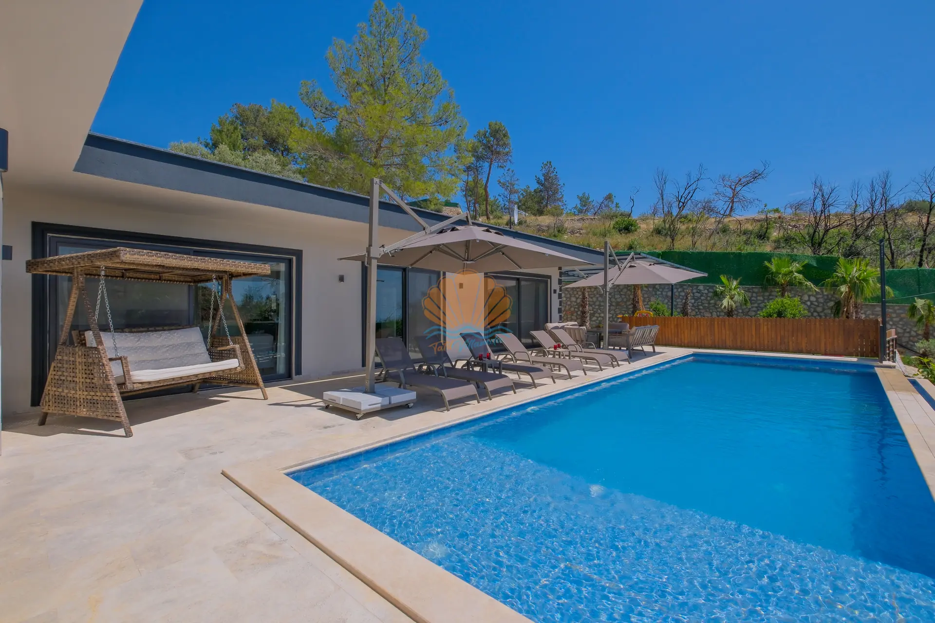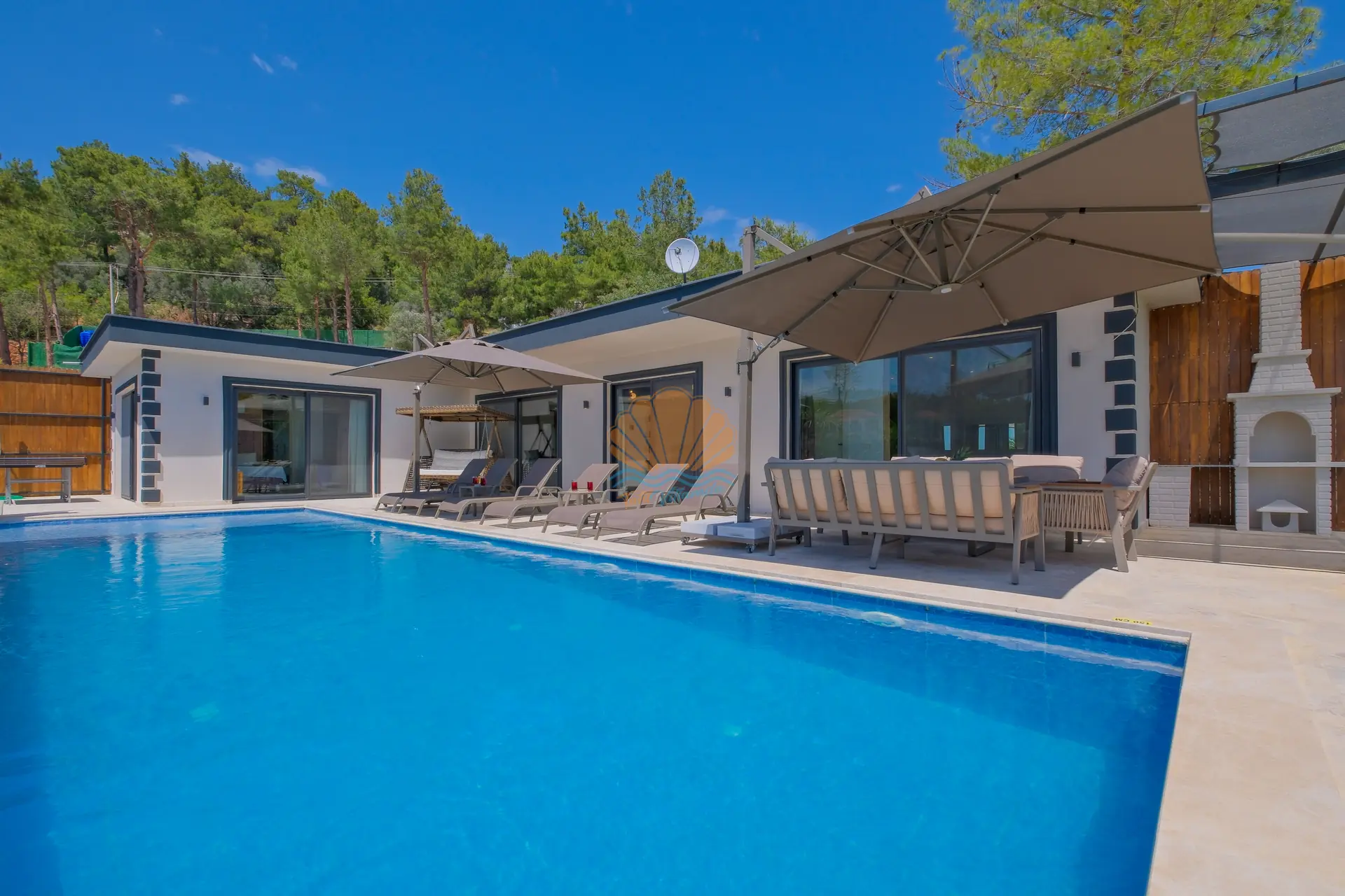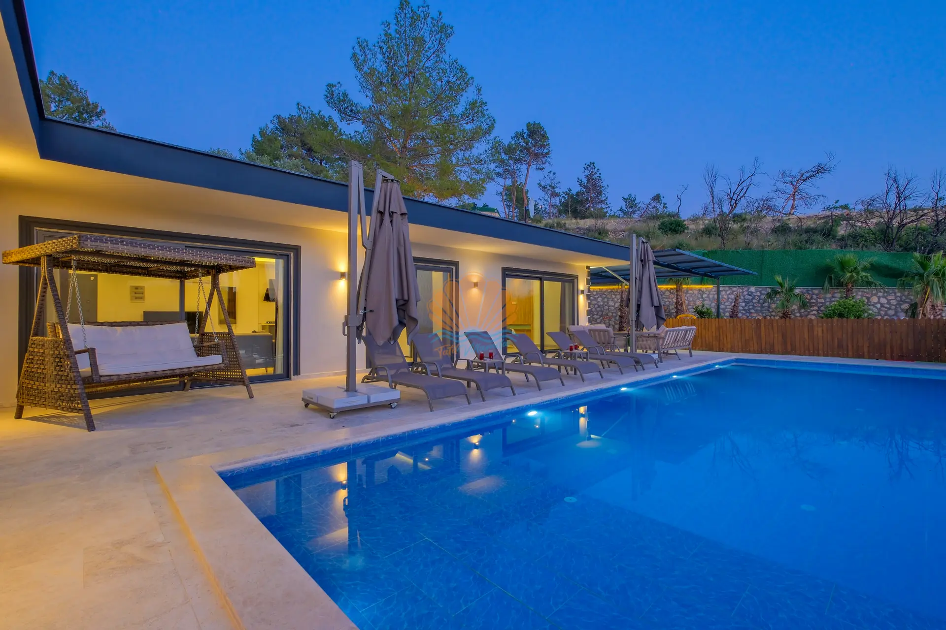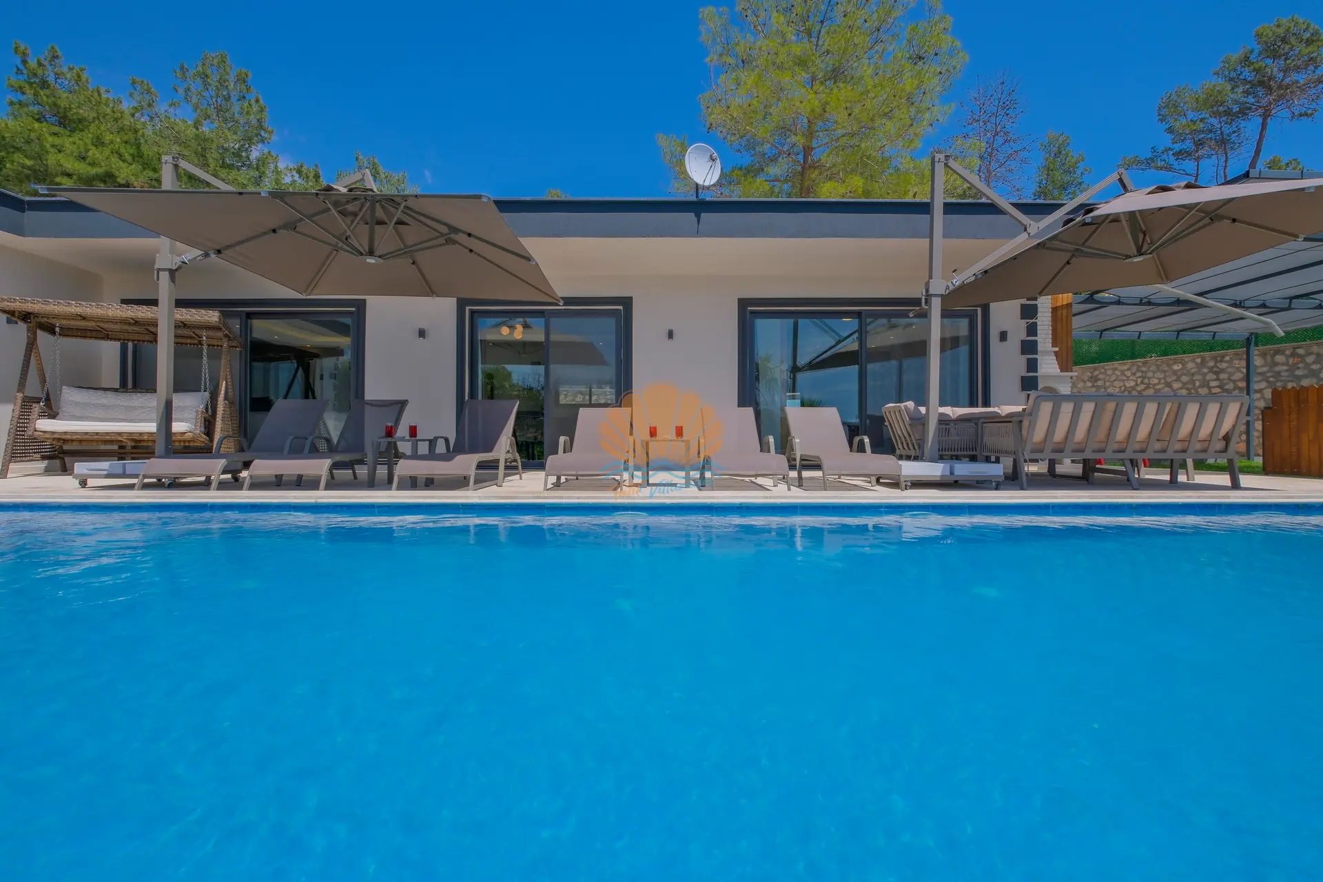 Villanın geniş ve korunaklı havuz terası, tatilin en keyifli anlarına ev sahipliği yapar. Özel yüzme havuzu çevresinde şezlonglar ve şemsiyeler yer alırken, bahçe oturma grubu sayesinde günün her saati keyifli vakit geçirebilirsiniz. Salıncak ve barbekü alanı, özellikle akşam saatlerinde sevdiklerinizle birlikte hoş anılar biriktirmenize olanak tanır.