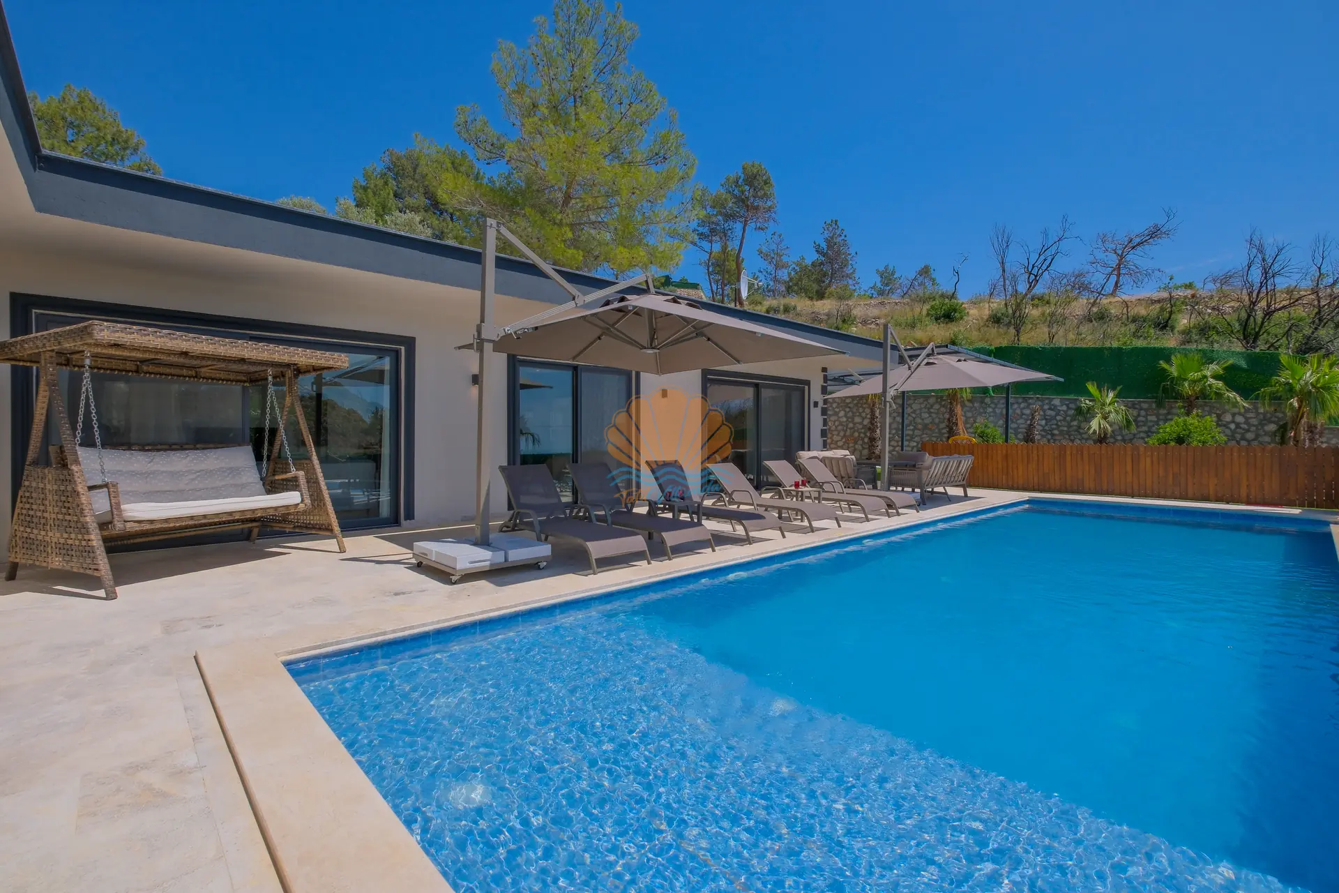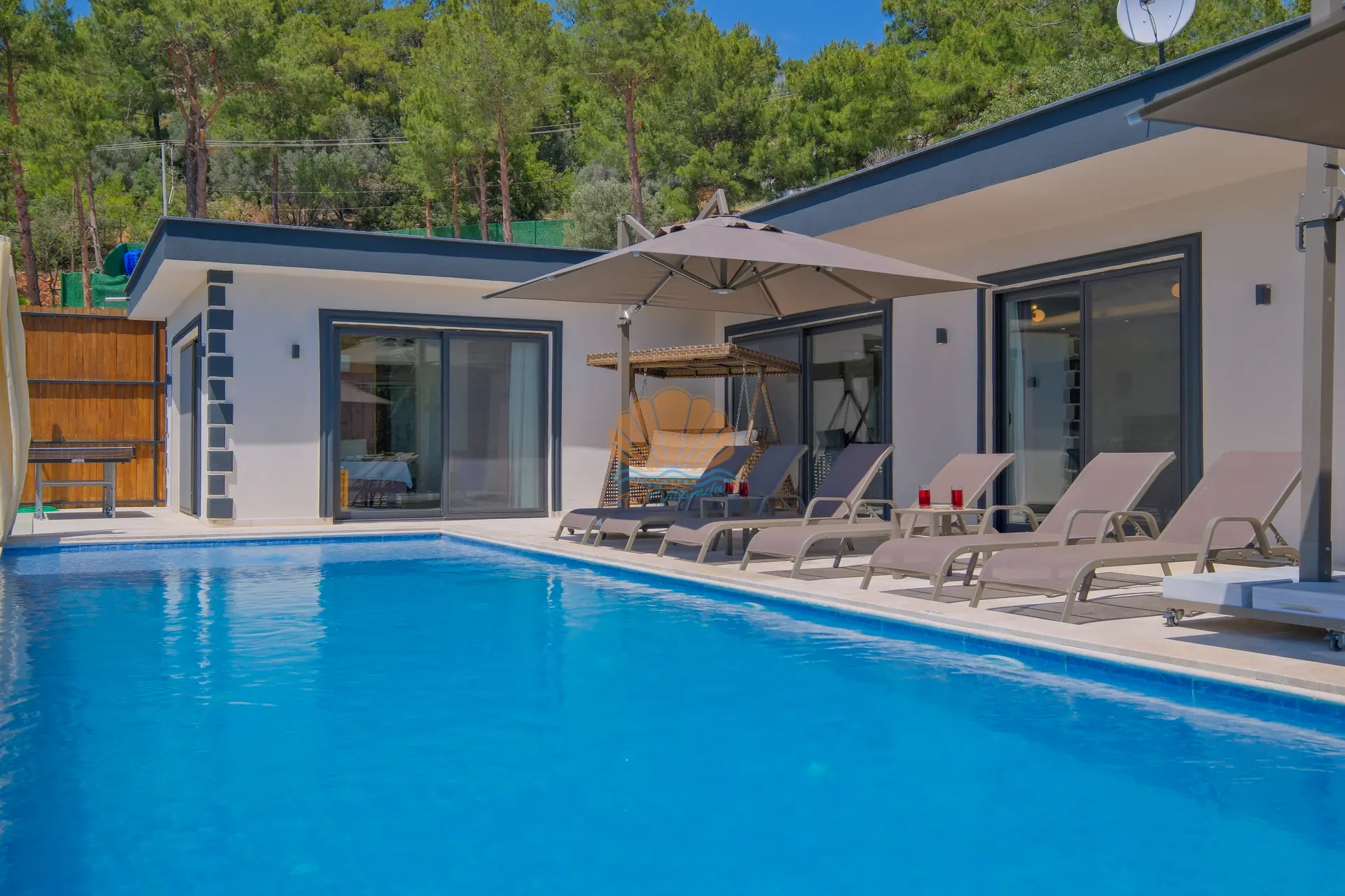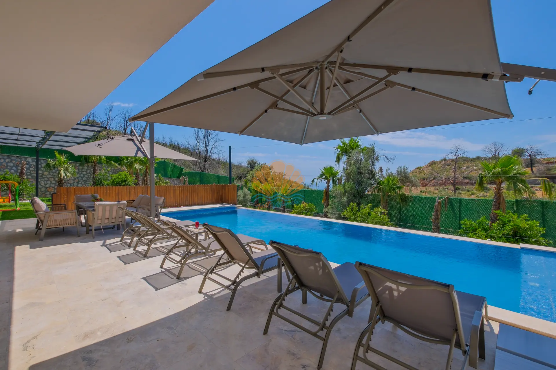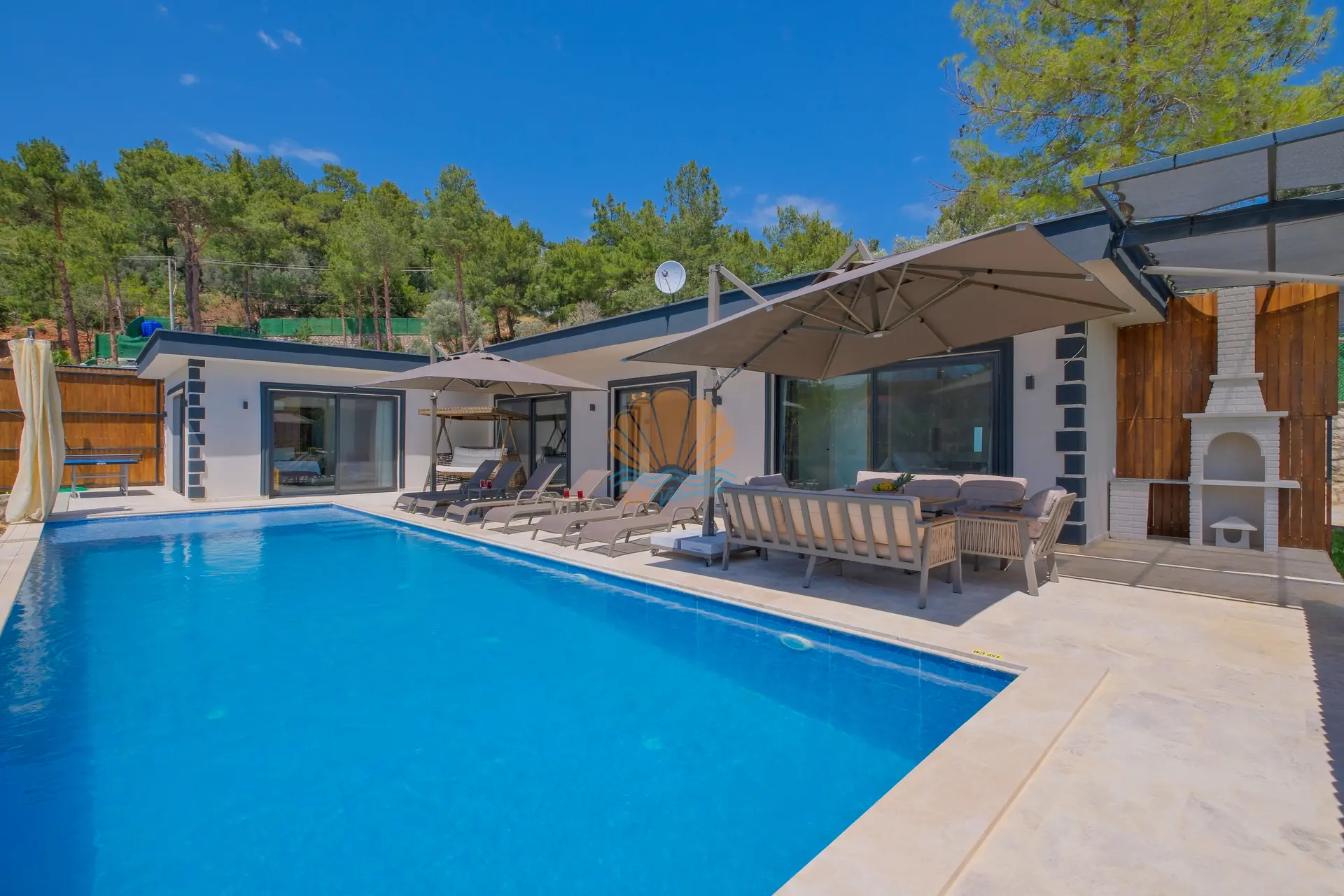 Villanın geniş ve korunaklı havuz terası, tatilin en keyifli anlarına ev sahipliği yapar. Özel yüzme havuzu çevresinde şezlonglar ve şemsiyeler yer alırken, bahçe oturma grubu sayesinde günün her saati keyifli vakit geçirebilirsiniz. Salıncak ve barbekü alanı, özellikle akşam saatlerinde sevdiklerinizle birlikte hoş anılar biriktirmenize olanak tanır.
