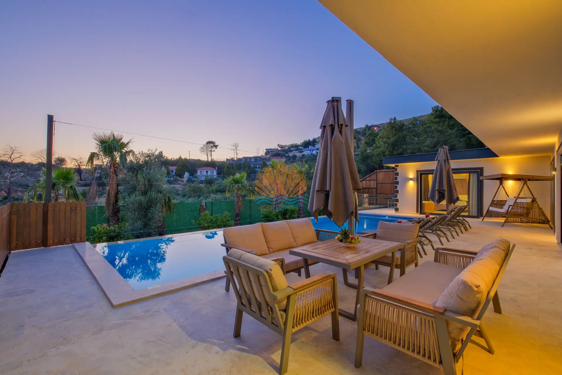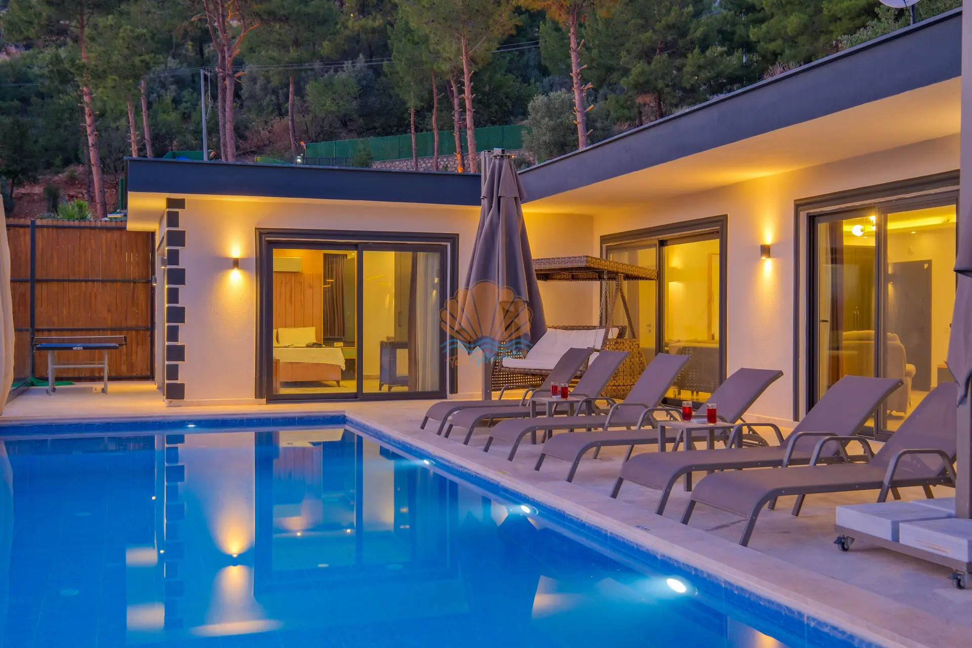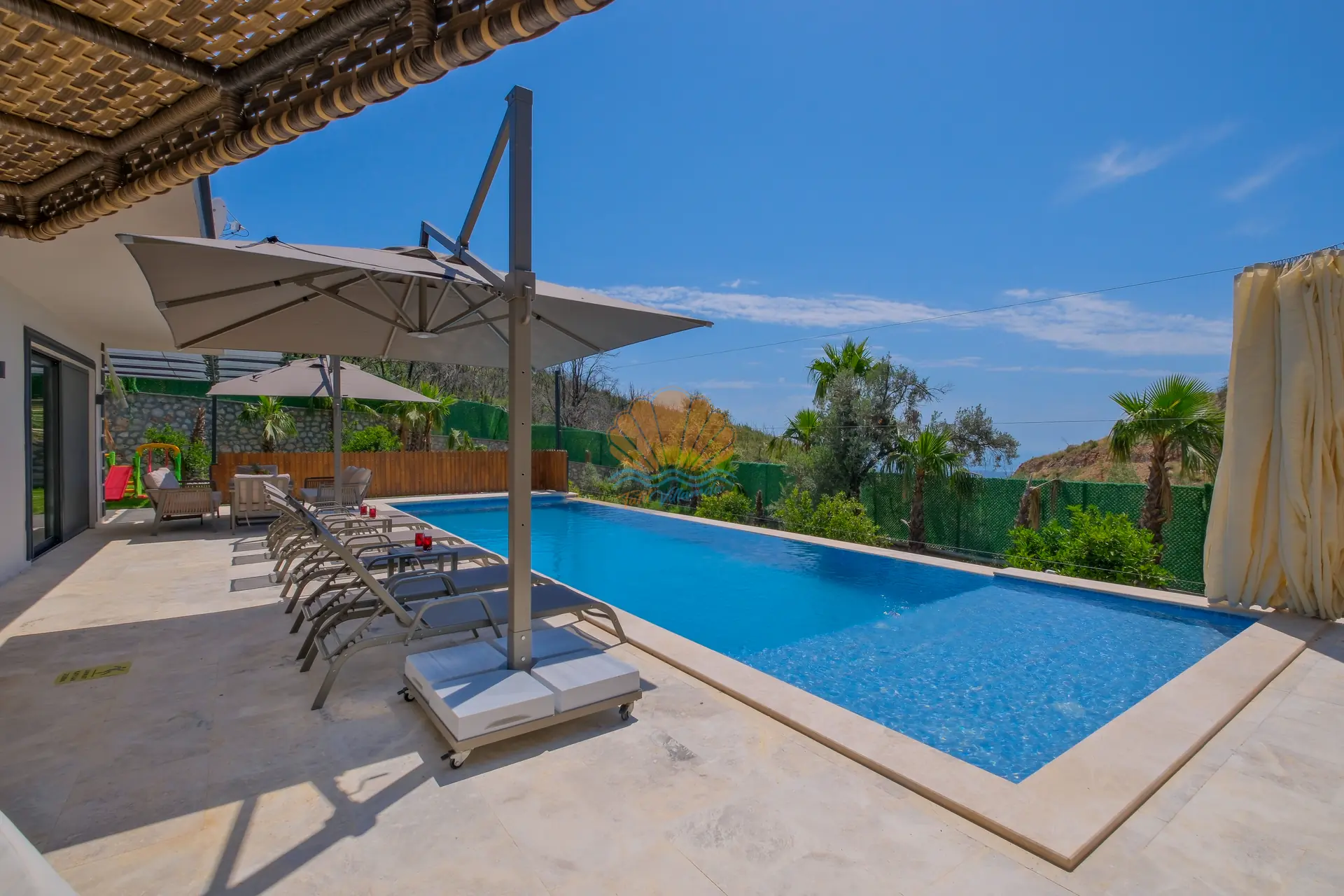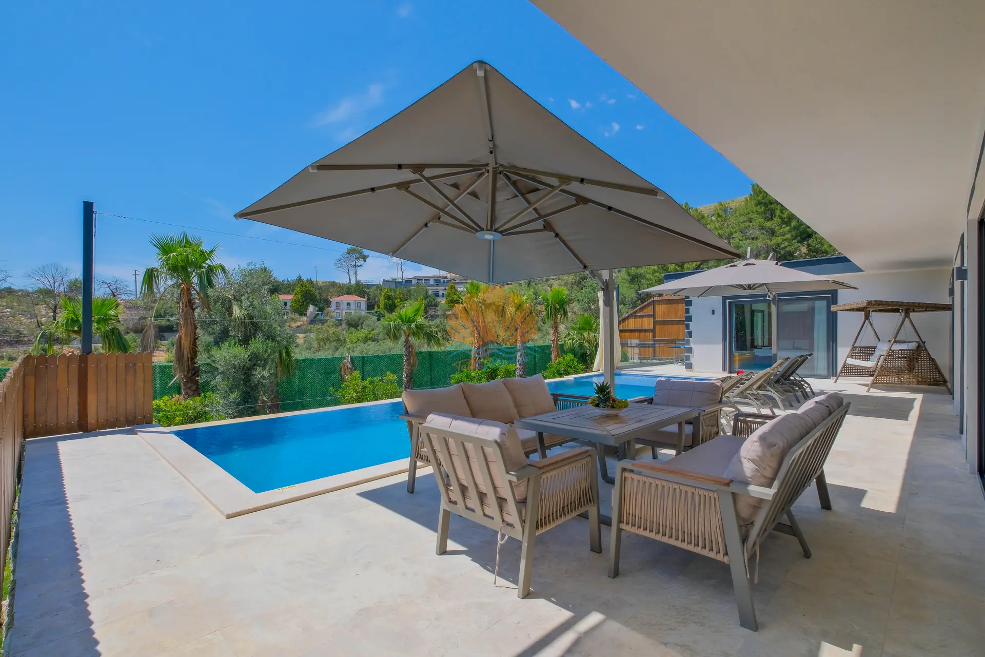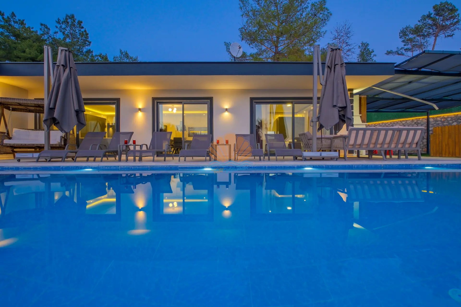 Villanın geniş ve korunaklı havuz terası, tatilin en keyifli anlarına ev sahipliği yapar. Özel yüzme havuzu çevresinde şezlonglar ve şemsiyeler yer alırken, bahçe oturma grubu sayesinde günün her saati keyifli vakit geçirebilirsiniz. Salıncak ve barbekü alanı, özellikle akşam saatlerinde sevdiklerinizle birlikte hoş anılar biriktirmenize olanak tanır.
