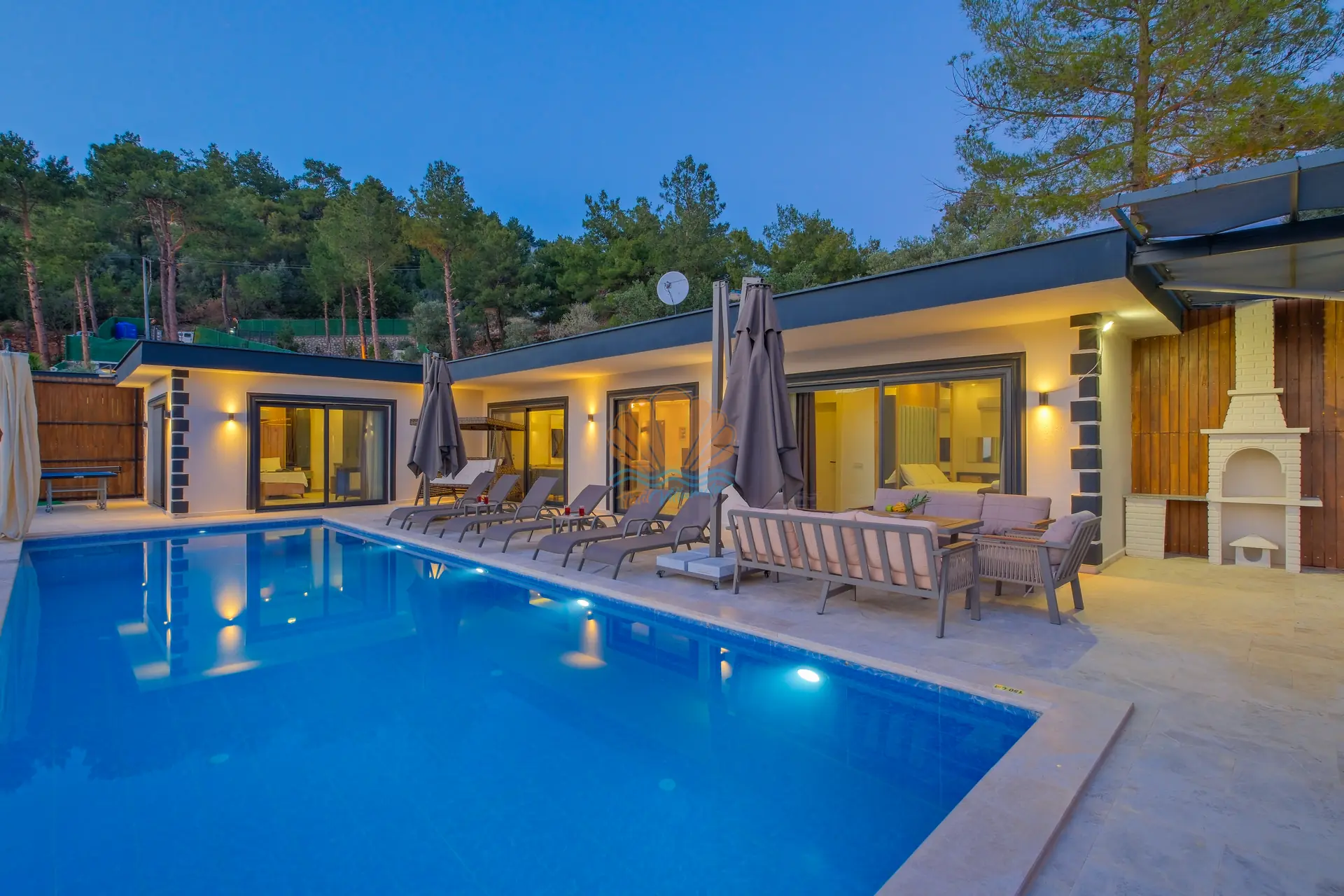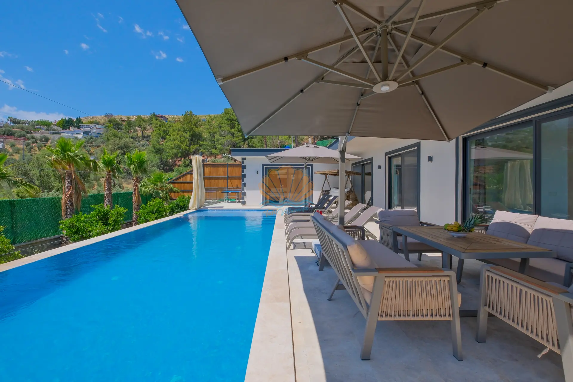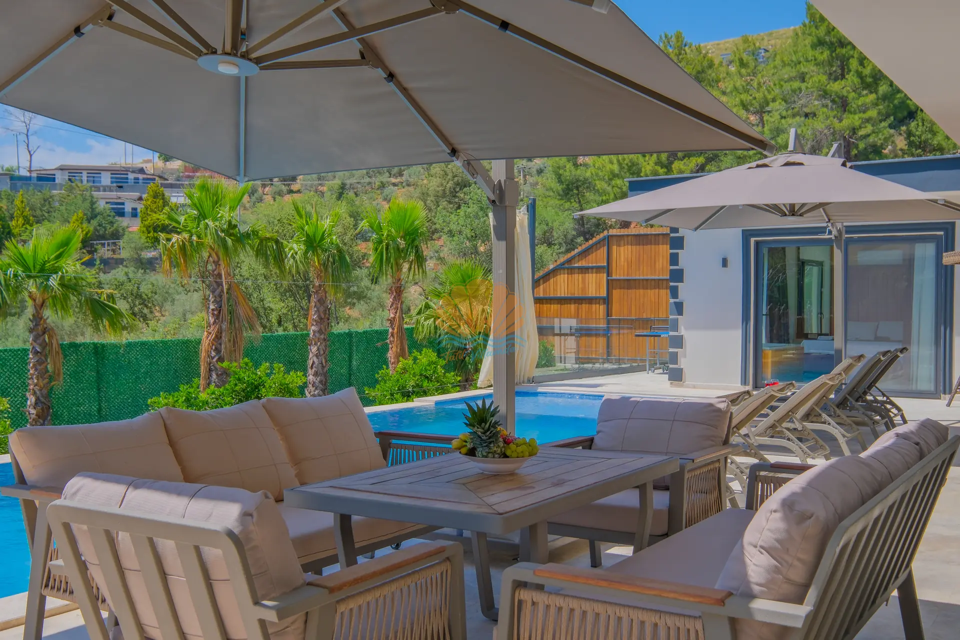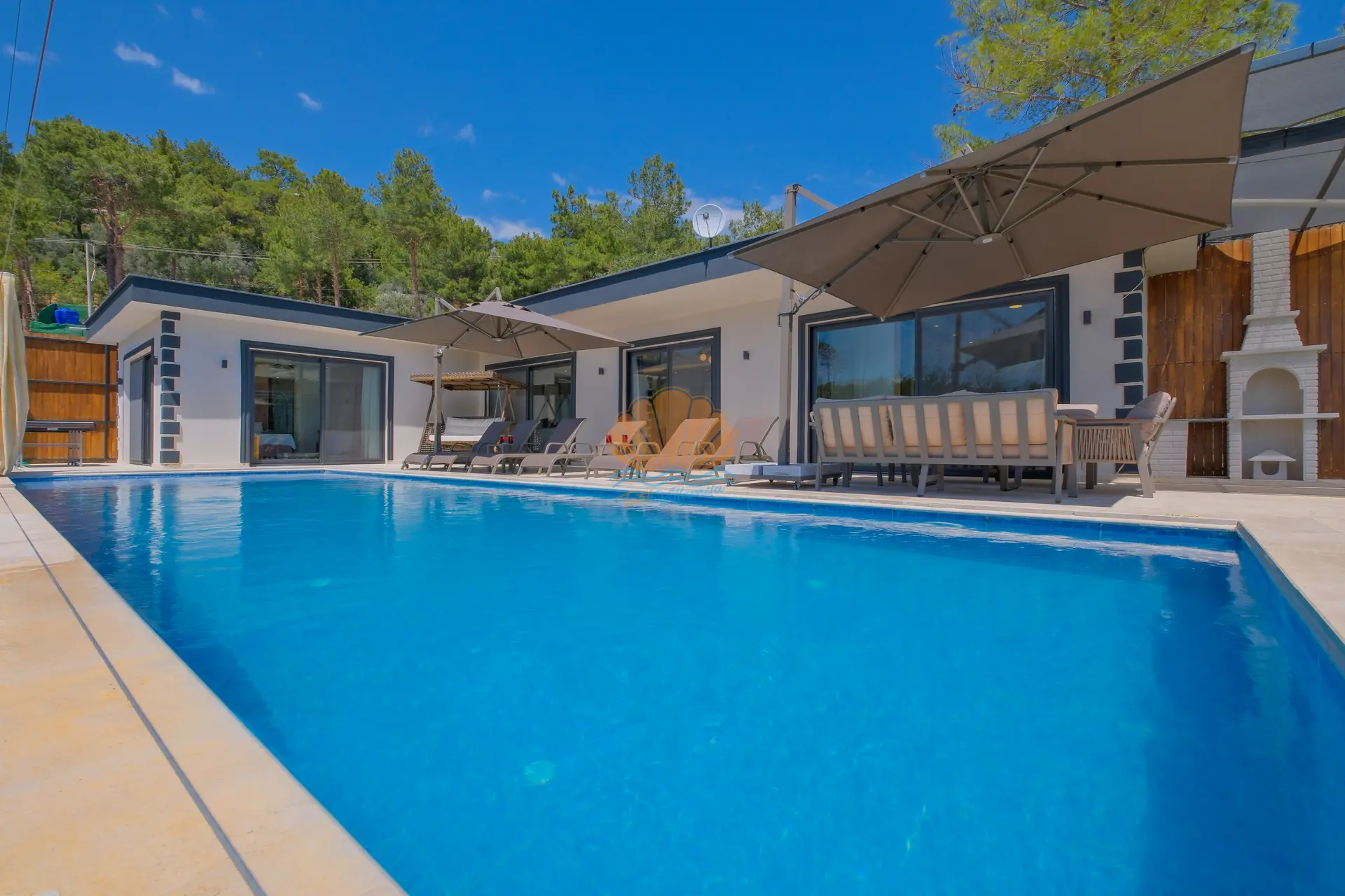 Villanın geniş ve korunaklı havuz terası, tatilin en keyifli anlarına ev sahipliği yapar. Özel yüzme havuzu çevresinde şezlonglar ve şemsiyeler yer alırken, bahçe oturma grubu sayesinde günün her saati keyifli vakit geçirebilirsiniz. Salıncak ve barbekü alanı, özellikle akşam saatlerinde sevdiklerinizle birlikte hoş anılar biriktirmenize olanak tanır.