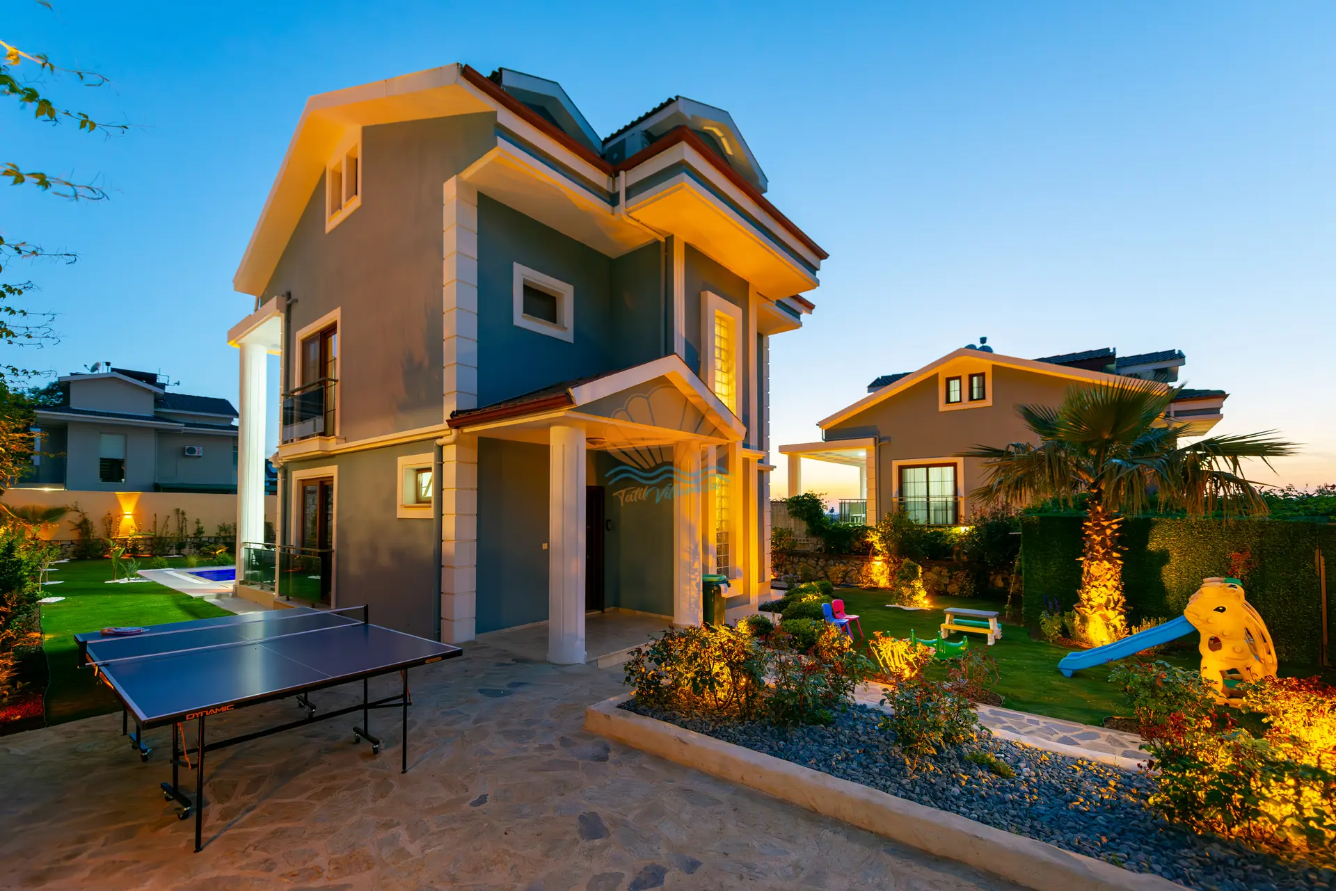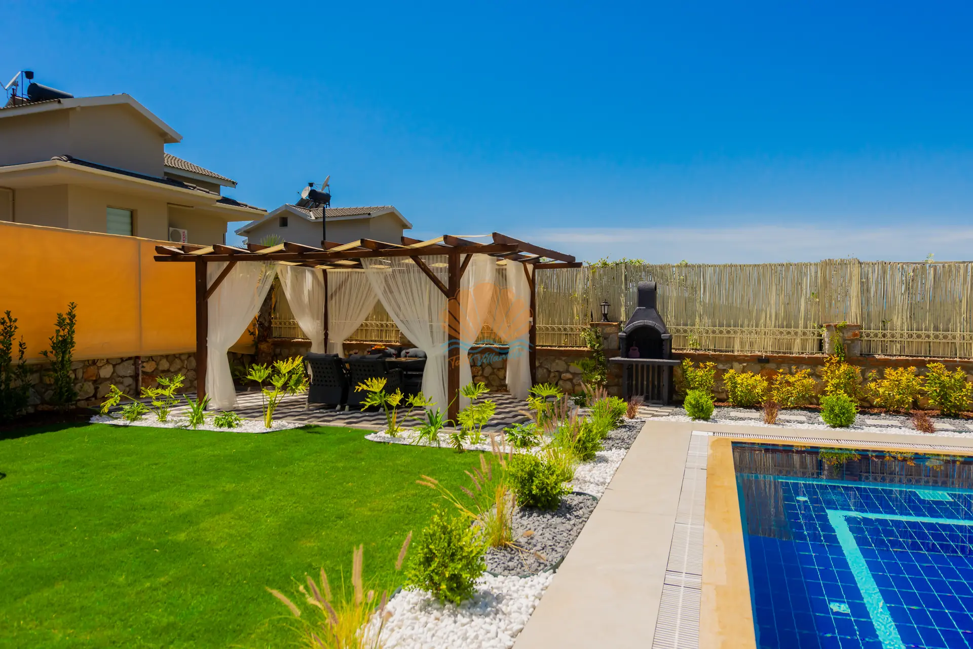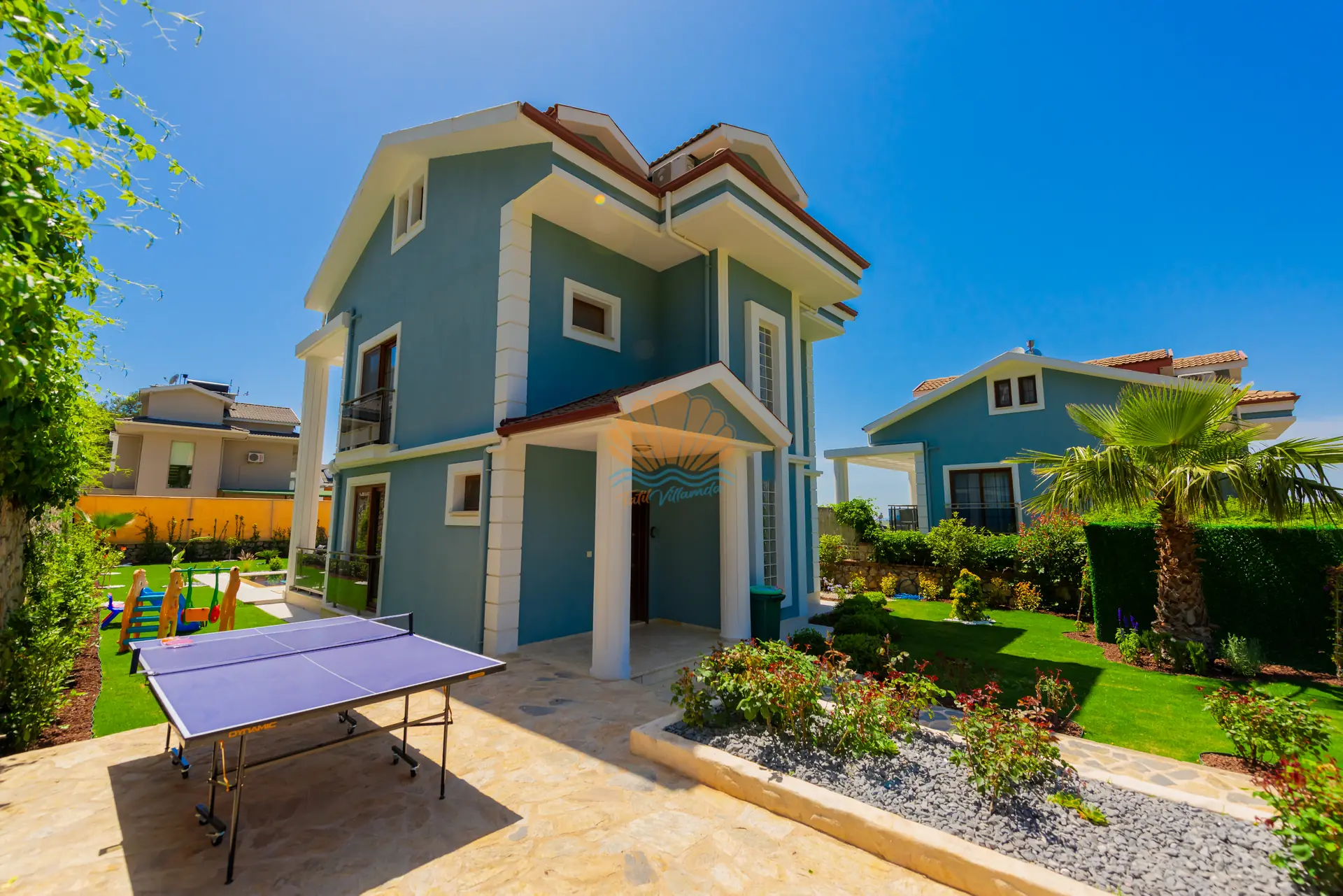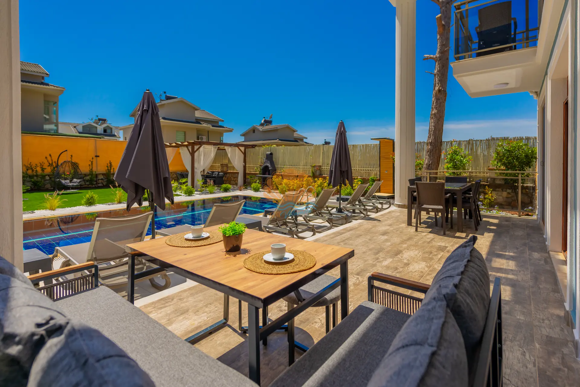 Villanın en dikkat çeken özelliklerinden biri, tamamen size özel geniş yüzme havuzudur. Havuz başında konforlu şezlonglar, şemsiye, bahçe oturma grubu ve keyifli akşam yemekleri için masa takımı yer almaktadır. Ayrıca çardak alanı, günün her saatinde dinlenebileceğiniz gölgelik bir ortam sunar. Barbekü alanı sayesinde sevdiklerinizle birlikte lezzetli mangal keyfi yapabilirsiniz. Geniş ve düzenli bahçesi sadece yetişkinler için değil, çocuklar için de eğlenceli bir alan sunar. Bahçede yer alan masa tenisi ile keyifli vakit geçirebilir, mini çocuk oyun parkı sayesinde çocuklarınızın güvenle eğlenmesini sağlayabilirsiniz.