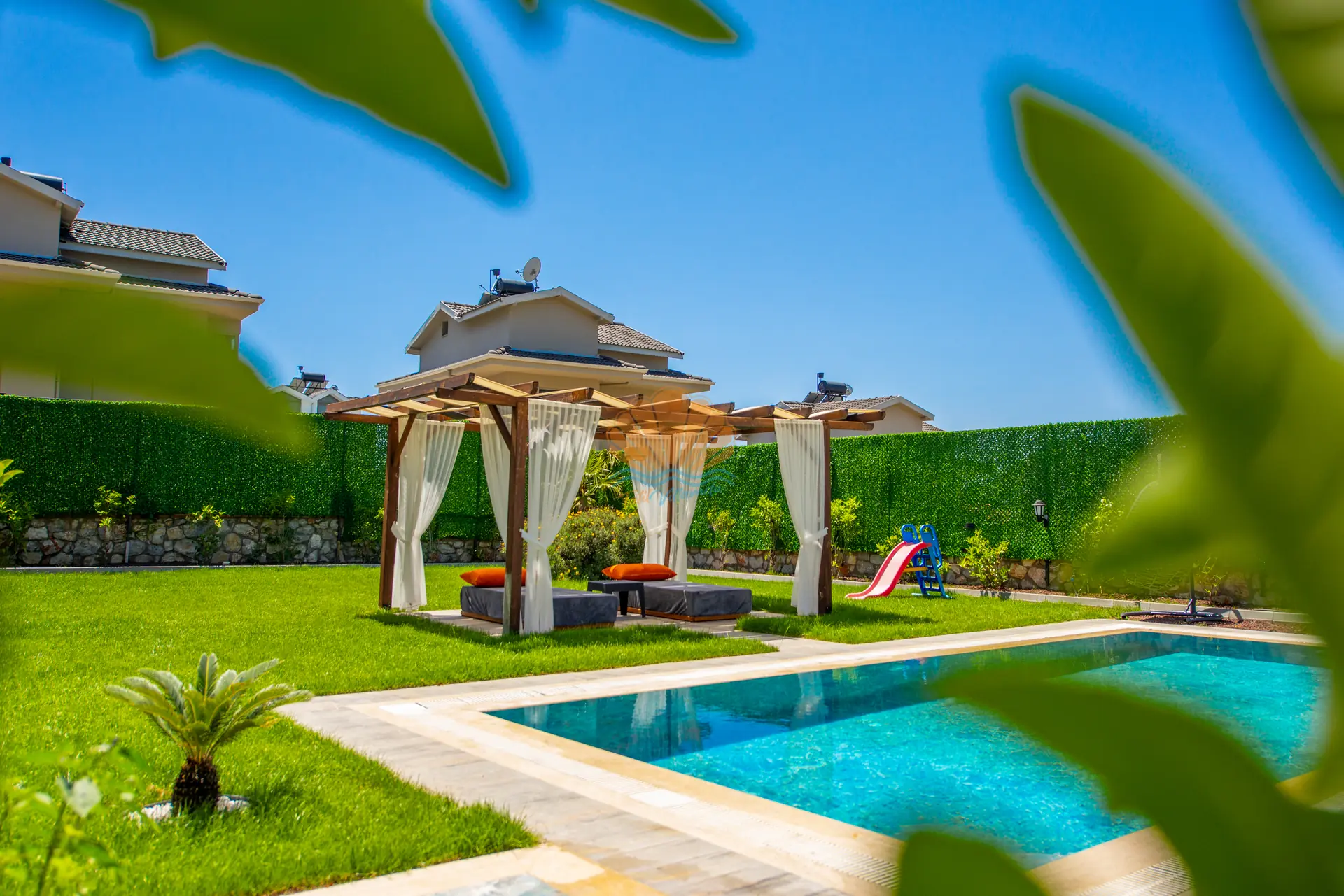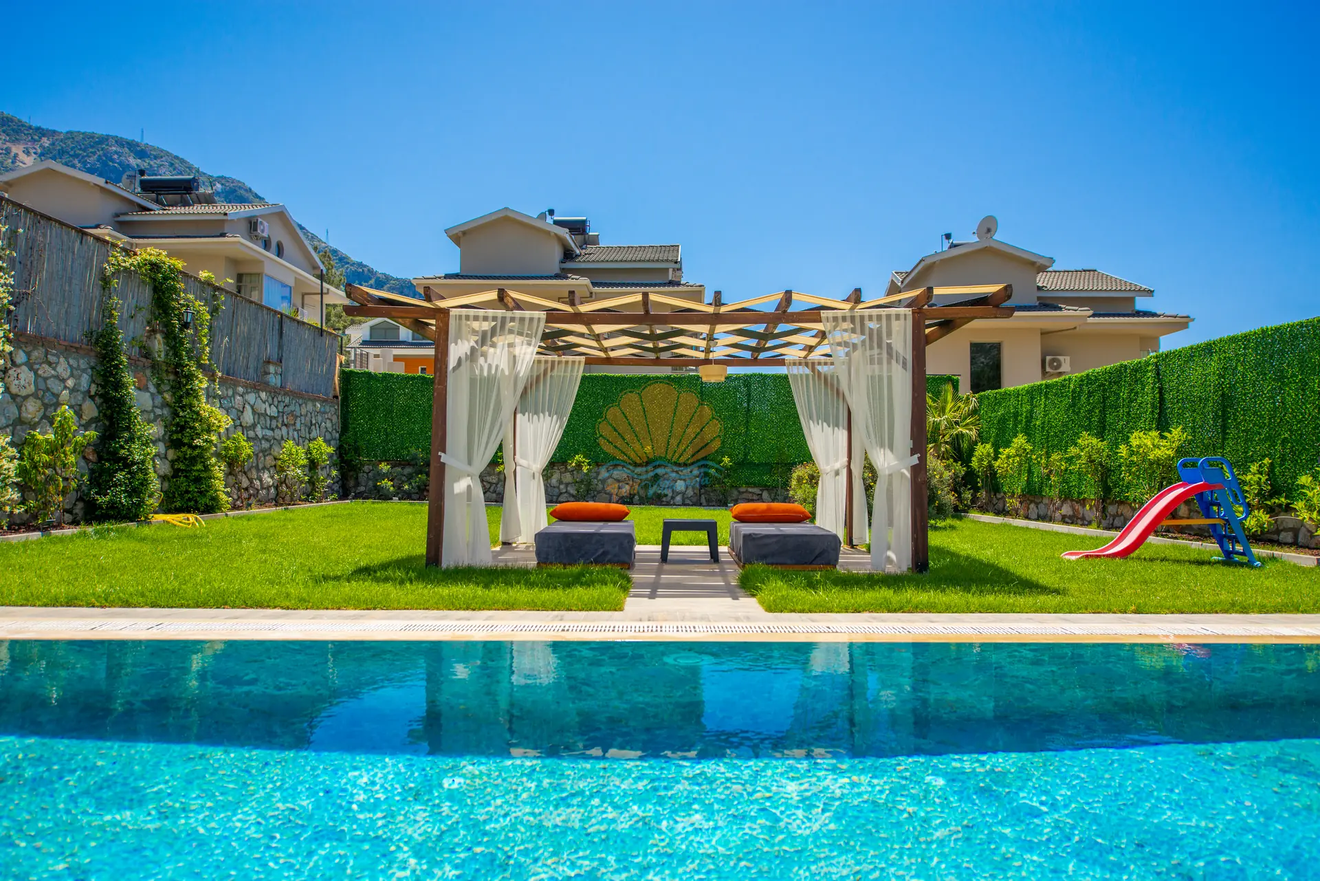 Villanın dış alanı, tatilin en keyifli anlarını geçirebileceğiniz şekilde özenle tasarlanmıştır. Geniş yüzme havuzu etrafında yer alan şezlonglar ve şemsiye ile güneşin tadını çıkarabilir, salıncakta dinlenerek doğanın huzurunu hissedebilirsiniz. Bahçede bulunan barbekü alanı, masa takımı ve çardak sayesinde sevdiklerinizle keyifli akşam yemekleri organize edebilirsiniz. Ayrıca çocuklu aileler için düşünülmüş mini kaydırak, küçük misafirlerin de eğlenceli vakit geçirmesine olanak tanır.